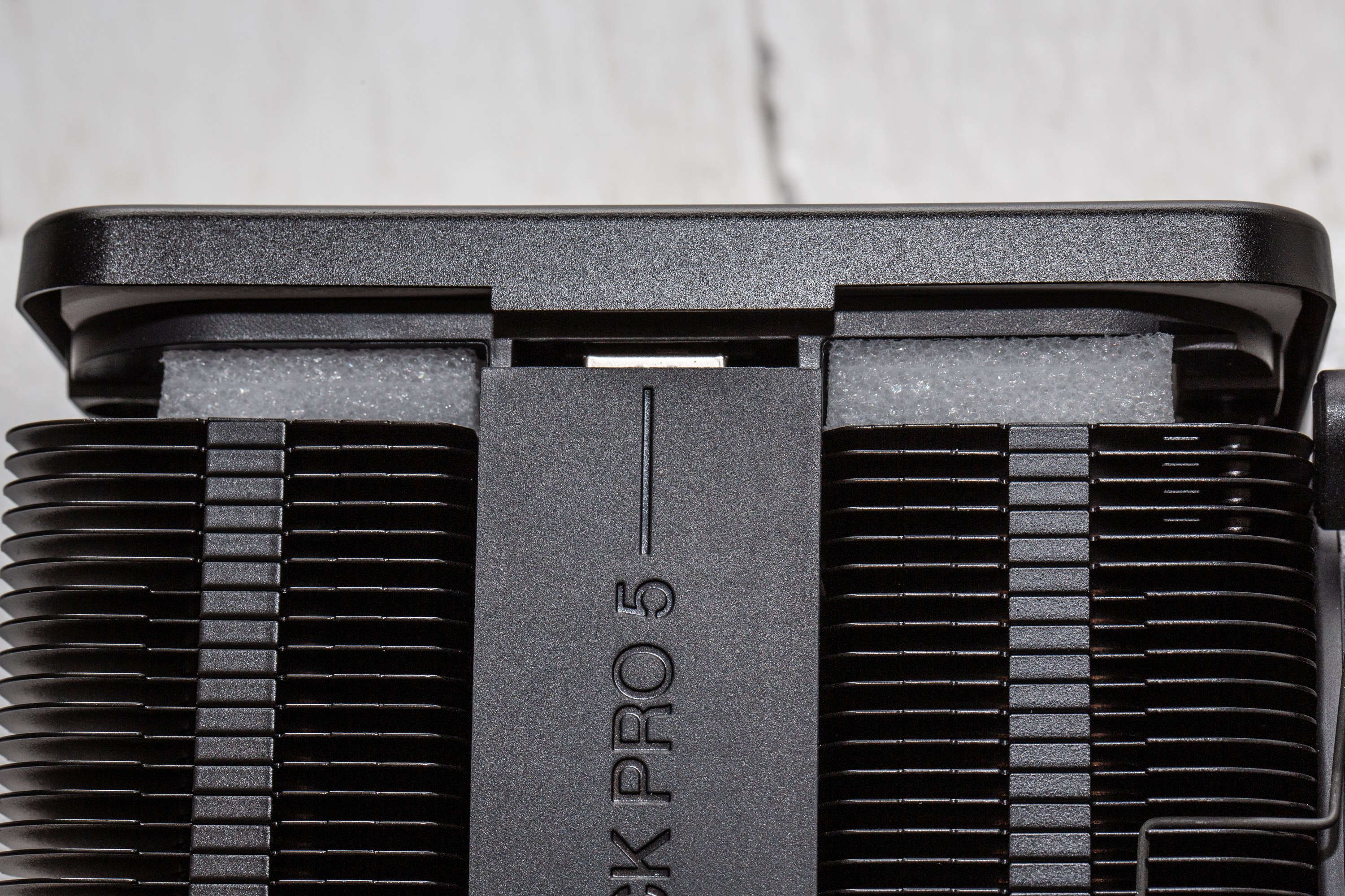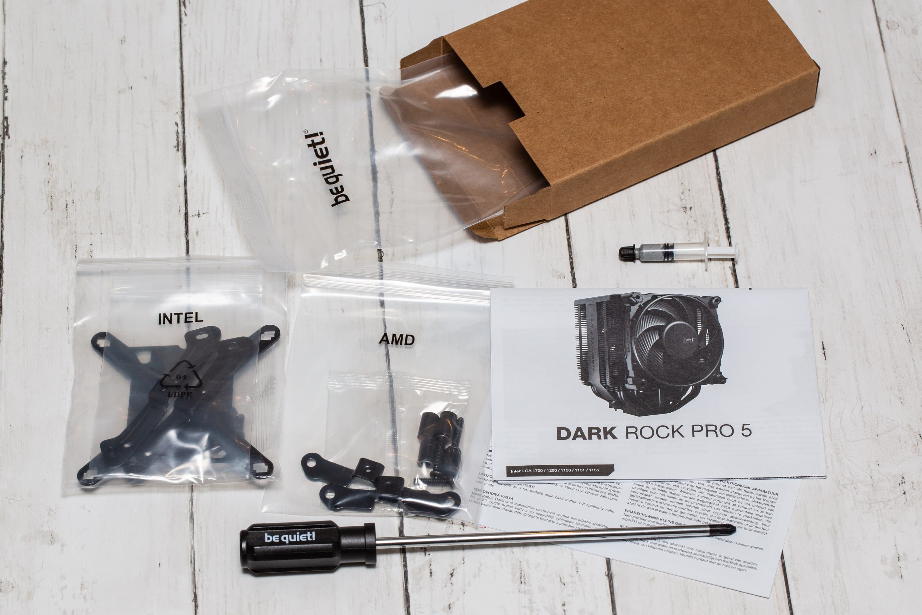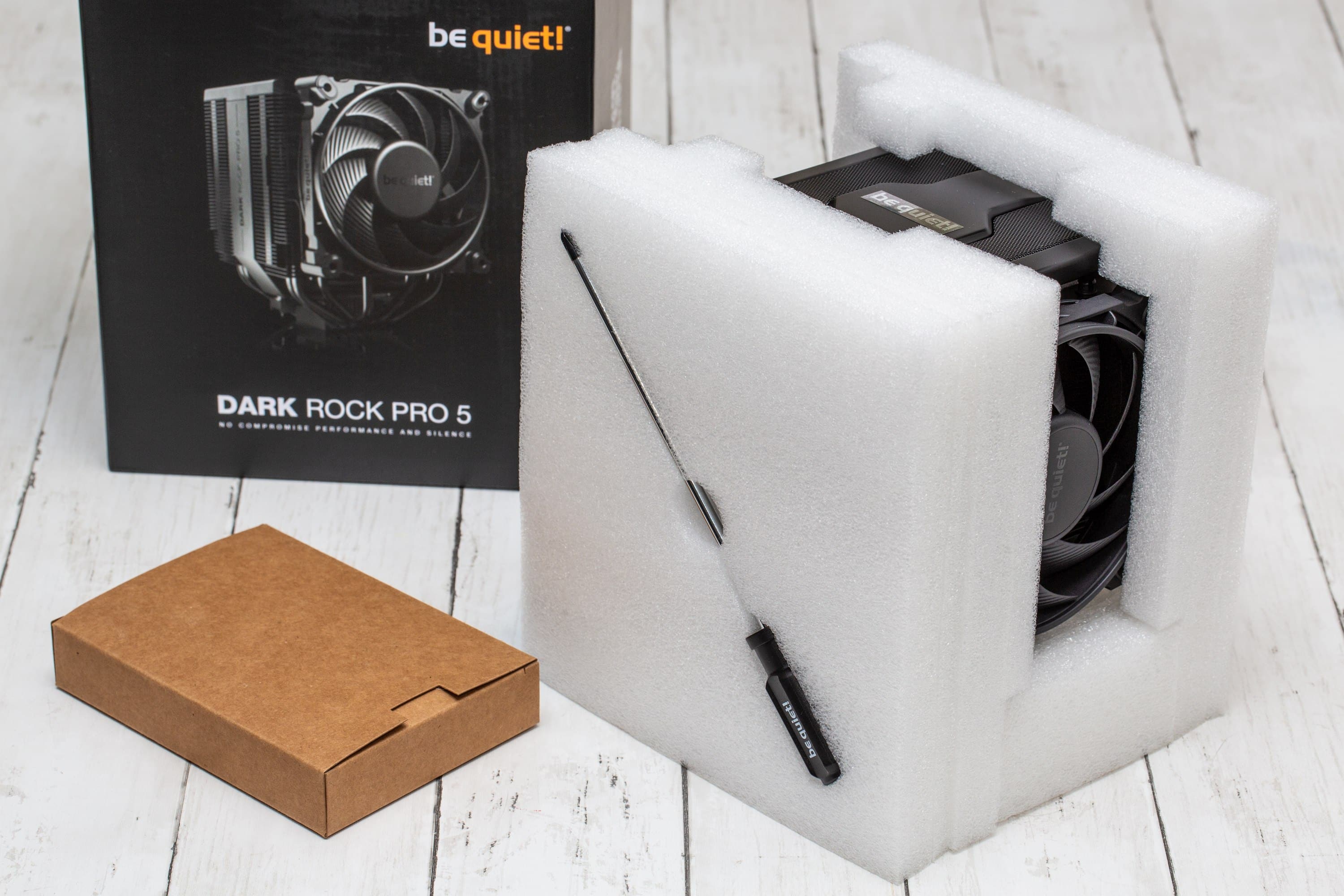 Bei der Verpackung ist sich be quiet! treu geblieben – die Schachtel ist schwarz und klar, ohne überflüssige Werbeslogans. In der Schachtel des be quiet! Dark Rock Pro 5 findet sich einerseits natürlich der Kühler selbst, der von einem weichen Schaumstoff gehalten wird. Andererseits ist auch das notwendige Montagematerial vorhanden, sowie eine übersichtliche Anleitung, eine sehr kleine Tube Wärmeleitpaste und der kultige be-quiet!-Schraubendreher, welcher quer mit in den Schaumstoff gesteckt ist. Aber nur nur um den Kühler findet sich Schaumstoff, sondern auch zwischen den Einzelteile des Kühlers finden sich weitere Teile. Unter der magnetischen Abdeckung ist ein etwas dichterer Streifen und unter der Halterung mit dem Lüfter finden sich zwei Schaumstoffstreifen, die ebenfalls entfernt werden müssen. Last but not least ist der Schriftzug auf der Oberseite mit einer kräftigen Schutzfolie bedeckt, die relativ kräftig klebt.