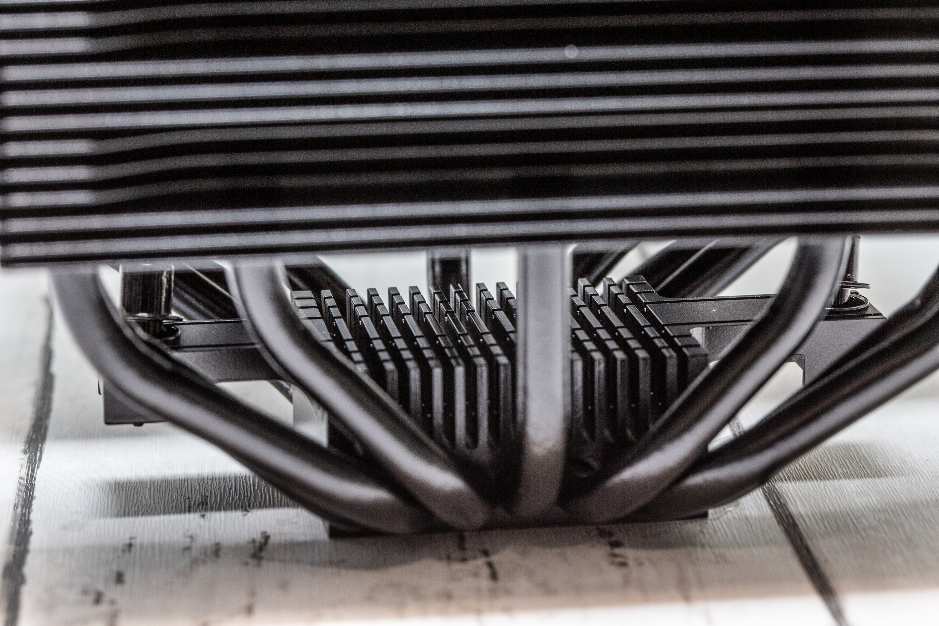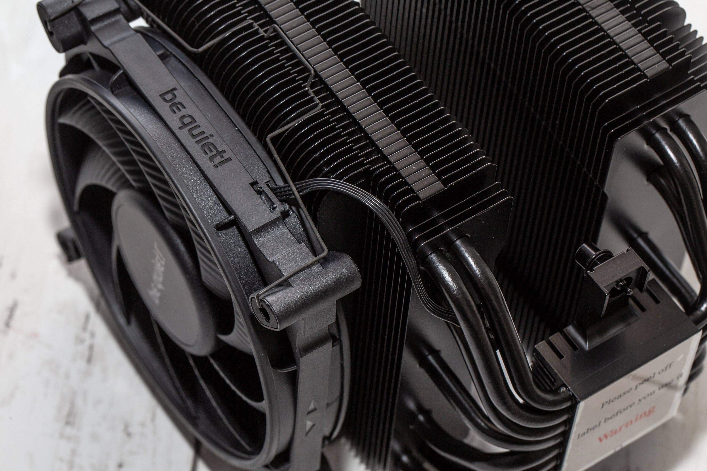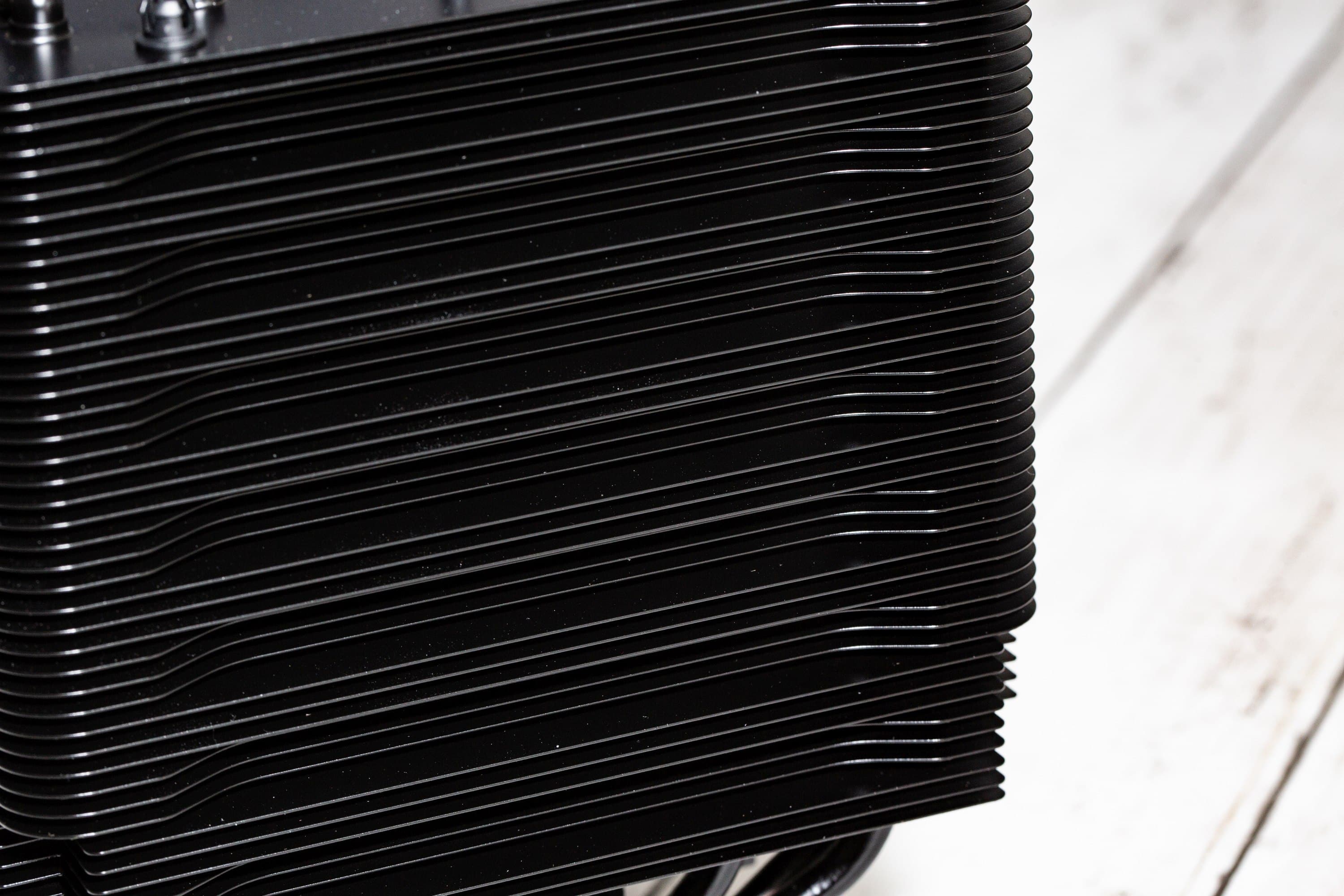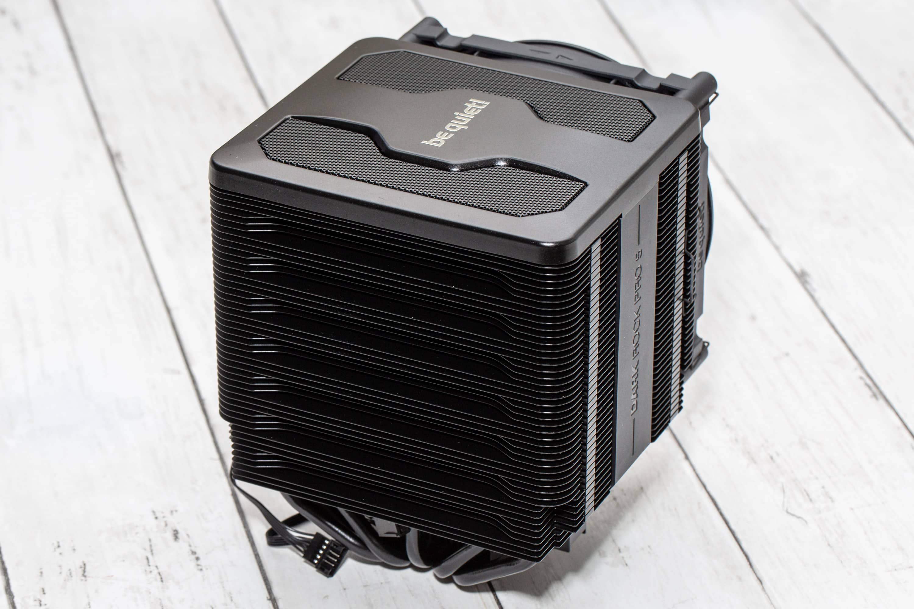 Im be quiet! Dark Rock Pro 5 Test zeigt sich die Verarbeitung als sehr hochwertig. Die Oberflächenbeschichtung ist sehr sauber durchgeführt und die Materialstärke ist ordentlich, sodass man trotz der größeren Krafteinwirkung, die man benötigt, um den mittleren Lüfter zu lösen, wenn dieser festgeclippt ist, die Lamellen dennoch nicht verbiegt. Dafür sind die Lamellen relativ weit auseinander und es sind nicht so viele, wie bei manchen anderen Kühlern. Das weist auf eine hohe Luftdurchlässigkeit hin, was gut zu Luftstrom-Lüftern passt und weniger auf einen hohen statischen Druck angewiesen ist, obwohl die Lüfter aus der Serie der be quiet! Silent Wings 4 auch diesen durchaus bringen können. Die Kabel dieser Lüfter sind am be quiet! Dark Rock Pro 5 jedoch kurz ausgeführt, wie es für Prozessorkühler durchaus wünschenswert ist, um keinen zu großen Rest der Lüfterkabel verstecken zu müssen. Auf diese kurze Strecke wurde auch auf eine Ummantelung verzichtet.