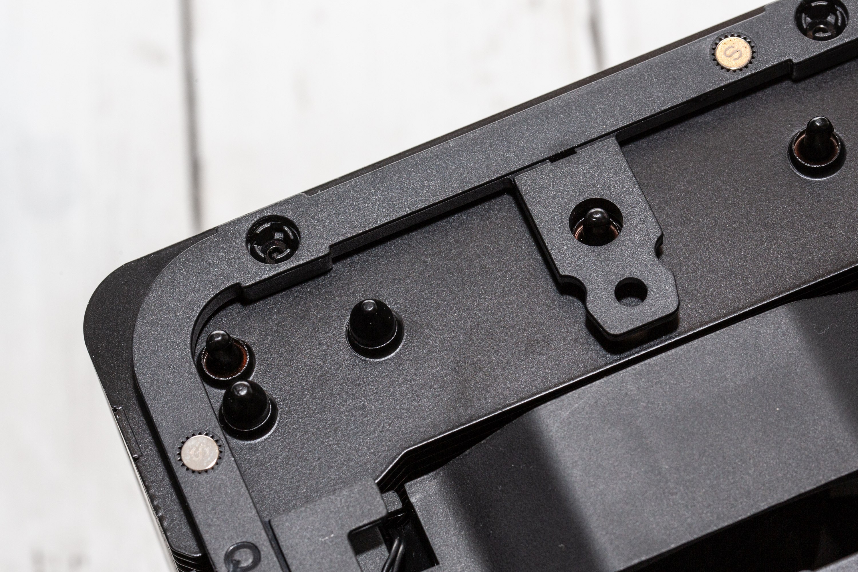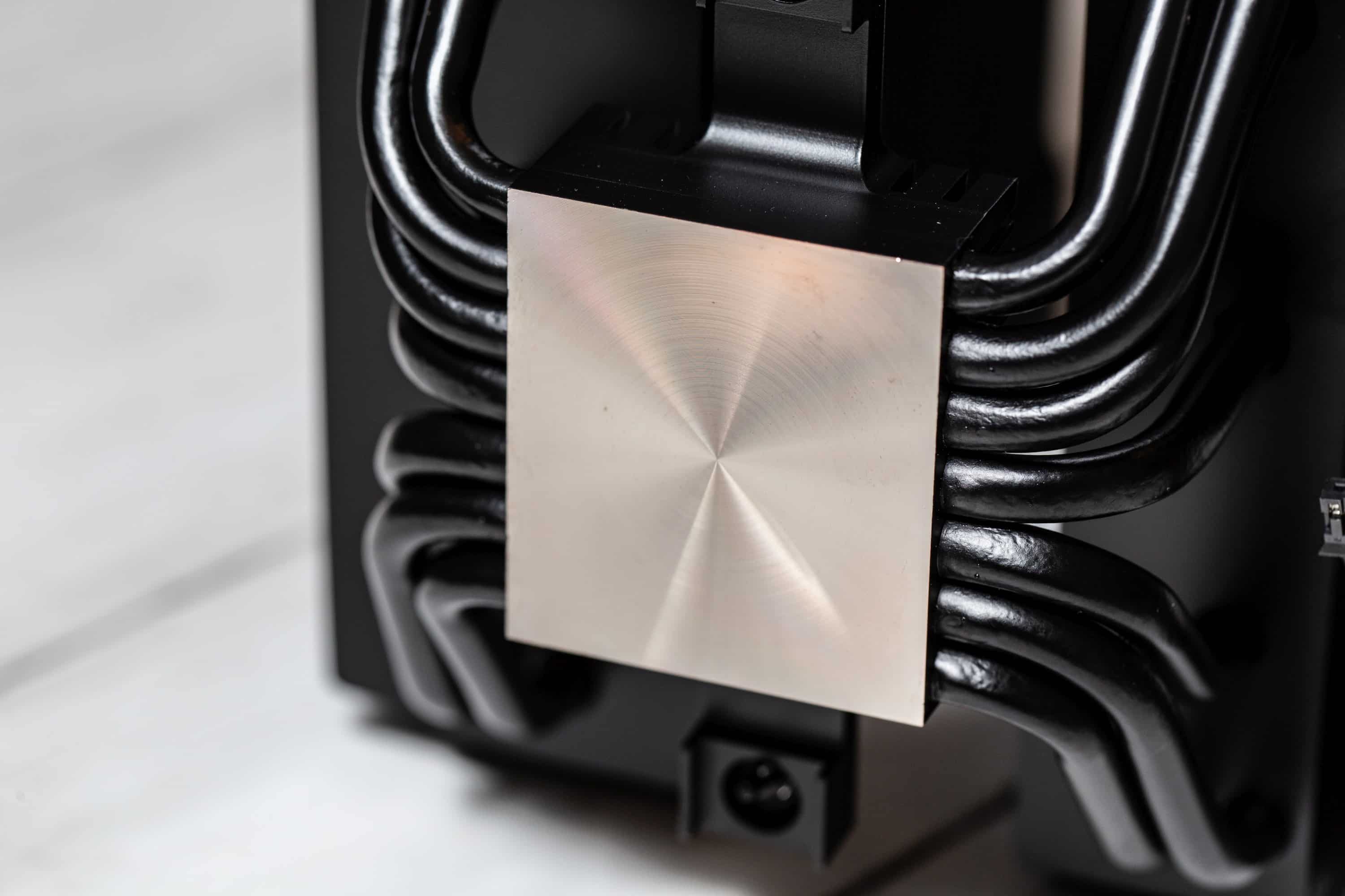 Auch die Kontaktfläche besteht aus vernickeltem Kupfer, macht einen guten Eindruck und verteilt die Wärme besser auf die Heatpipes als bei einem Heatpipe-Direktkontakt. Die Abdeckung wird magnetisch gehalten, fällt aber beim Aufsetzen leicht in die korrekte Position. Die Magneten sind zwar stark genug, um die Abdeckung sicher zu halten, aber klein genug, um die Abdeckung vom be quiet! Dark Rock Pro 5 noch immer leicht zu entfernen, um an den Schalter zu kommen, der mit dem mittleren Lüfter verbunden ist.
