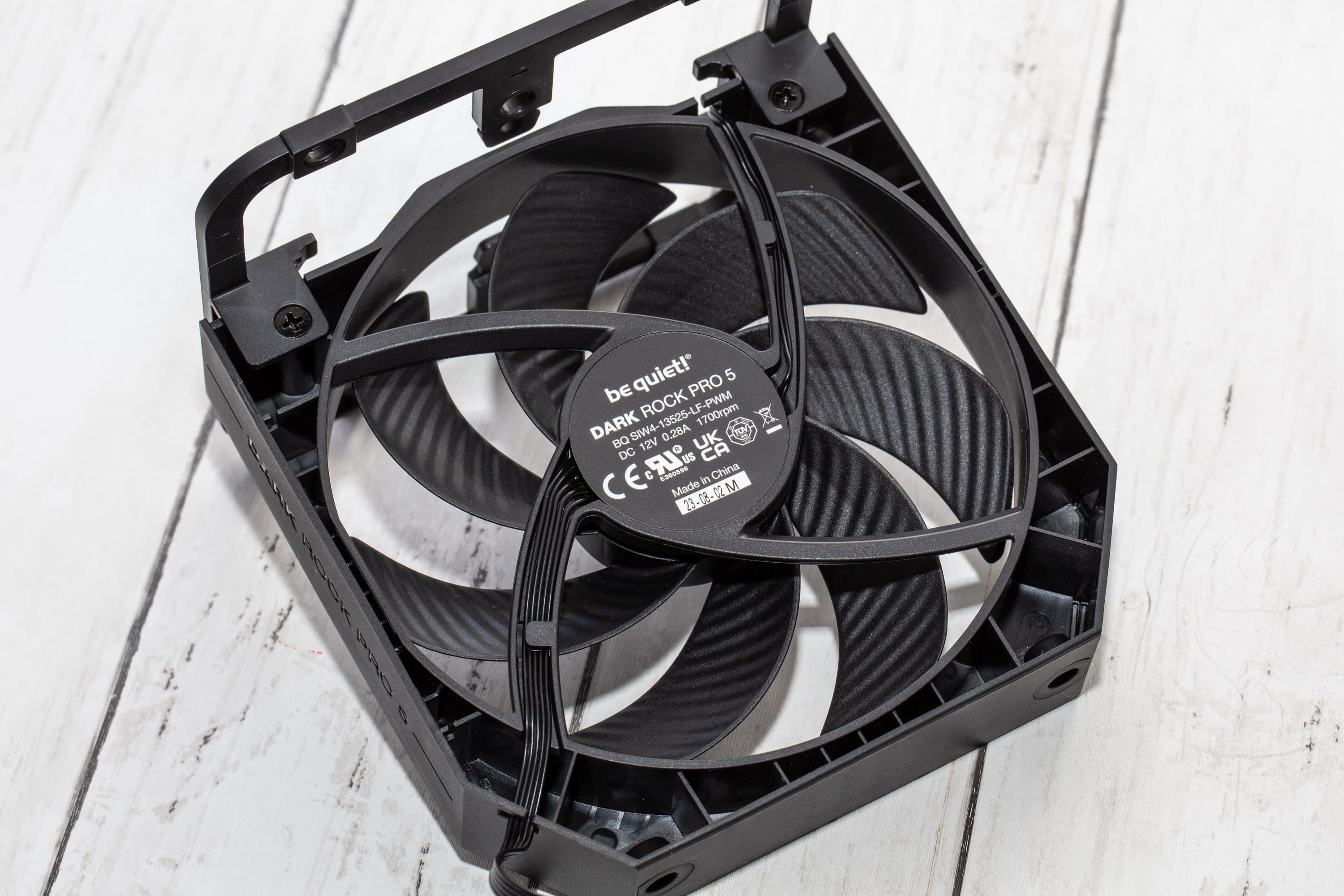 Problematisch sind die Lüfter. Der mittlere Lüfter ist mit 135 mm abseits jeglicher Standards und obwohl der Frontlüfter dem typischen 120-mm-Format entspricht, ist der Anschluss proprietär. Und beide Lüfter sind auch nicht mit „Silent Wings 4“ beschriftet, sondern mit „Dark Rock Pro 5“. Man kann also die Lüfter nicht frei wechseln. Einerseits ist das nicht so schlimm, denn die Lüfter sind absolute High-End-Lüfter von be quiet!, die neben einer hohen Leistung eine sehr hohe Langlebigkeit versprechen. Andererseits bleibt im Falle (wenn auch unwahrscheinlichen) Defekts außerhalb der Garantiezeit nur der Gang zum Ersatzteileshop von be quiet!.
