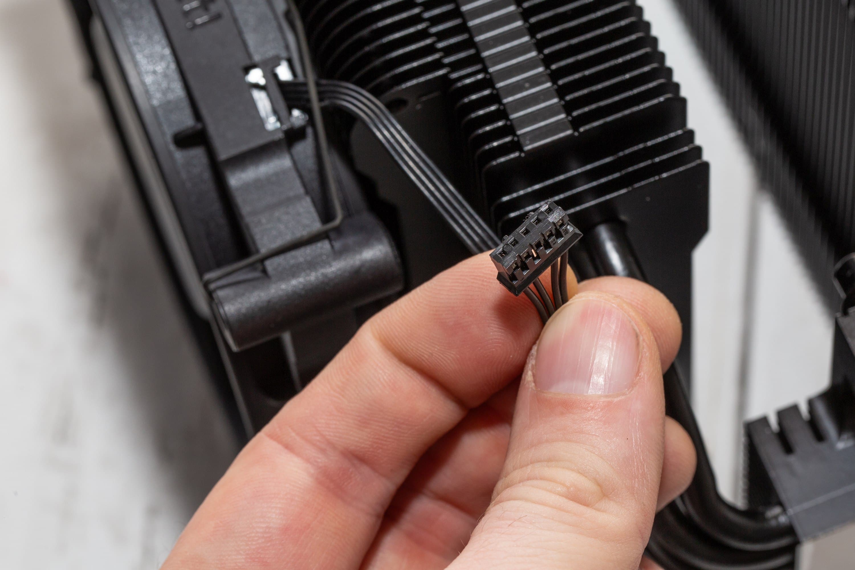 Nun muss der mittlere Lüfter eingesetzt werden. Die untere Fläche besitzt zwei Löcher, die für die Schraubenköpfe des Montagemechanismus sind, wodurch der Lüfter grade gehalten wird und nicht vibriert. Oben wird der Lüfterrahmen durch ein paar Clips mit der oberen Lamelle verbunden. Hier muss man mal recht fest drücken, aber dann sitzt der Lüfter gut fest. Nun muss man noch den Frontlüfter mit dem mittleren Lüfter verbinden, was je nach Arbeitsumgebung etwas fummelig ist. Nun wird einfach der PWM-Anschluss mit dem CPU-Header verbunden und das kleine Kabel kann aus dem Sichtfeld geschoben werden.