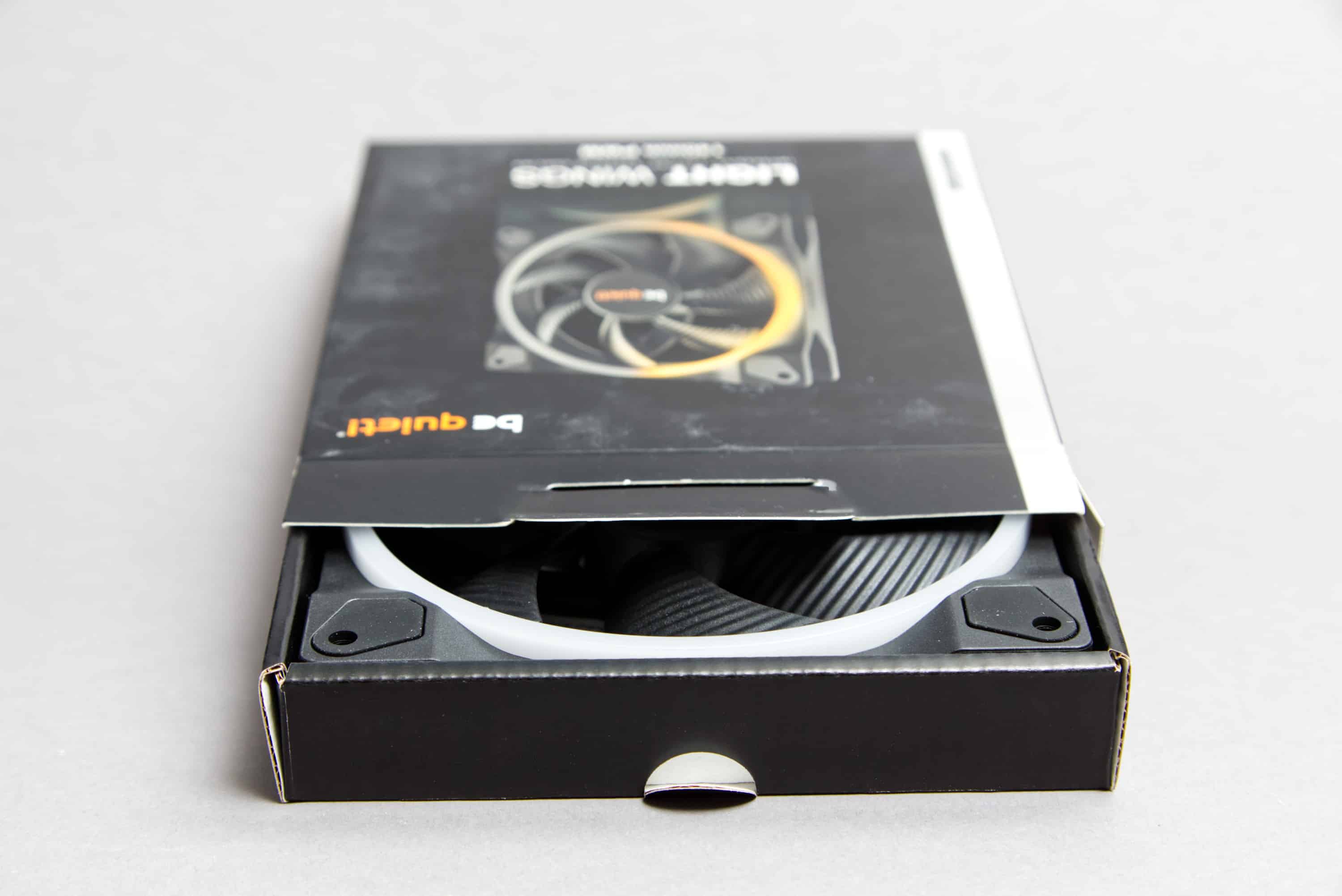 Die Verpackung der be quiet! Light Wings 140mm PWM ist sehr sauber gehalten. Die Verpackung ist also nicht mit Werbung zugekleistert, sondern auf der Vorderseite gibt es den Produktaufdruck und die Artikelbezeichnung. Auf der Rückseite finden sich die Spezifikationen zusammengefasst und außerdem der Link zur offiziellen Hersteller-Produktseite als QR-Code. Der Lüfter selbst steckt in einer „Schublade“, die eine weitere Schutzschicht bietet für einen sicheren Versand. Insgesamt ist die Verpackung jedoch sehr kompakt gehalten. So ist das Kabel eng zusammengeschnürt und abgesehen von den typischen Lüfterschrauben wird nichts mitgeliefert.