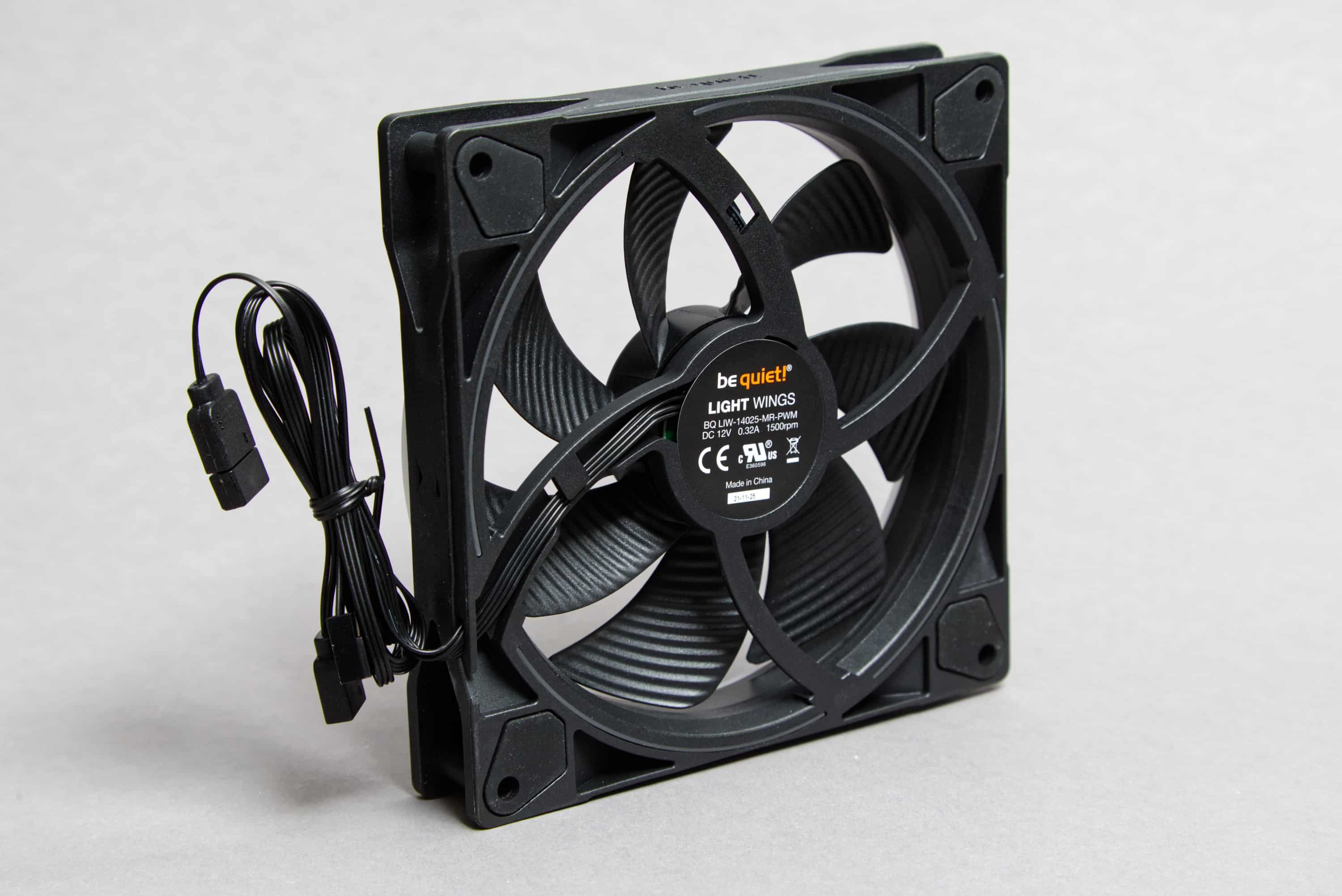 Die be quiet! Light Wings 140mm zeigen sich beim Test der Verarbeitung als sehr solide Lüfter. Die Lüfterblätter sind typisch für be quiet! im schwarzen Wellenmuster gehalten und sind rundum sauber verarbeitet. Auch der Rahmen ist fest und verwindungssteif. Durch den RGB-Streifen im Rahmen ist dieser allerdings auch etwas breiter (und damit sehr verwindungssteif!) und damit sind die Lüfterblätter etwas kleiner als bei manch anderen 140-mm-Lüftern.