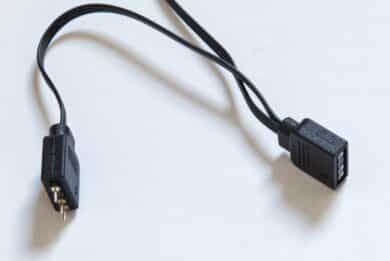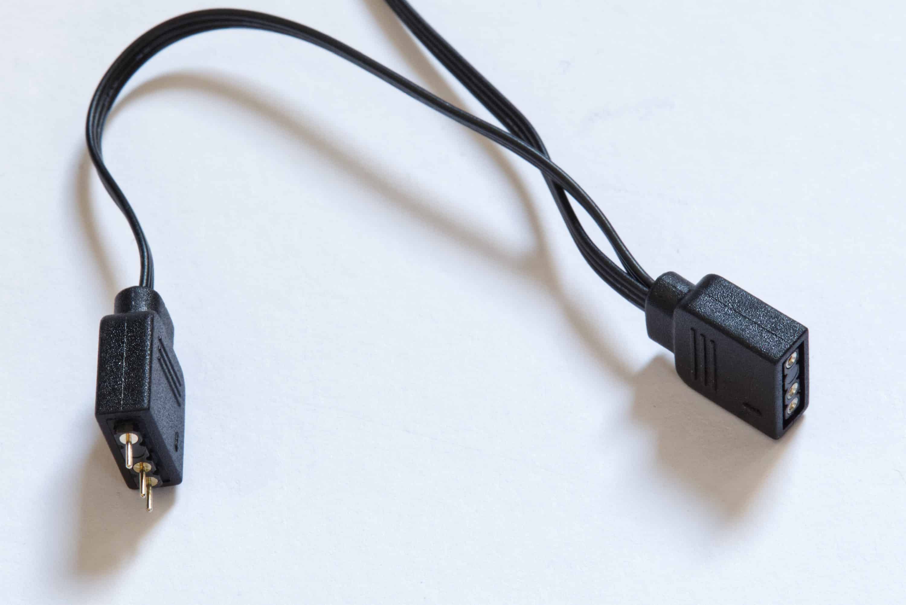 Angenehm ist, dass das RGB-Kabel einen Standard-ARGB-Anschluss besitzt, wodurch der Lüfter eine große Kompatibilität zu RGB-Controllern bietet und keine proprietären Geräte oder besondere Software nötig sind. Apropos Kabel: Diese sind nicht ummantelt, was aber durchaus sinnvoll ist. Denn durch die schmale Ausführung können die beiden Kabel relativ unauffällig verlegt werden. Die RGB-Stecker sind außerdem sowohl als Male als auch als Female vorhanden. Damit kann man mehrere der RGB-Lüfter in eine Reihe schalten, ohne dabei mehrere Header auf dem Mainboard oder dem Controller zu benötigen.