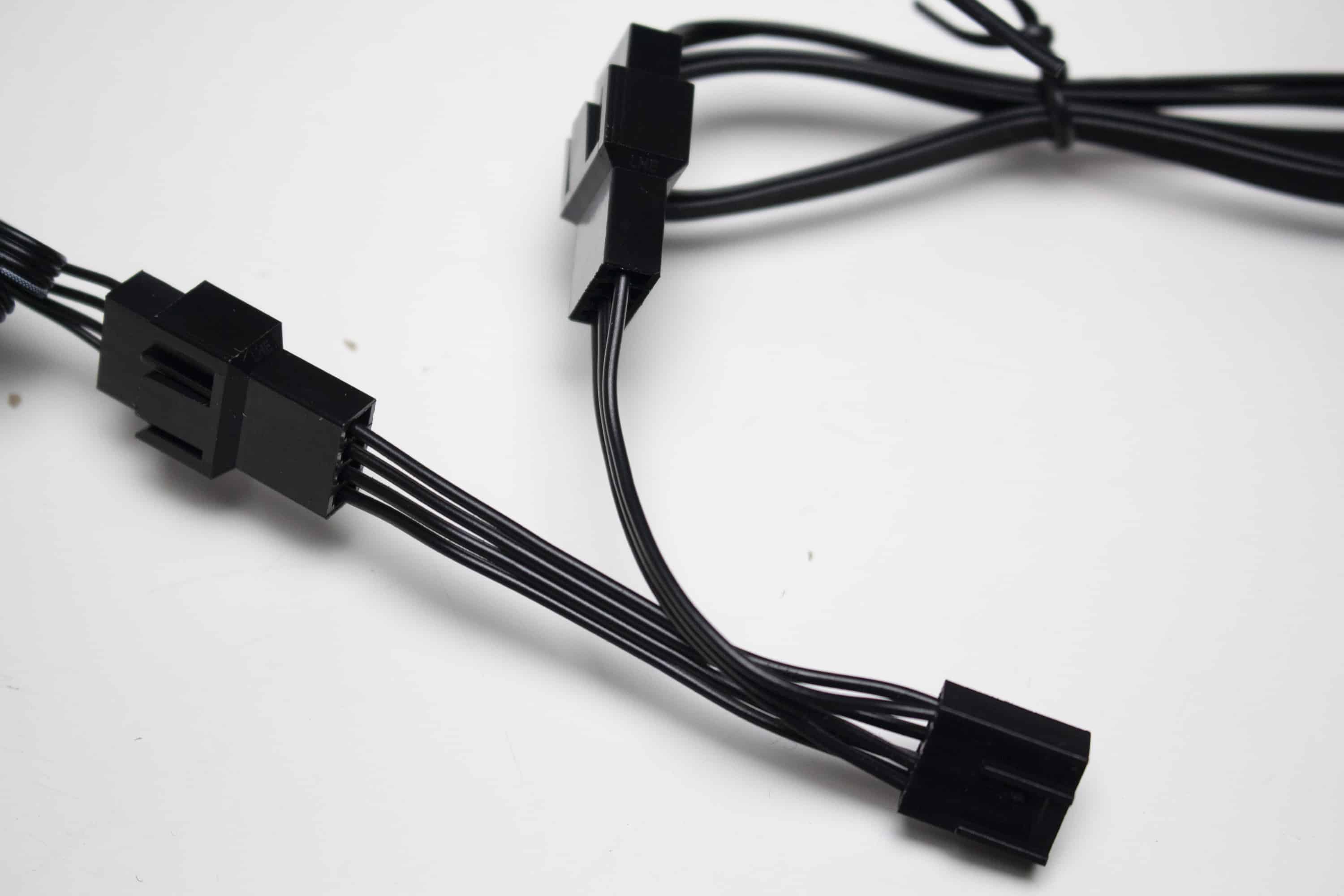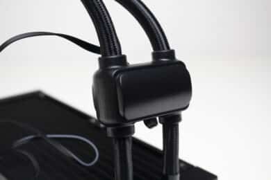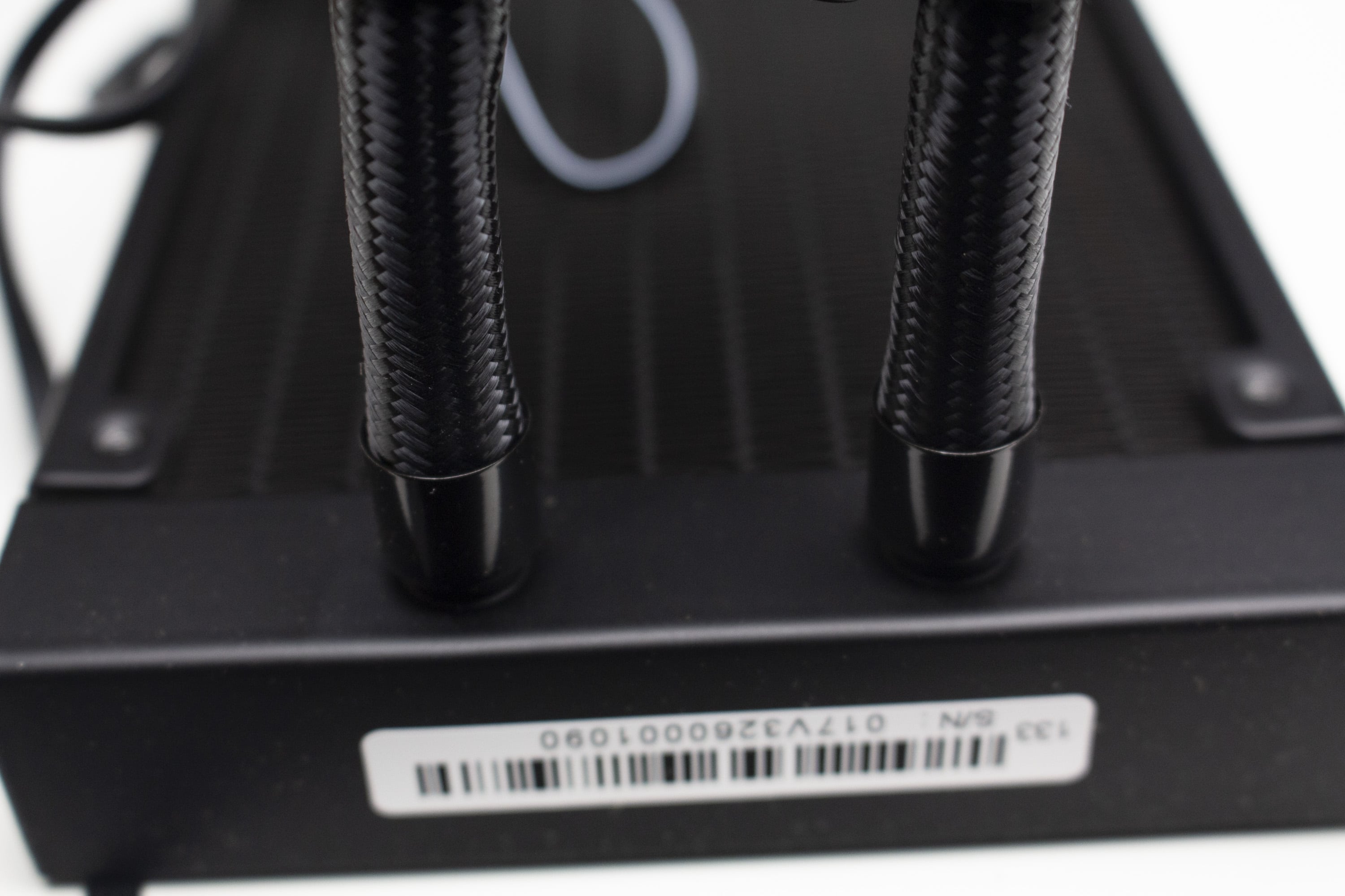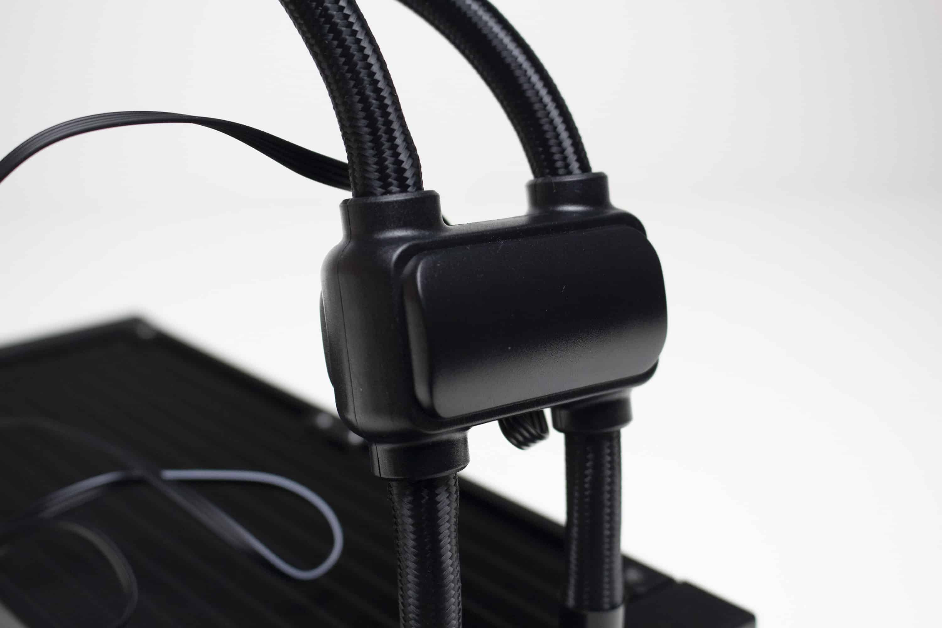 Mit einer Länge von 400 Millimetern sind die Wasserschläuche ausreichend lang um den Radiator überall in einem herkömmlichen Midi-Tower unterbringen zu können. Dazu tragen auch die drehbaren Gelenke auf Seiten des Kühlblocks bei. Sowohl am Radiator als auch an der Pumpe wurden die textilummantelten Schläuche in Metallmuffen gepresst. Dadurch wird die Lösung zu einem geschlossenen System, bei dem der Kühlkreislauf nicht erweitert werden kann.