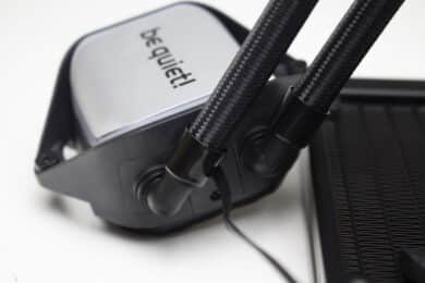 Anders als bei vielen anderen Herstellern, verbaut be quiet! die Pumpe nicht im Kühlblock, sondern platziert diese am oberen Ende zwischen den Wasserschläuchen. Die Platzierung hat einen großen Vorteil: die Pumpe wird automatisch entkoppelt und kann keine störenden Vibrationen auf das Mainboard übertragen. Unter dieser Art der Implementierung leidet, zumindest aus unserer Sicht, allerdings etwas die Gesamtoptik der Kompaktwasserkühlung.