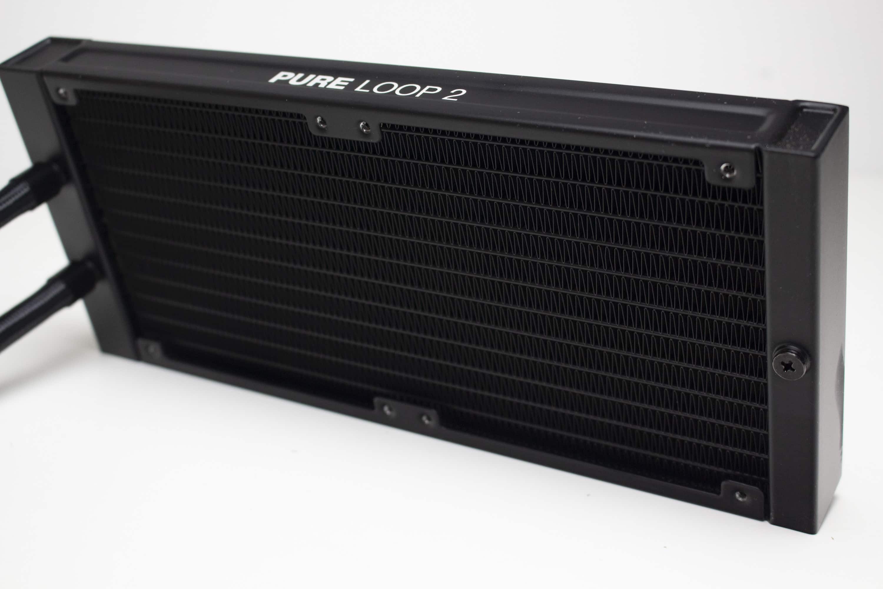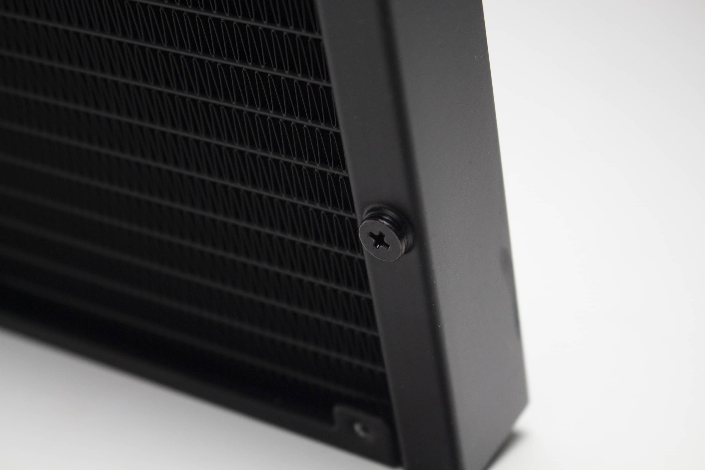 be quiet! gestaltet den Radiator schlicht und fertigt diesen komplett aus Aluminium. Die Lamellen sowie der Rahmen wurden verlötet und schwarz lackiert. Außerdem findet man auf der Seite den Schriftzug „PURE LOOP 2“. Mit einer Höhe von 27 Millimetern liegt er im Durchschnitt vieler handelsüblicher Kompaktwasserkühlungen. Eine Besonderheit lässt sich zudem an einer der kurzen Seiten erkennen. be quiet! platziert hier eine Schraube, unter der sich eine Öffnung befindet, über welche der Radiator bei Bedarf wieder aufgefüllt werden kann.