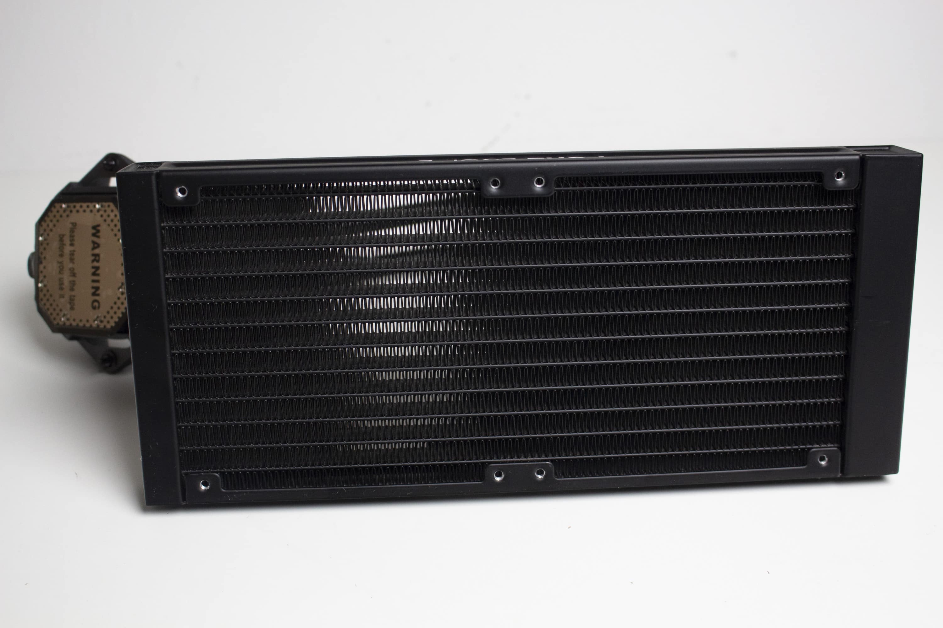 Bringt man Radiator und Lüfter zu einem einem Komplettpaket zusammen, dann ist die Kombination 52 Millimeter hoch und ca. 1,1 Kilogramm schwer. Damit sollte die Kompaktwasserkühlung auch in Gehäuse passen, die nicht so viel Platz für Wasserkühlungskomponenten bieten. In Bezug auf die Verarbeitungsqualität konnten wir weder an den Lüftern noch am Radiator oder der Pumpeneinheit Verarbeitungs- oder Lackierungsfehler feststellen. Zudem gab es keine verbogenen Lamellen oder unschöne Kratzer.
