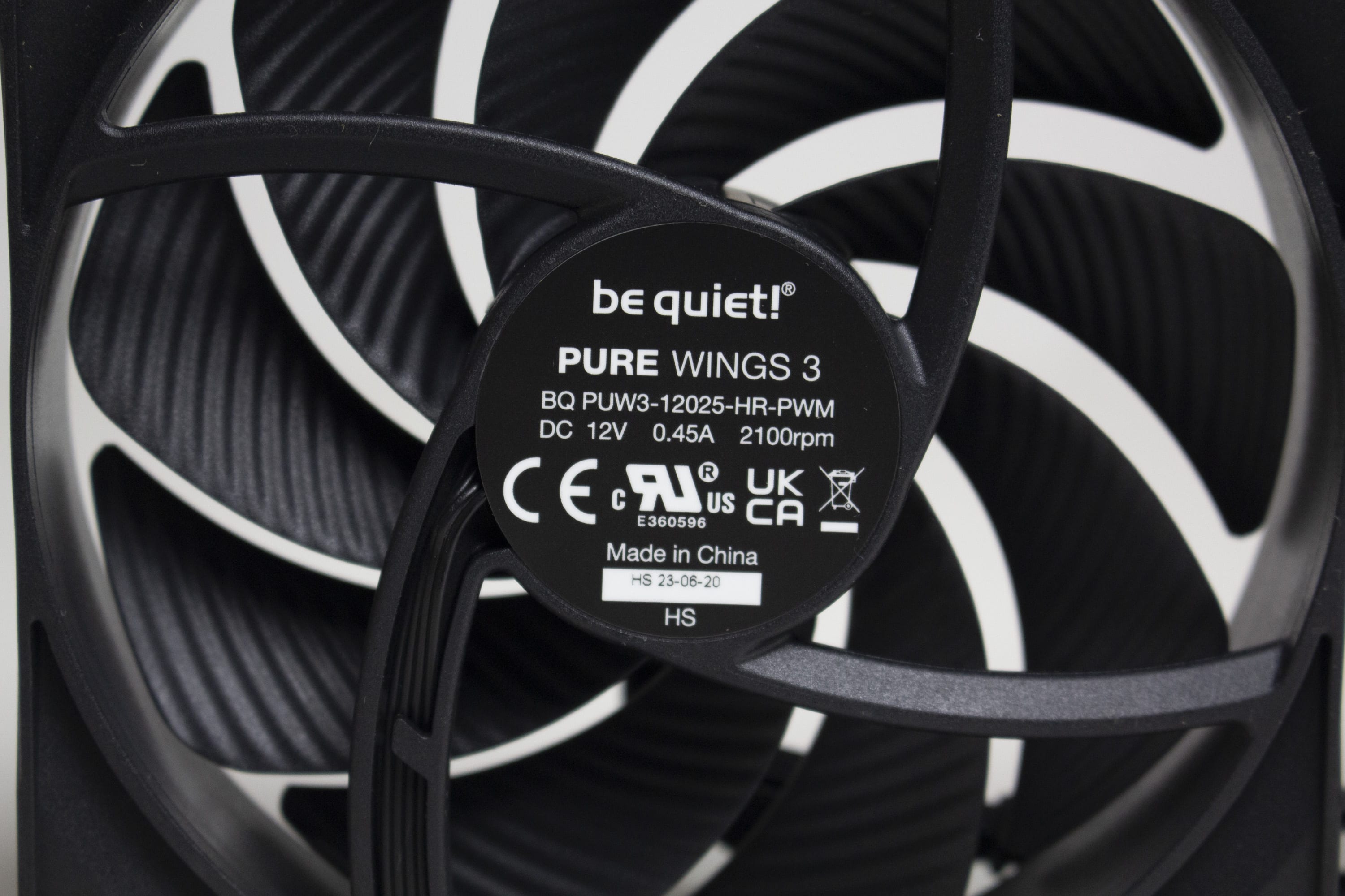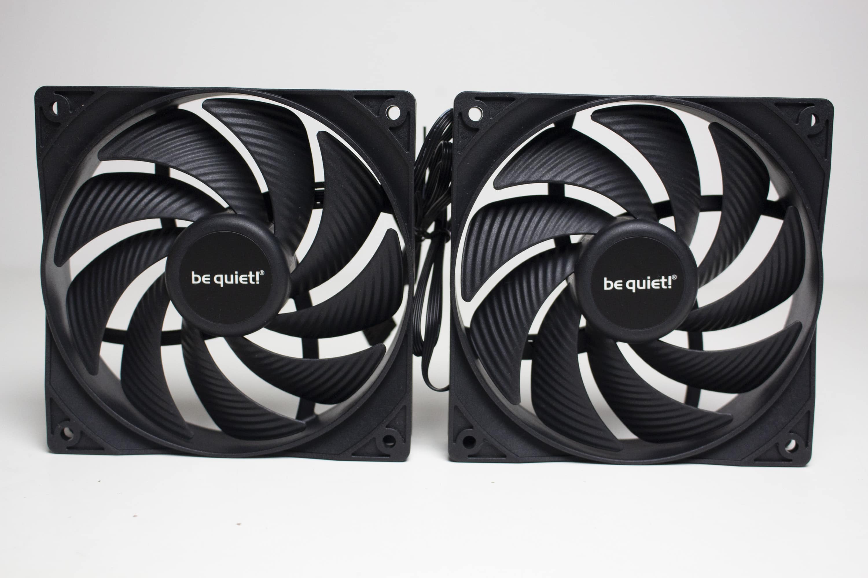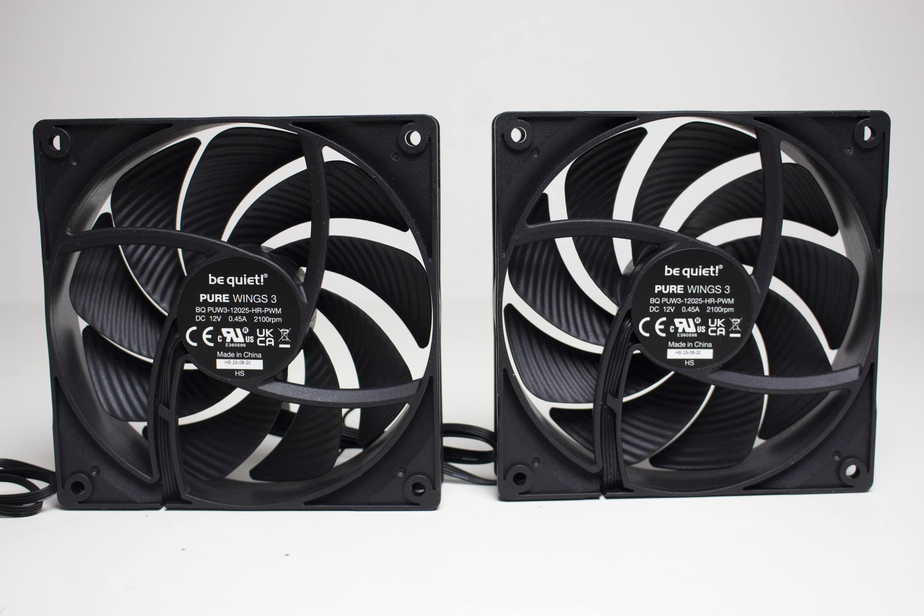 Die mitgelieferten Lüfter vom Typ „Pure Wings 3“ bestehen aus schwarzem Kunststoff und verfügen über eine Maximalgeschwindigkeit von 2100 Umdrehungen pro Minute. Der Anschluss erfolgt über einen 4-Pin-PWM-Stecker mit der beigelegten Y-Weiche direkt am Mainboard. Besonderheit ist der Einsatz der neuen „Closed-Loop-Motor“-Technik. Diese Technik kann mit dem Tempomat im Auto verglichen werden. Der Regler im Lüfter vergleicht ständig die Soll-Drehzahl mit der Ist-Drehzahl und passt entsprechend die Stromaufnahme an, um die gewünschte Drehzahl und eine konstante und stabile Leistung des Lüfters zu gewährleisten.