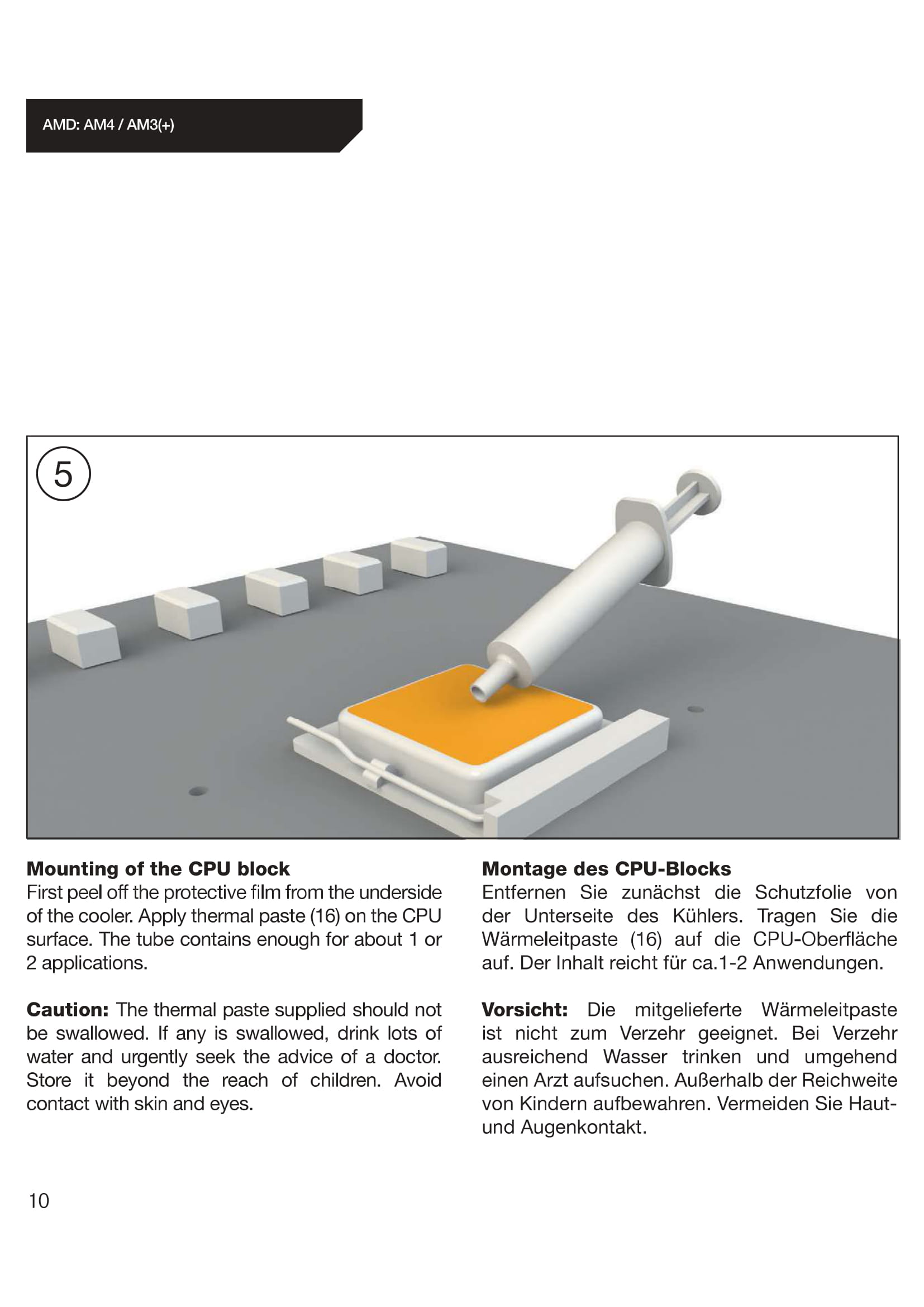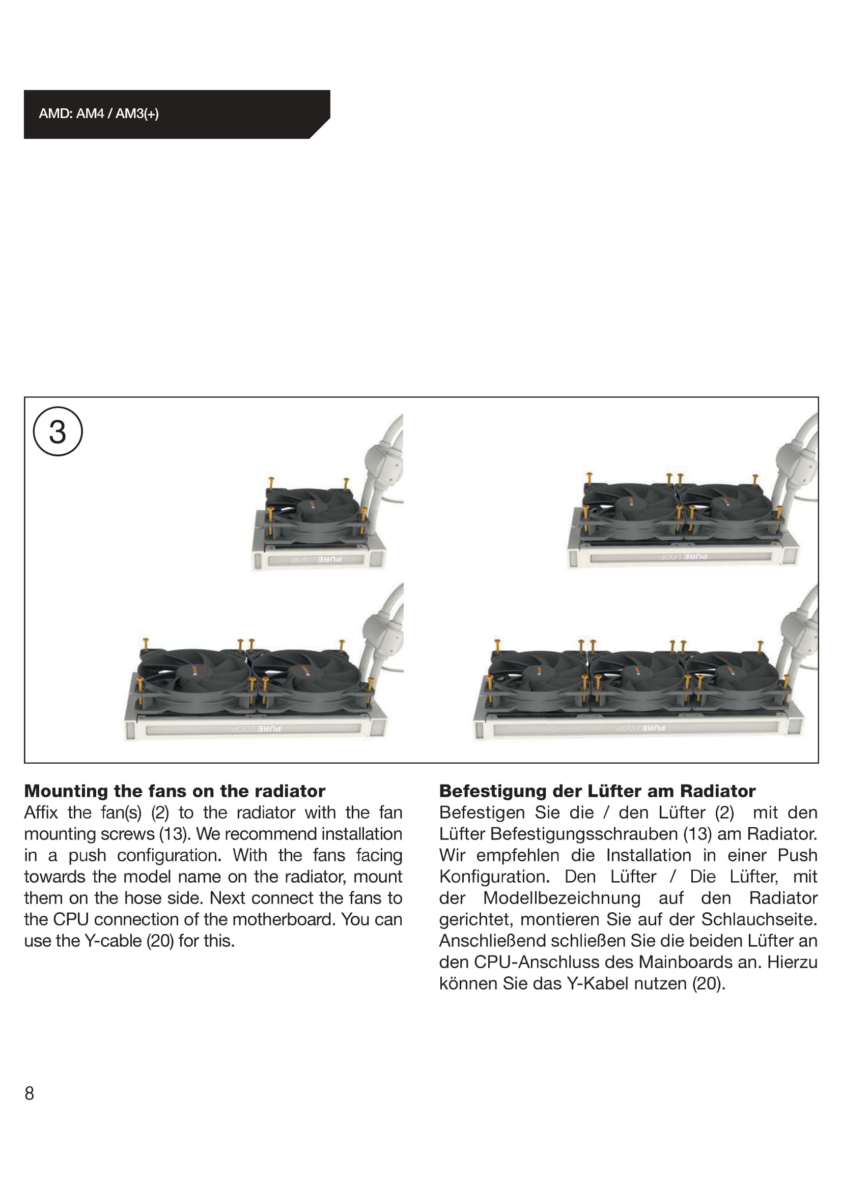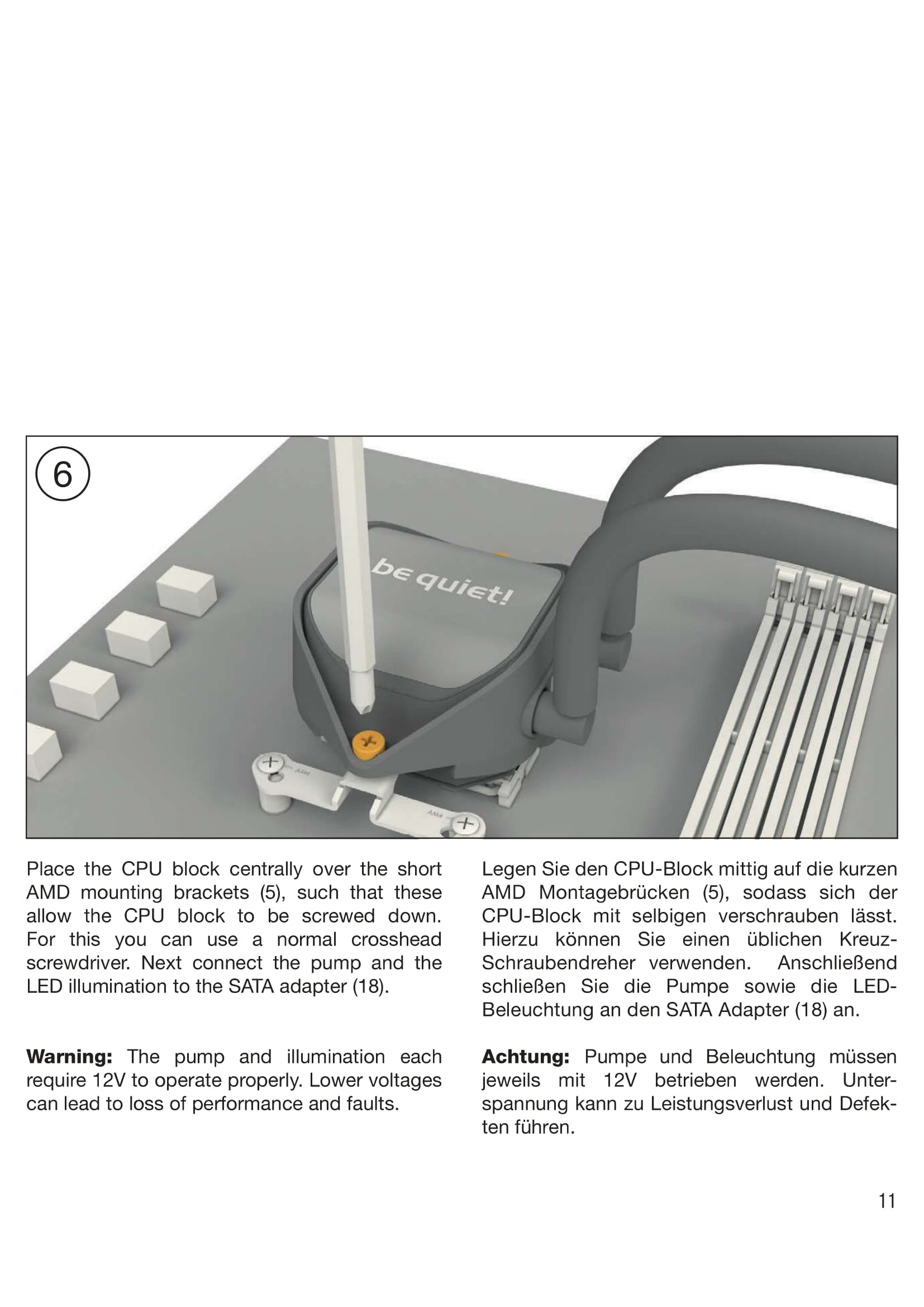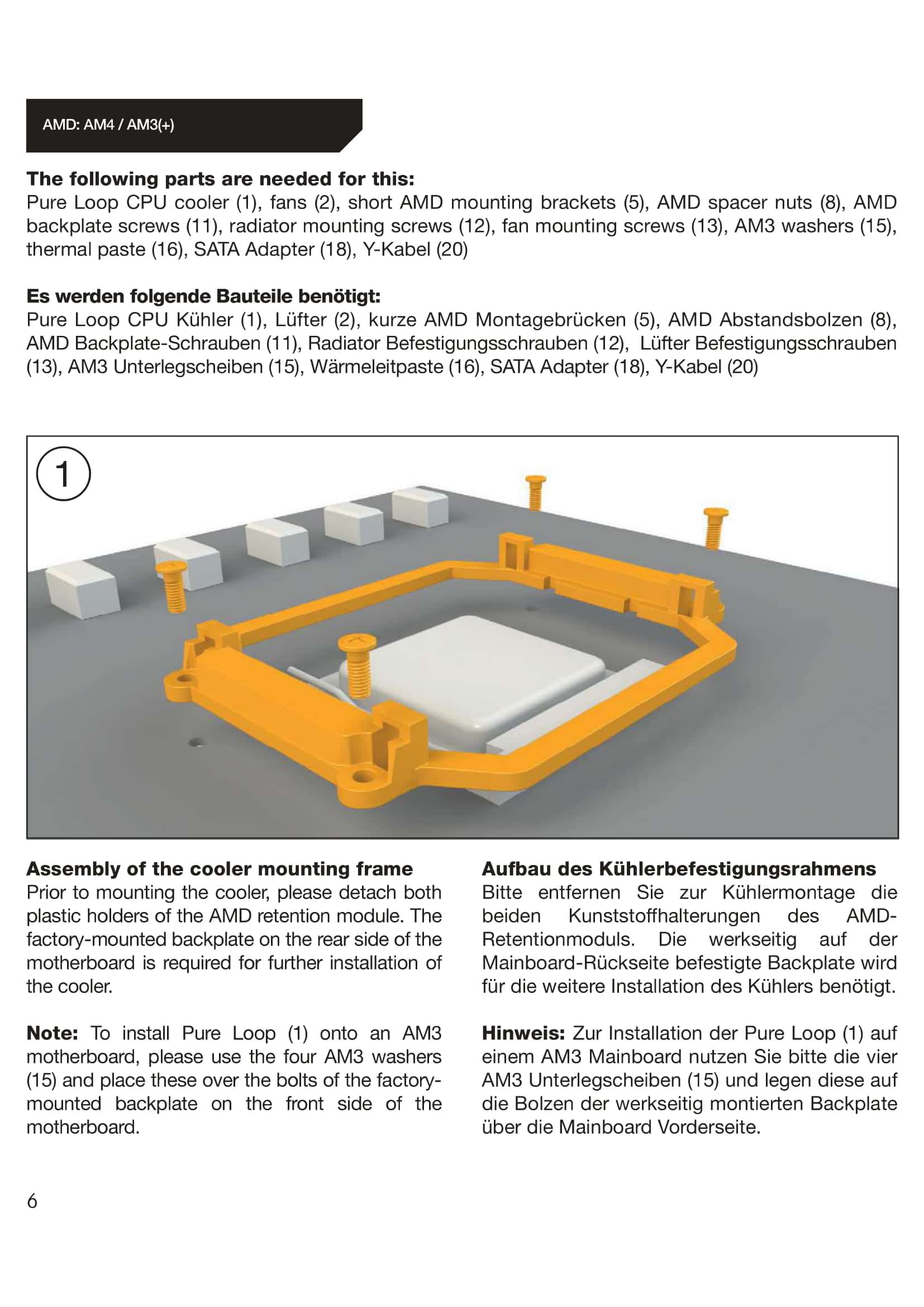 Die Wasserkühlung haben wir auf einem AMD Sockel (AM4) montiert. Zur Veranschaulichung haben wir euch die passenden Auszüge aus der Montageanleitung rausgesucht und beigefügt. Die einzelnen Schritte sind in der Anleitung sehr gut und in Bildern dargestellt.