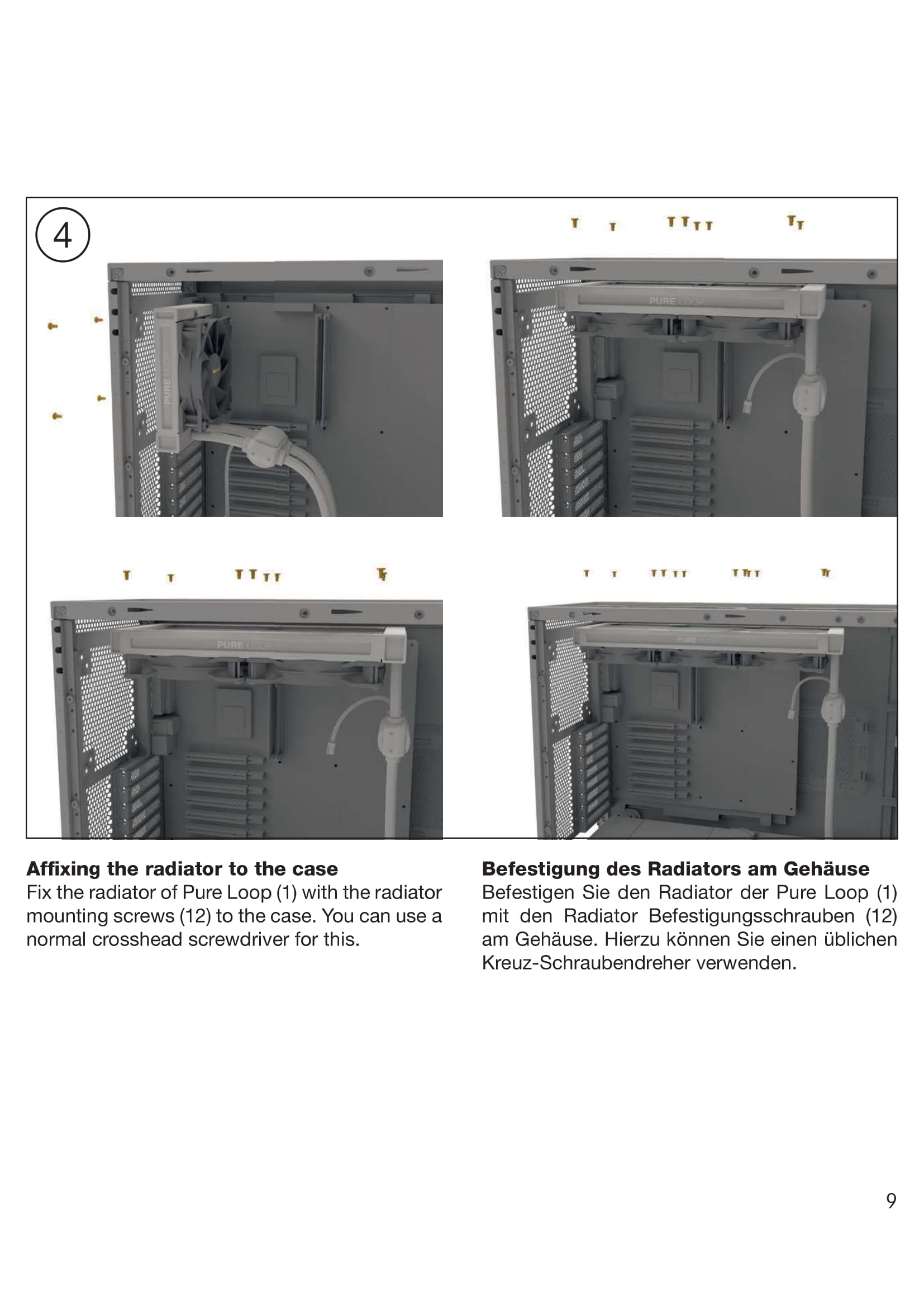 Im nächsten Schritt widmen wir uns dem Radiator und den Lüftern. Die Lüfter montieren wir nun auf dem Radiator und befestigen diese mit den beigefügten Schrauben. Dabei sollte auf die Ausrichtung geachtet werden, sodass die Anschlusskabel der Lüfter zur rechten Seite des Gehäuses zeigen. Sind alle Lüfter montiert, können wir nun den vorbereiteten Radiator mit dem Gehäuse verschrauben und kommen zum nächsten Schritt.