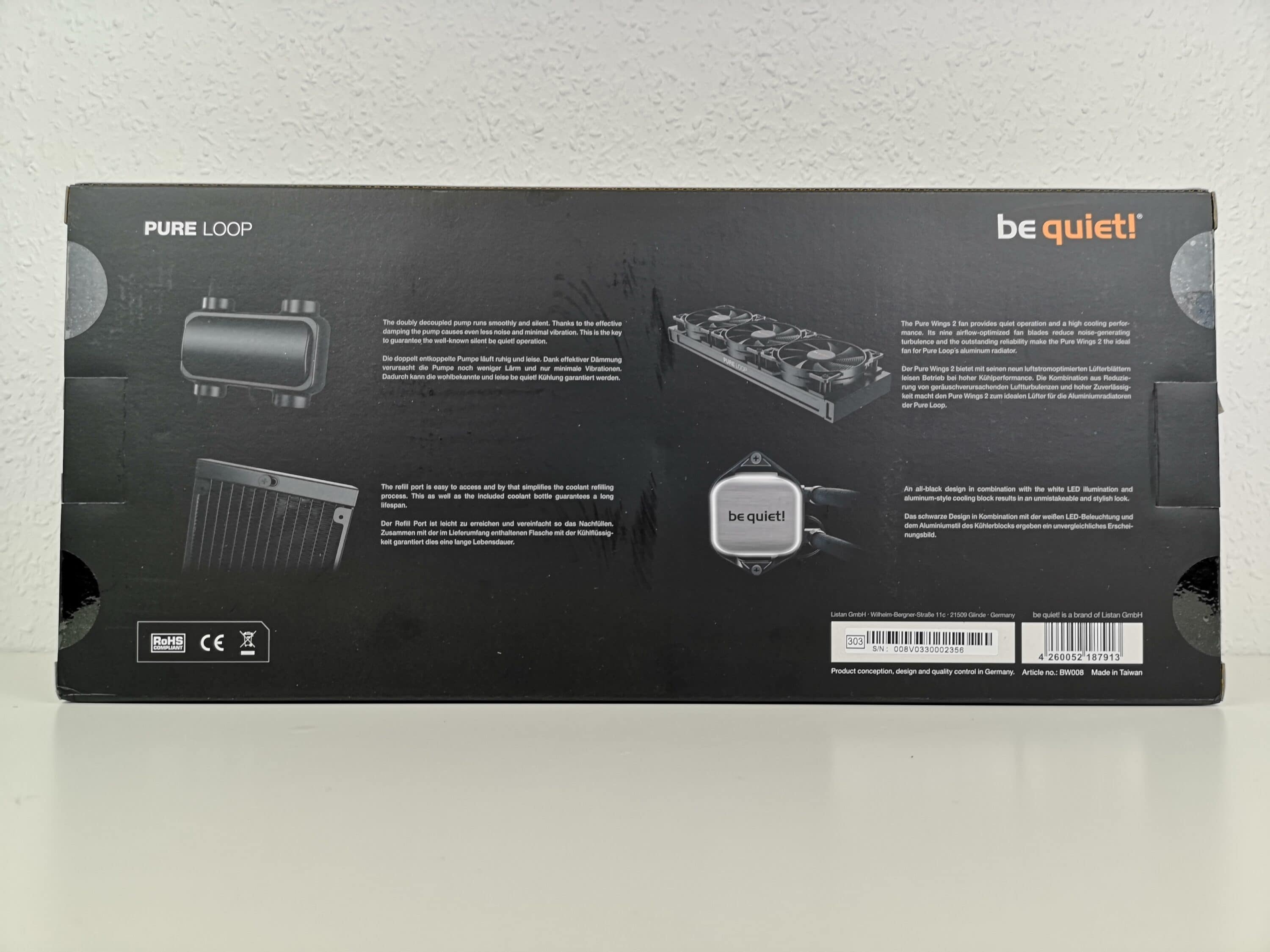 Der Kühlkörper selbst macht einen sehr wertigen Eindruck. Beim Design hat sich be quiet! etwas besonderes einfallen lassen. Die Kombination aus weißer LED, schwarzem Gehäuse und Aluminium-Optik in der Mitte lassen den gesamten Kühlkörper sehr edel wirken. So wird die Pure Loop in jedem Gehäuse zu einem wirklichen Hingucker.