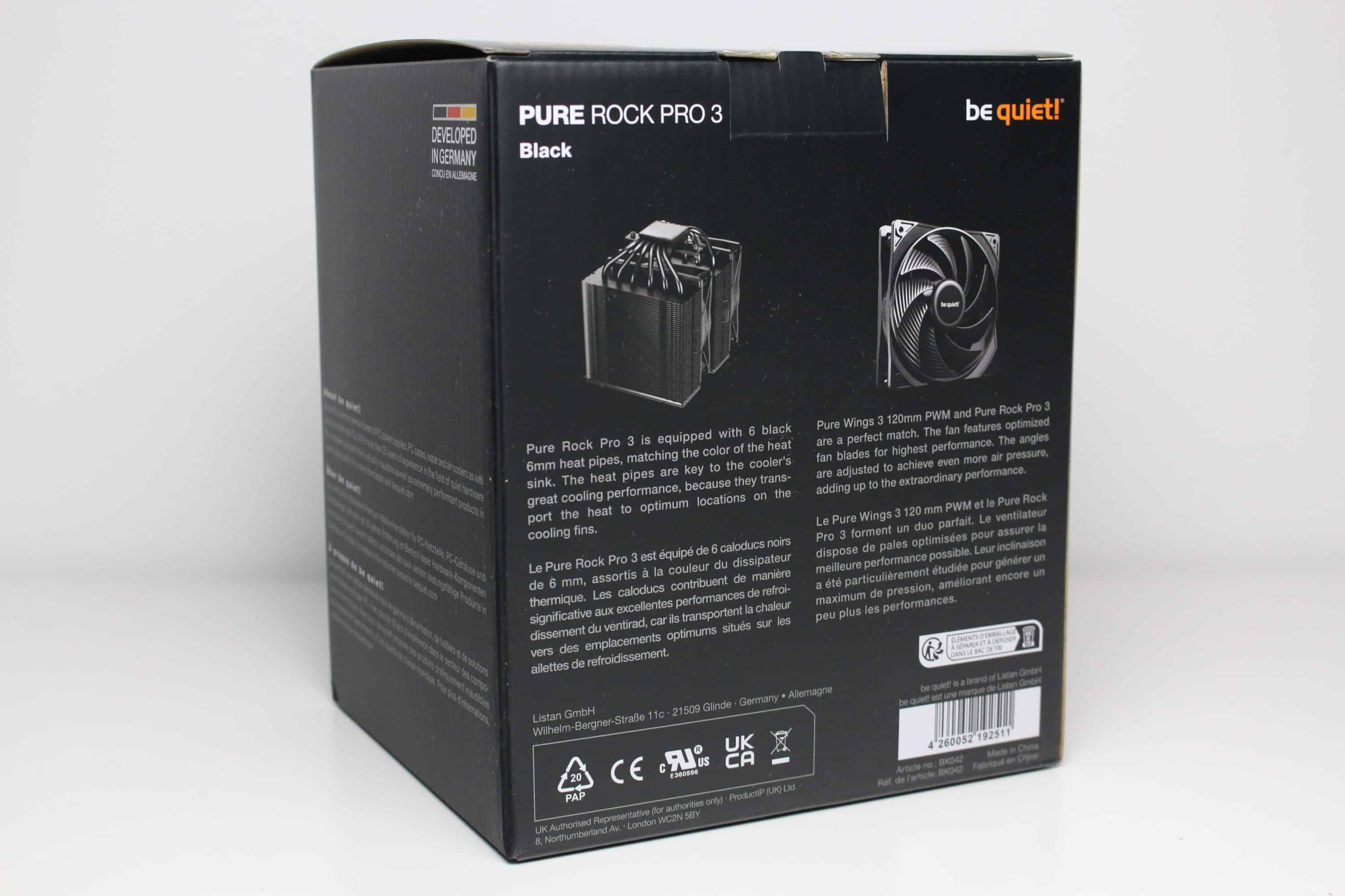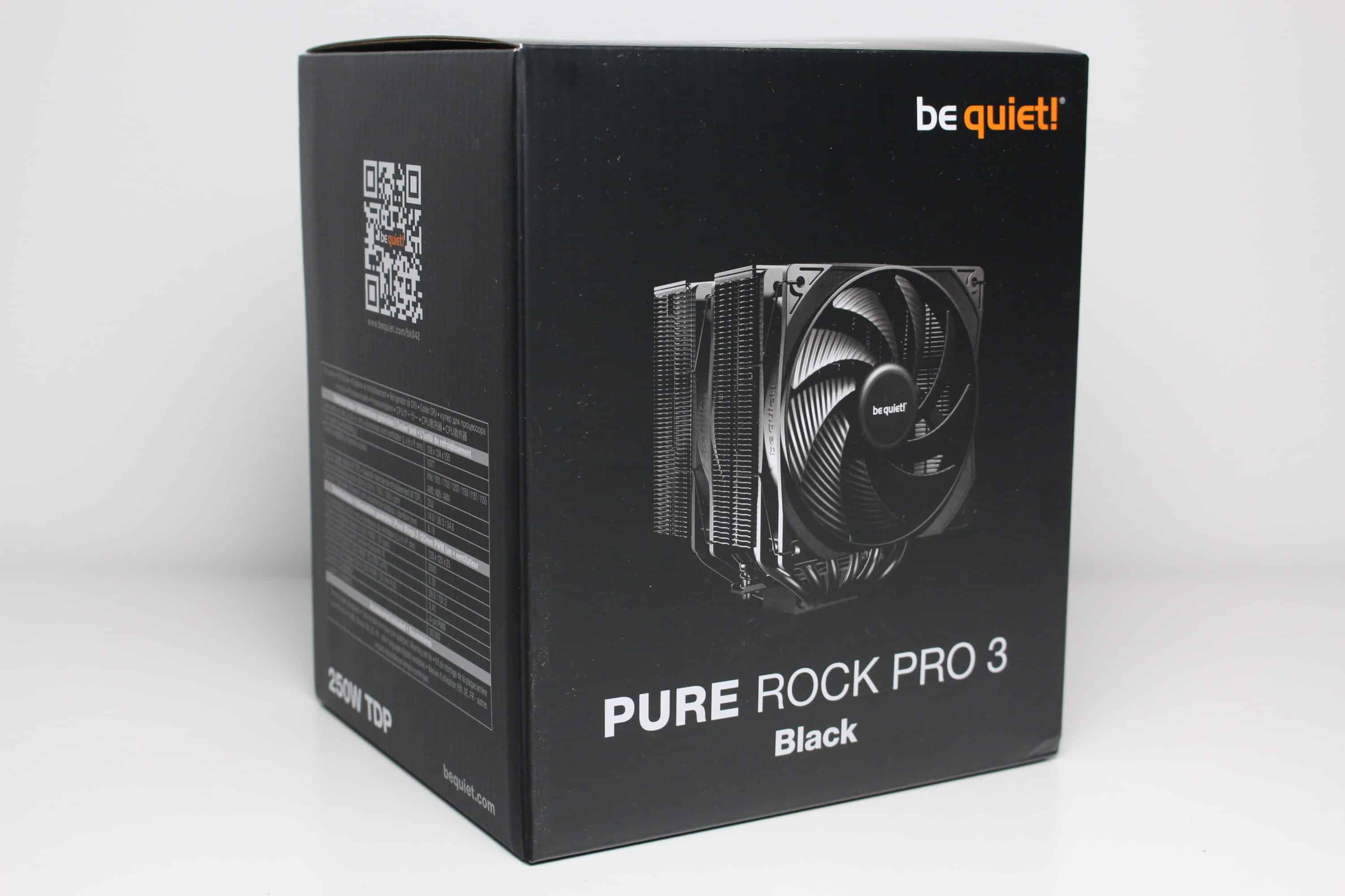 Typisch für ein be quiet!-Produkt verpackt der Hersteller den Pure Rock Pro 3 in einem Karton aus schwarz-bedruckter Pappe. Außerdem wurden mit Weiß und Orange die typischen Akzente auf der Verpackung gesetzt. Neben einigen Produktbildern finden wir auf der Kartonage auch eine Auflistung der wichtigsten Features sowie eine Zusammenfassung aller technischen Daten in Form einer Tabelle. Alle Texte wurden in englischer Sprache verfasst.