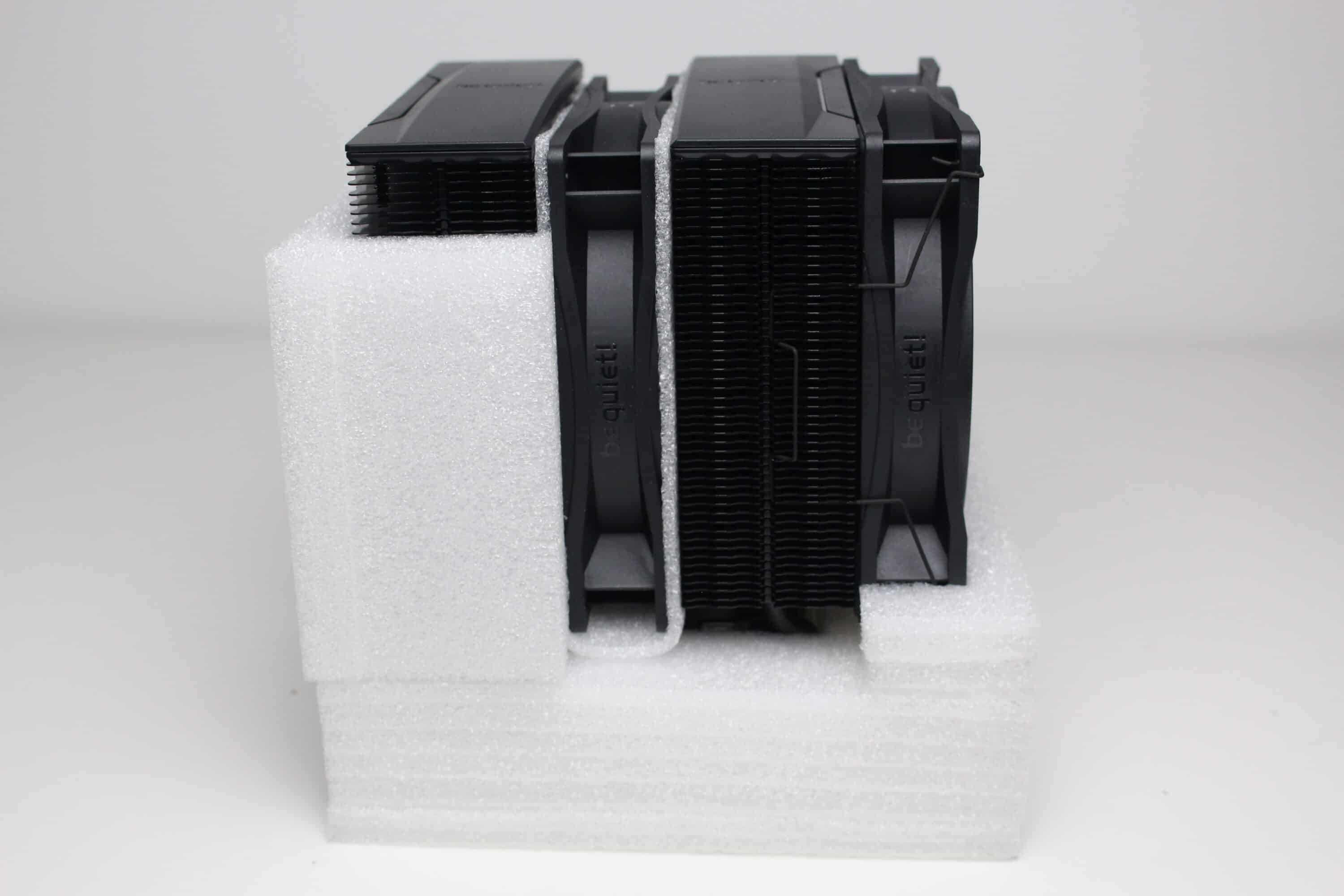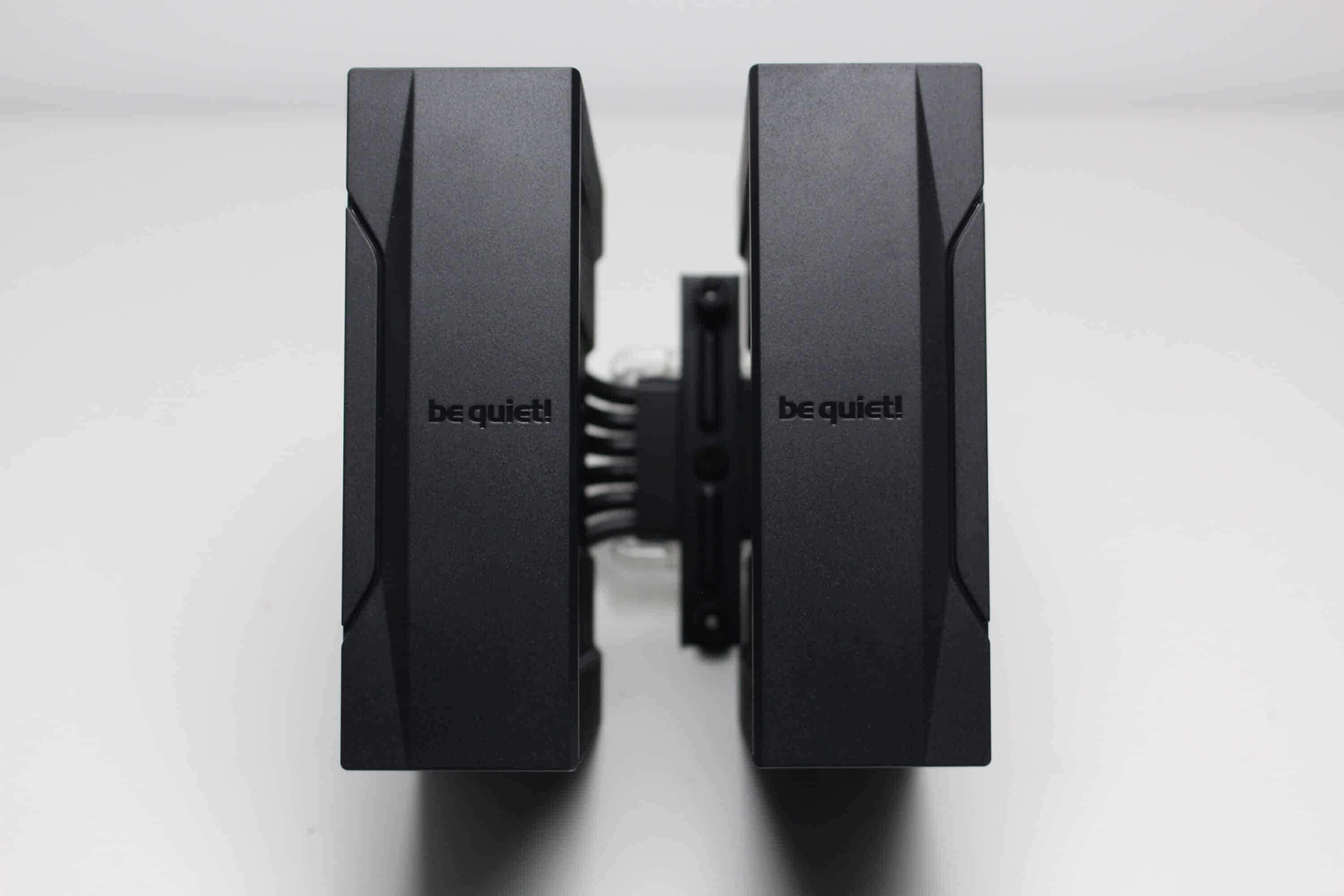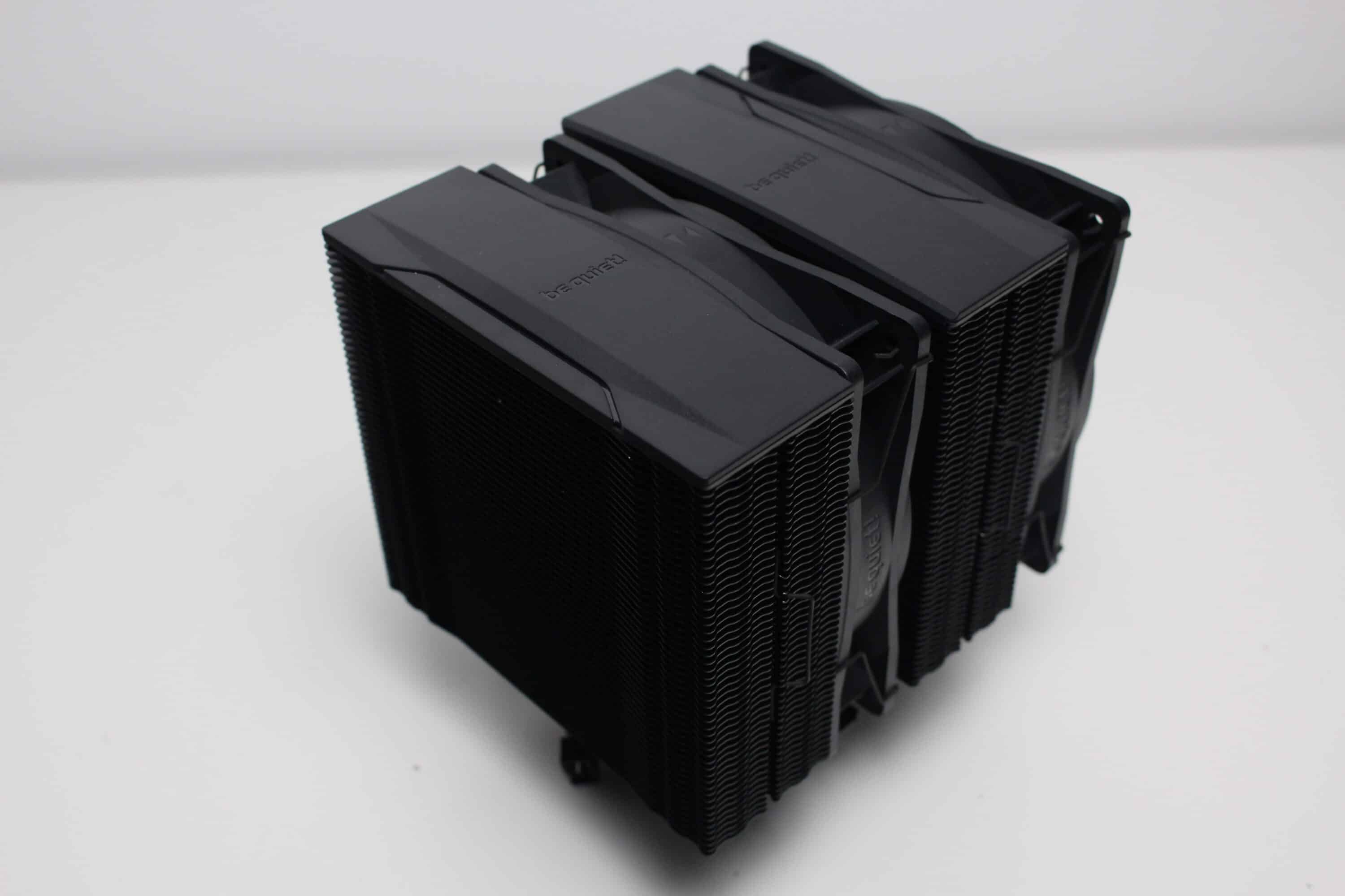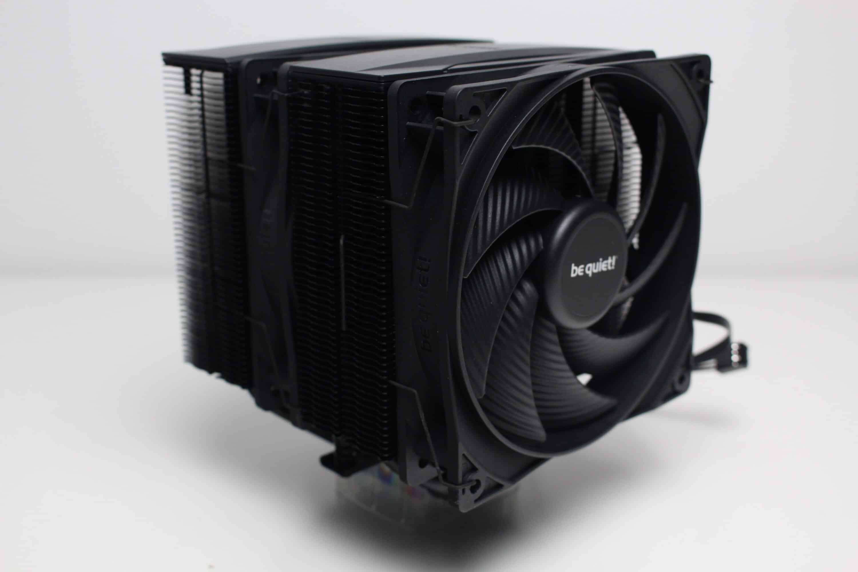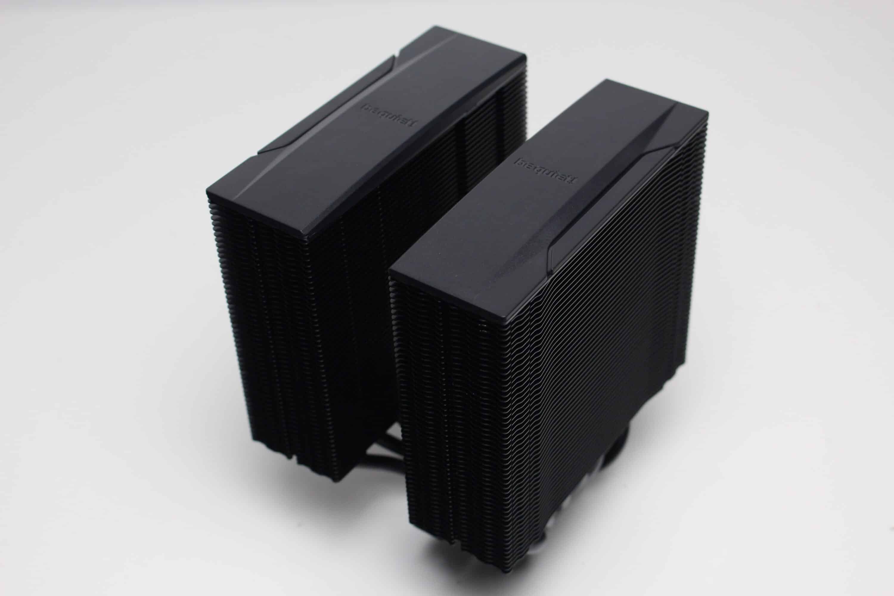 Der be quiet! Pure Rock Pro 3 besteht aus zwei Kühltürmen mit jeweils 50 schwarz lackierten Aluminiumlamellen. Oberhalb der letzten Lamelle platziert der Hersteller jeweils eine schwarze Abdeckplatte aus Kunststoff mit dem Herstellerlogo. Die Weiterleitung der Wärme von der vernickelten Basisplatte an die Lamellen erfolgt über sechs 6-mm-Kupfer-Heatpipes, die zur Optikverbesserung ebenfalls schwarz lackiert wurden. Außerdem ist auffällig, dass der Kühlkörper asymmetrisch konstruiert wurde. Das soll vor allem die Kompatibilität zu höheren RAM-Modulen verbessern.