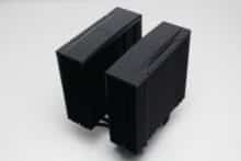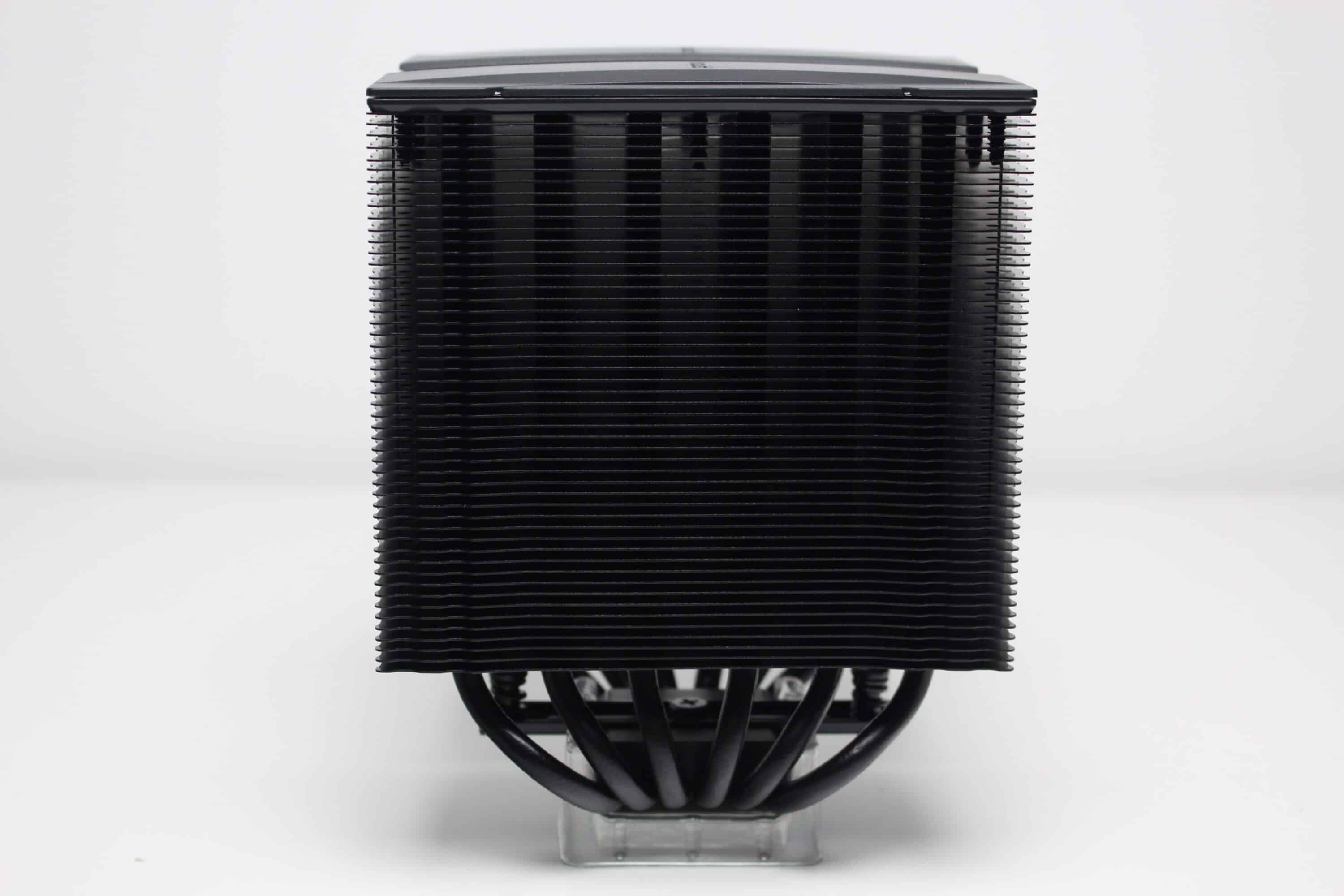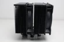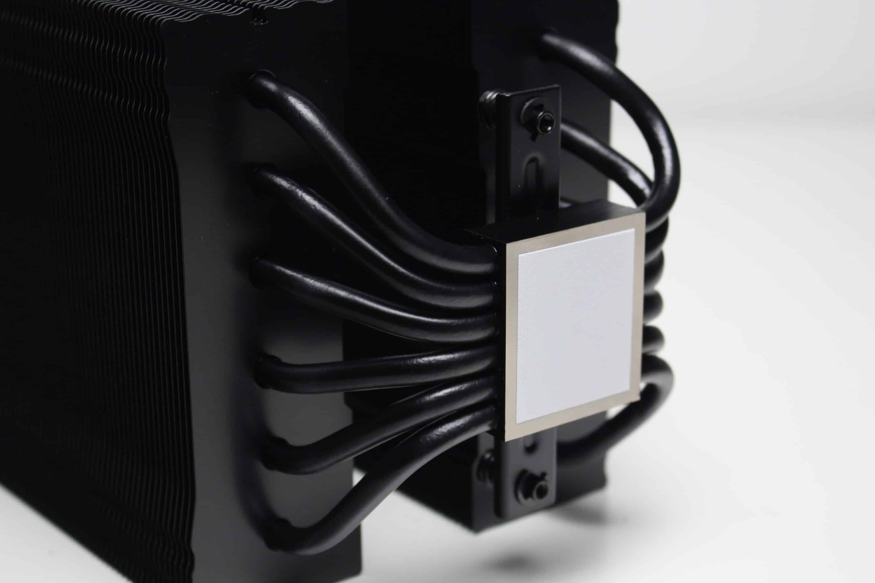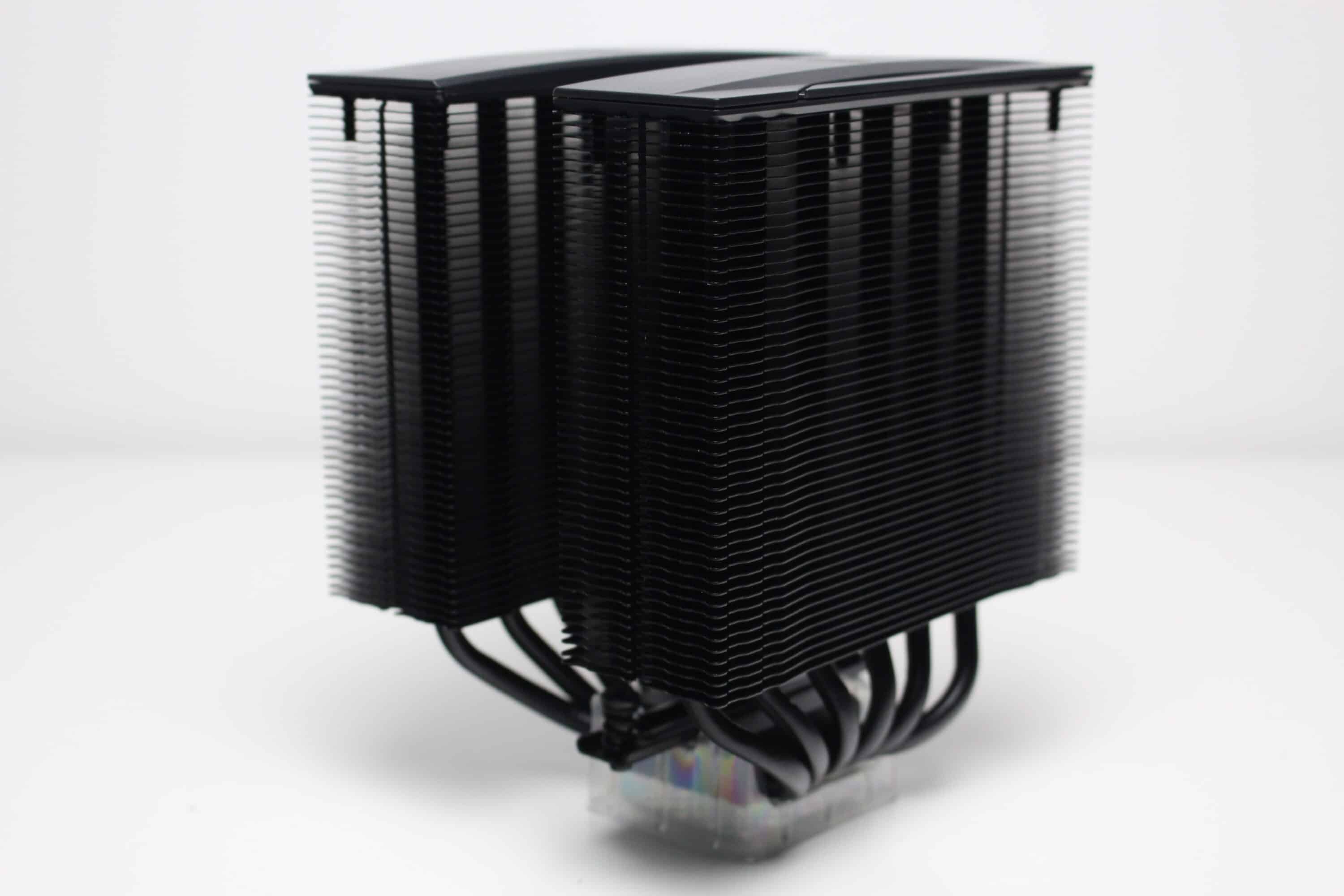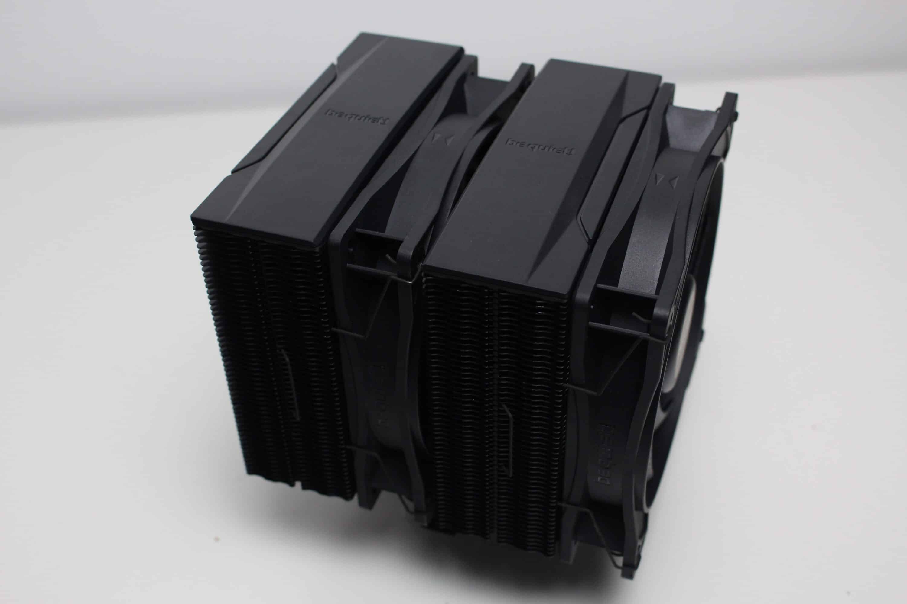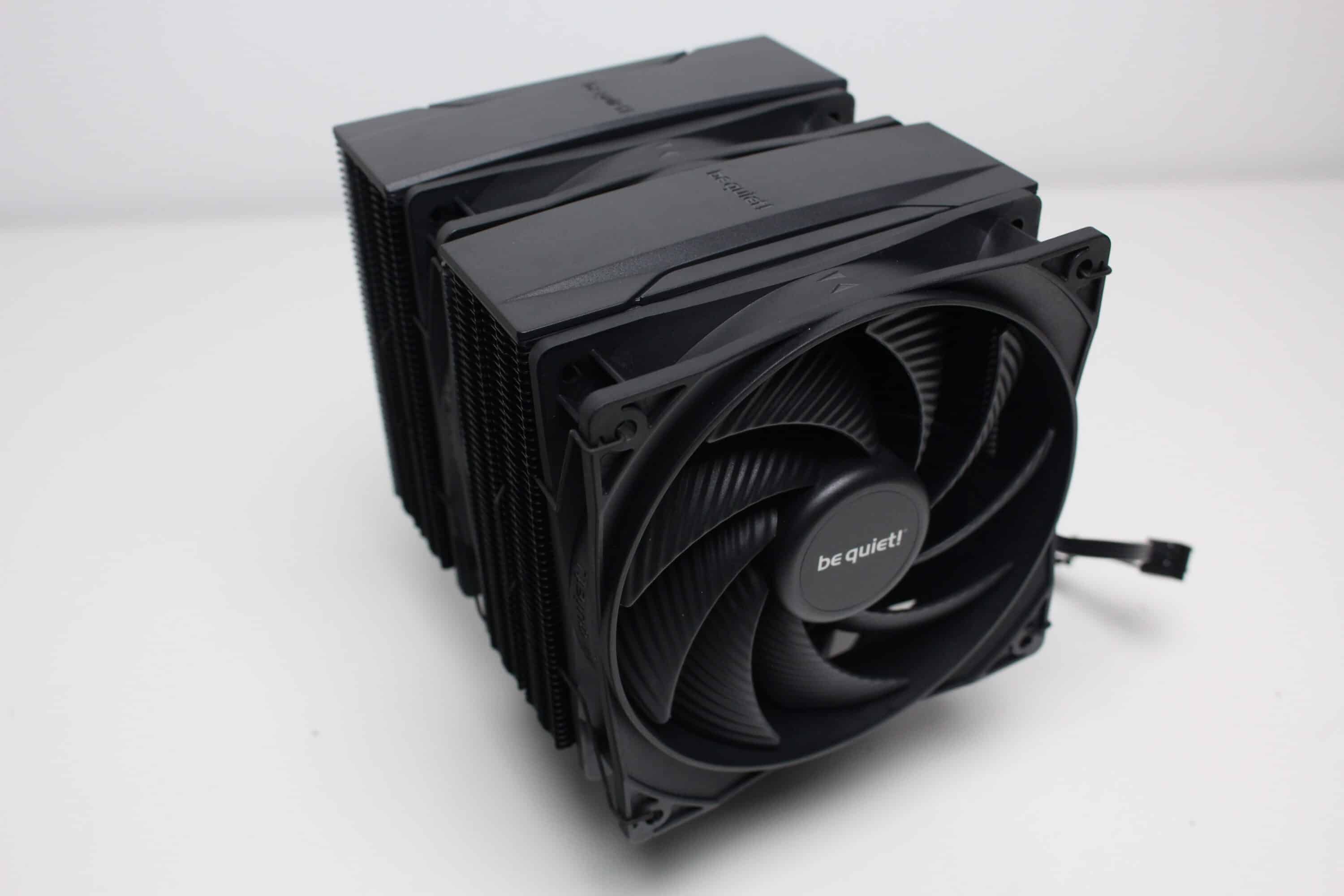 Der be quiet! Pure Rock Pro 3 besteht aus zwei Kühltürmen mit jeweils 50 schwarz lackierten Aluminiumlamellen. Oberhalb der letzten Lamelle platziert der Hersteller jeweils eine schwarze Abdeckplatte aus Kunststoff mit dem Herstellerlogo. Die Weiterleitung der Wärme von der vernickelten Basisplatte an die Lamellen erfolgt über sechs 6-mm-Kupfer-Heatpipes, die zur Optikverbesserung ebenfalls schwarz lackiert wurden. Außerdem ist auffällig, dass der Kühlkörper asymmetrisch konstruiert wurde. Das soll vor allem die Kompatibilität zu höheren RAM-Modulen verbessern.