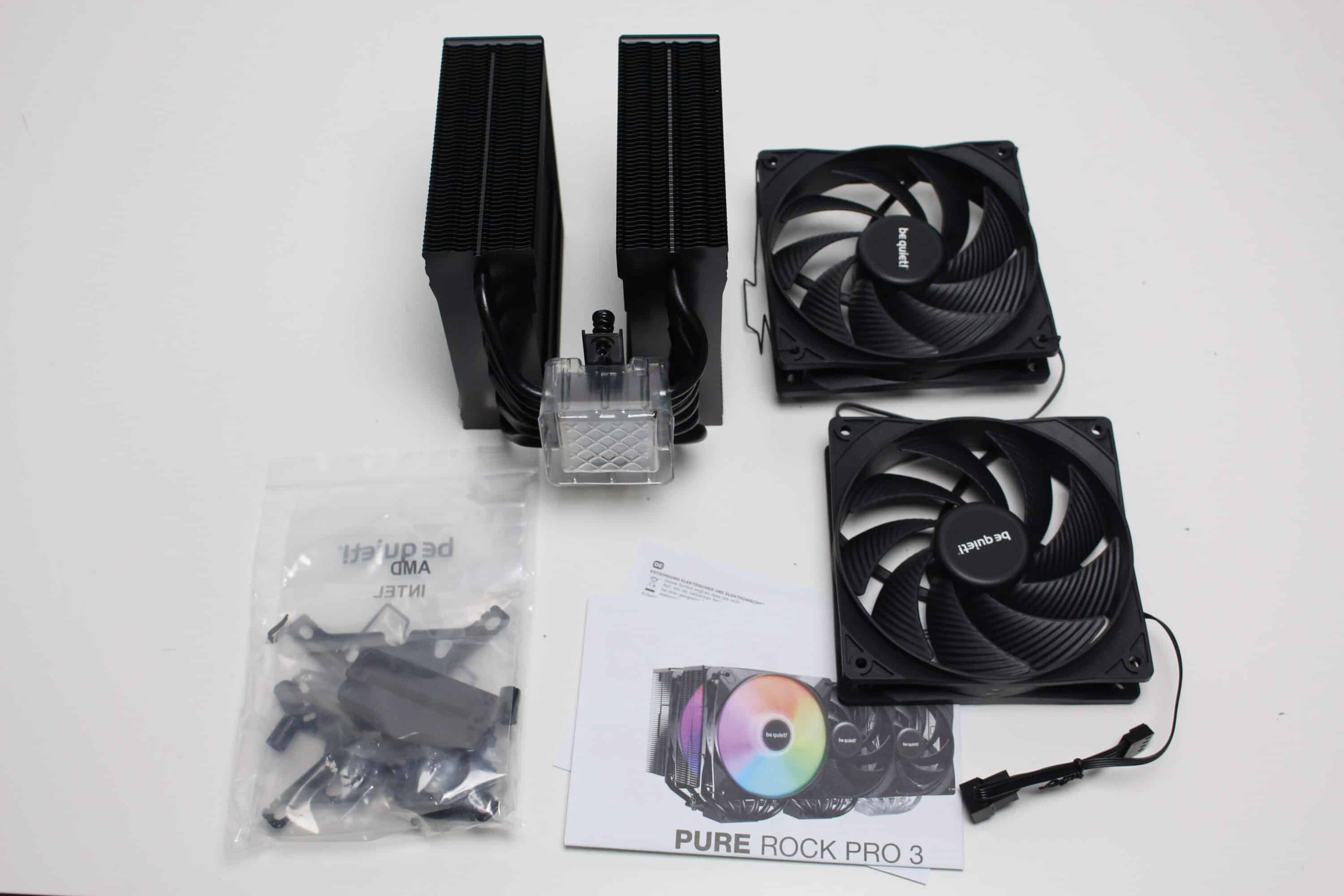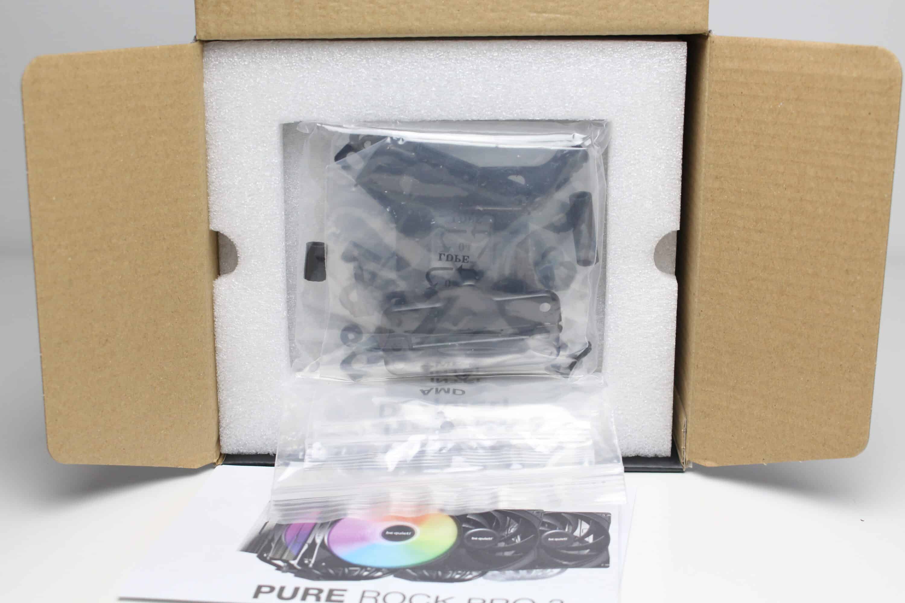 Im Inneren des Kartons umhüllt der Hersteller den Kühlkörper mit vormontierten Lüftern mit mehreren Elementen aus weichem Schaumstoff. Außerdem wurde zwischen dem mittleren Lüfter und dem Kühlblock eine weitere Schaumstoffmatte platziert. Das Zubehör verpackt be quiet! in einem Beutel aus Kunststoff. Dieser beinhaltet Abstandshalter, Schrauben, eine Backplate, Montagebügel, vier Lüfterklammern sowie eine Montageanleitung. Die Wärmeleitpaste ist bei allen Pure Rock 3 Varianten bereits auf dem Kühler aufgetragen. Zusätzliche Wärmeleitpaste liegt dem Kühler nicht bei.