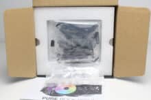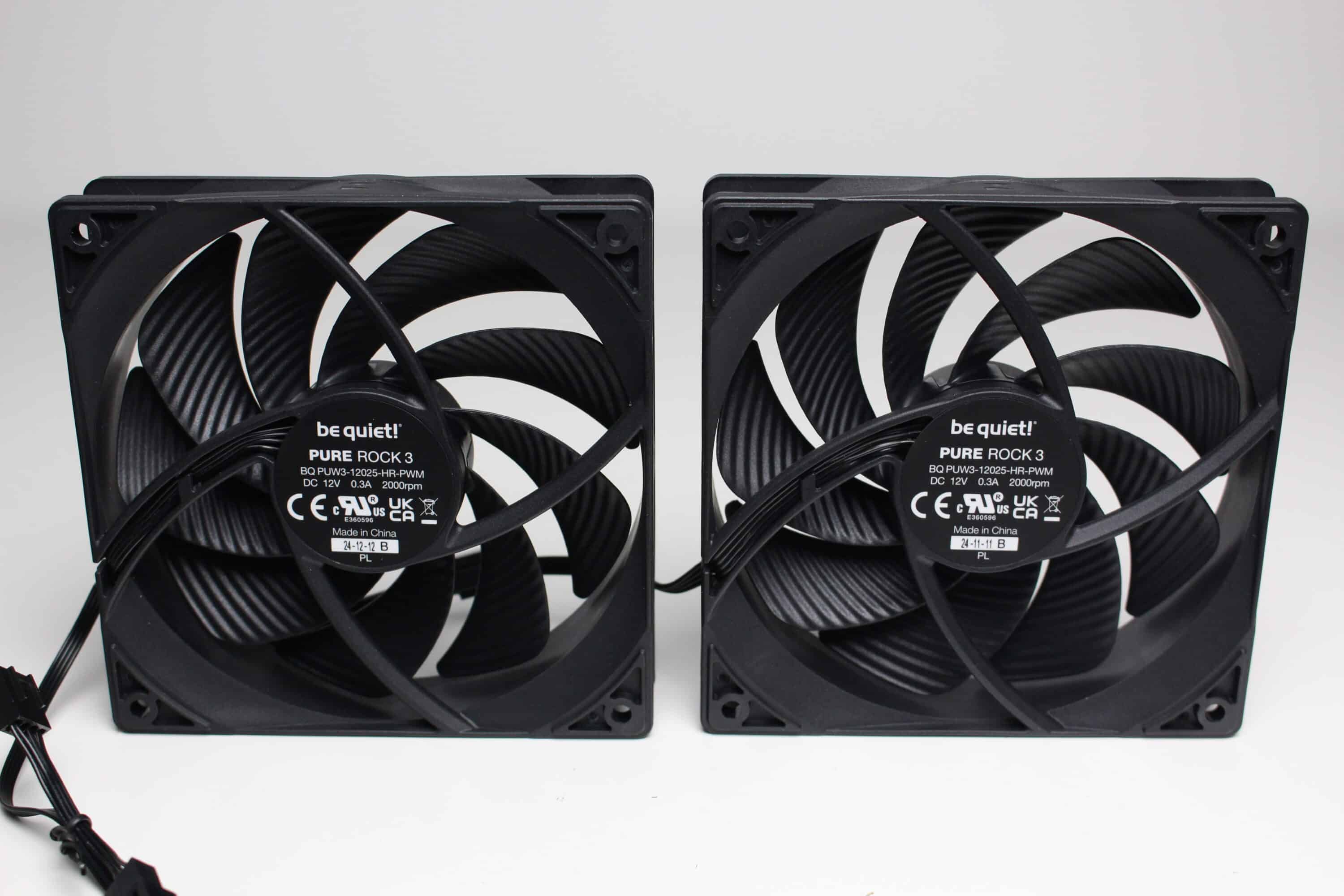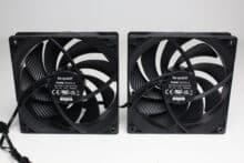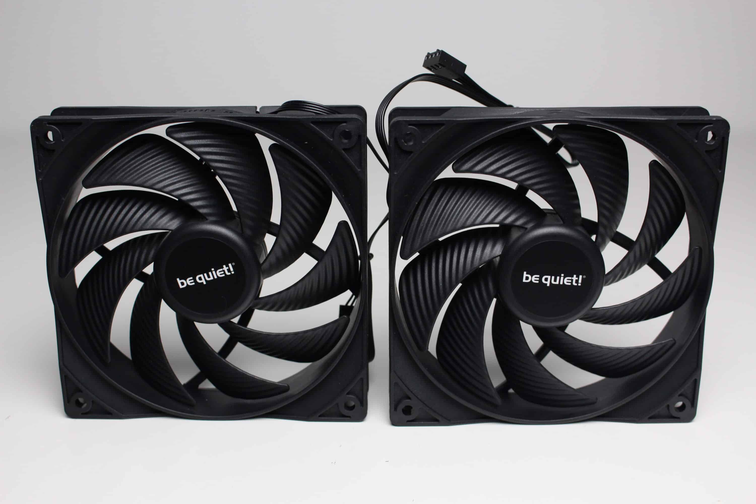 Die zwei mitgelieferten Lüfter sind vom Typ Pure Wings 3 und haben eine Rahmenbreite von 120 Millimetern. Der Rotor besteht aus neun Lüfterblättern und verfügt über ein Rifle-Lager. Ansonsten sind sämtliche Elemente der Pure Wings 3 schwarz gehalten. Die Stromversorgung erfolgt über einen 4-Pin-PWM-Stecker, der bei einem der Lüfter zusätzlich über eine Y-Weiche verfügt. Gummierte Ecken zum Zwecke der Entkopplung gibt es bei den Pure Wings 3 hingegen nicht.