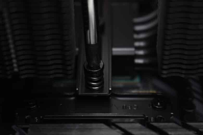 Wie bei vielen anderen Kühlern auch, ist die Montage des be quiet! Pure Rock Pro 3 Black sehr einfach und schnell erledigt. Bei unserem AM4-Testsystem mussten zunächst die zwei Kunststoffbügel des AMD-Retentionmoduls entfernt werden. Die Backplate verbleibt dabei an der Rückseite und wurde von vorne mit vier Abstandshaltern aus Kunststoff bestückt.