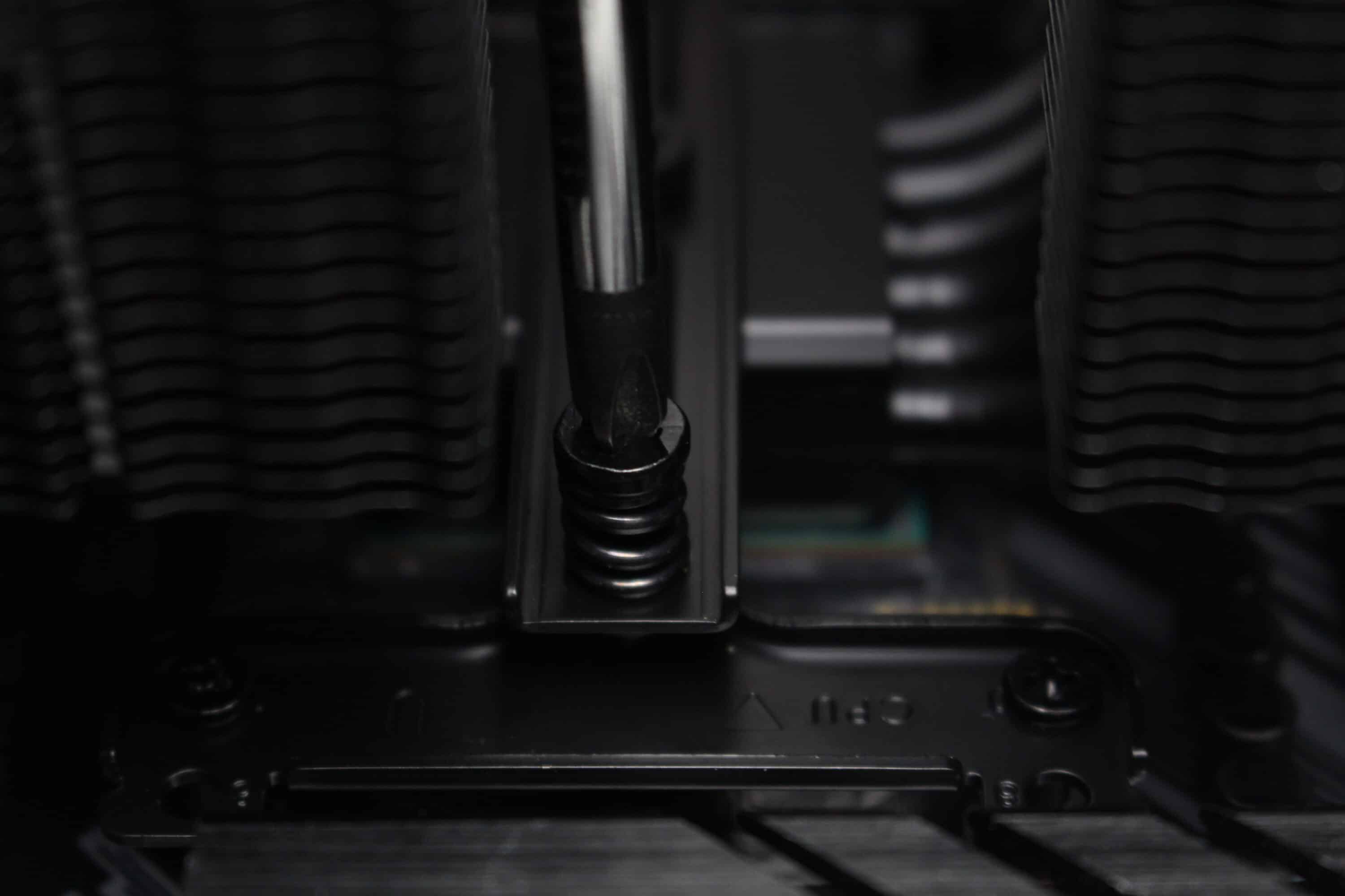 Vorteilhaft ist beim Pure Rock Pro 3 außerdem, dass der Hersteller die Wärmeleitpaste gleich voraufgetragen hat. Im letzten Schritt stellt man den Kühlkörper also nur noch auf die CPU und schraubt ihn mit zwei federgelagerten Schrauben fest. Dazu musste jedoch der mittlere Lüfter entfernt und nach erfolgreicher Montage des Kühlkörpers wieder angebracht werden.