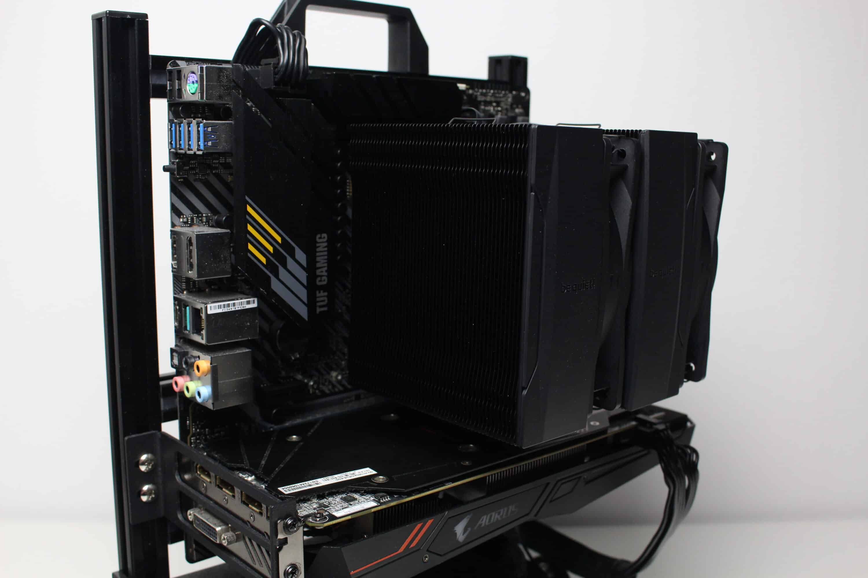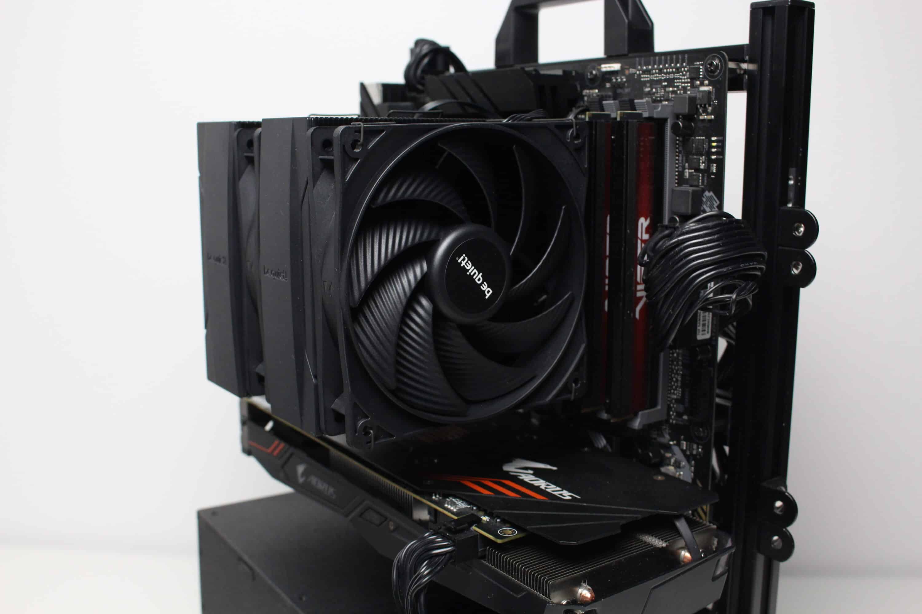 Für den Leistungstest kommt ein Testsystem zum Einsatz, welches auf einem Benchtable montiert ist. Dadurch können wir Faktoren wie einen Hitzestau im Gehäuse ausschließen. Das Testsystem besteht aus den folgenden Komponenten.