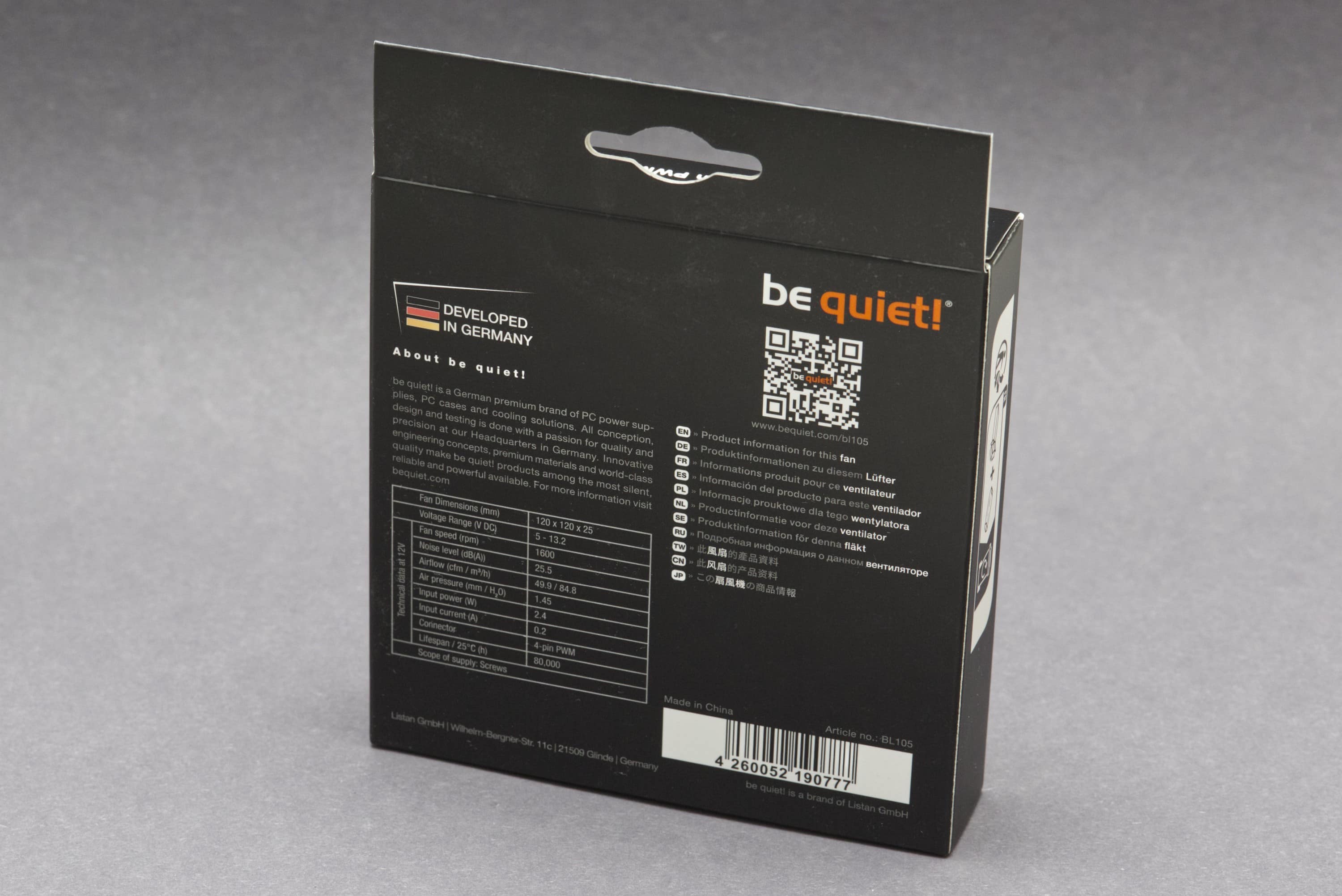 Was die Verpackung angeht, ist sich be quiet! treu geblieben. Stilistisch hat sich hier nicht viel verändert – die Schachtel ist schwarze und klar gestaltet mit dem Produktaufdruck und der Produktbezeichnung auf der Vorderseite. Die Rückseite zeit die Spezifikationen und eine kurze Vorstellung der Marke auf Englisch. Neu ist das Logo „Developed in Germany“.