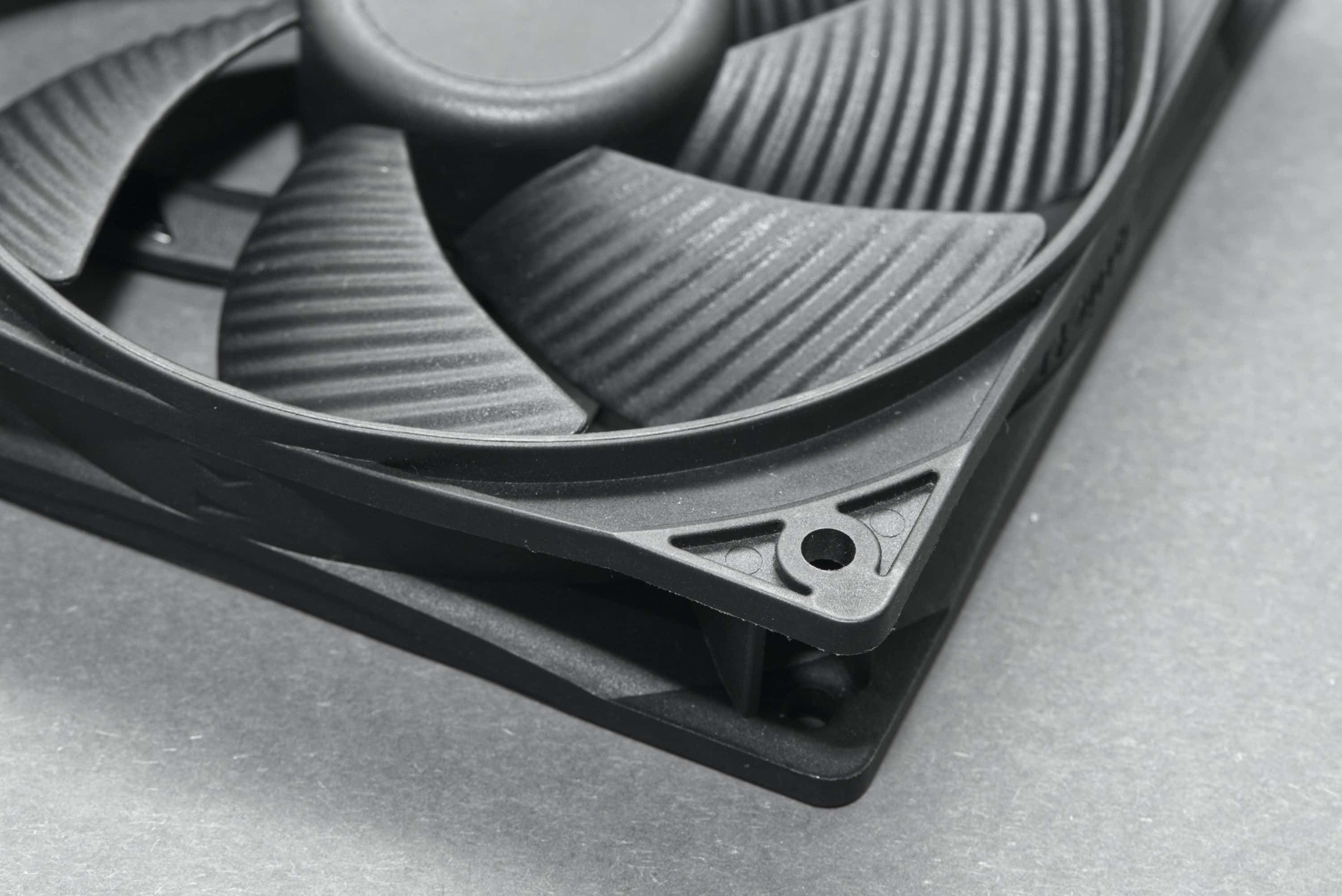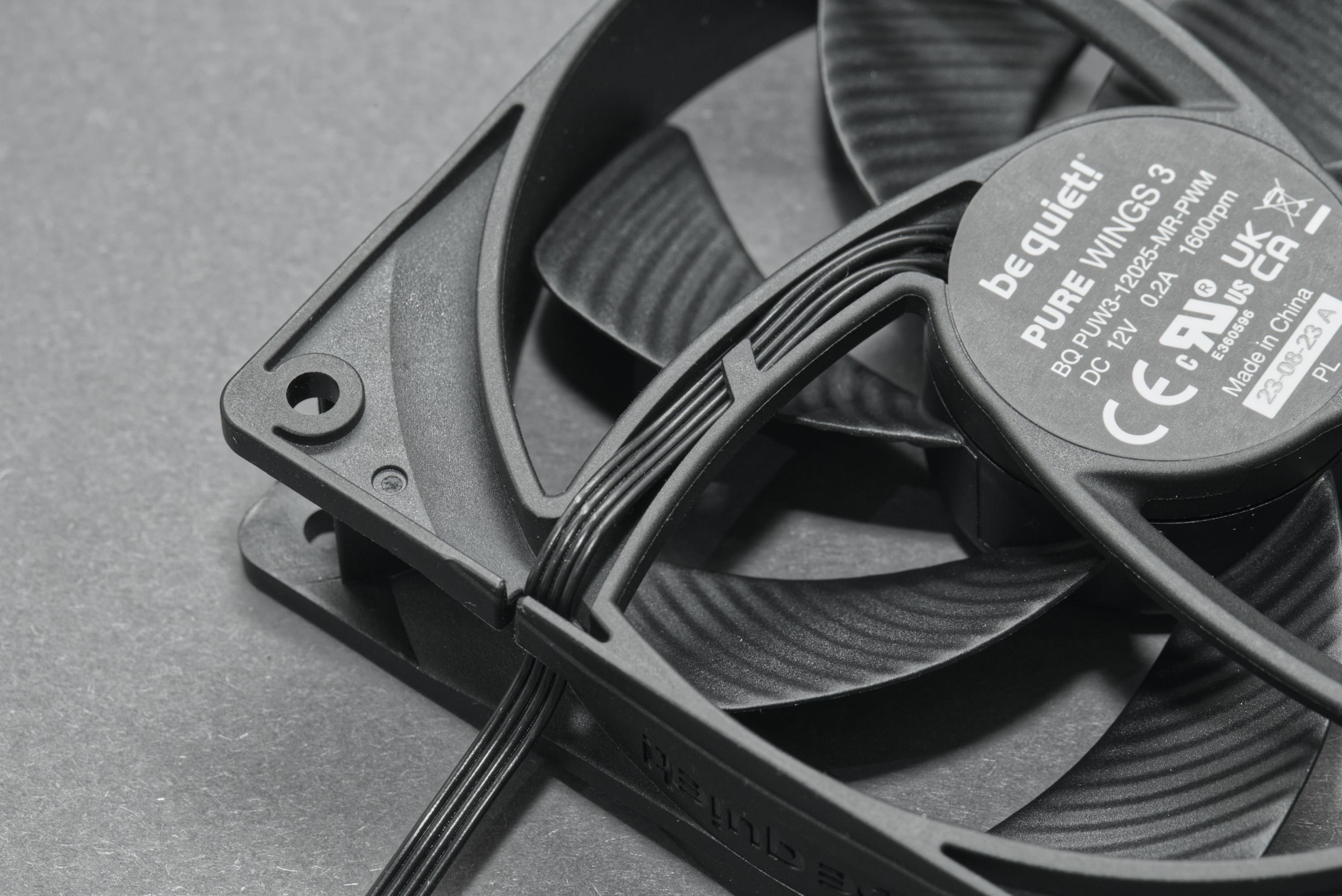 Was sich nicht verändert hat, sind die Ecken – diese sind bei der Einsteigerserie der Marke noch immer ohne Gummiauflagen. Auch das Kabel der be quiet! Pure Wings 3 ist schwarz und dünn. Damit ist es einfach und unauffällig zu verlegen, aber kann an scharfen Kanten durchaus empfindlicher sein als Kabel mit Ummantelung.
