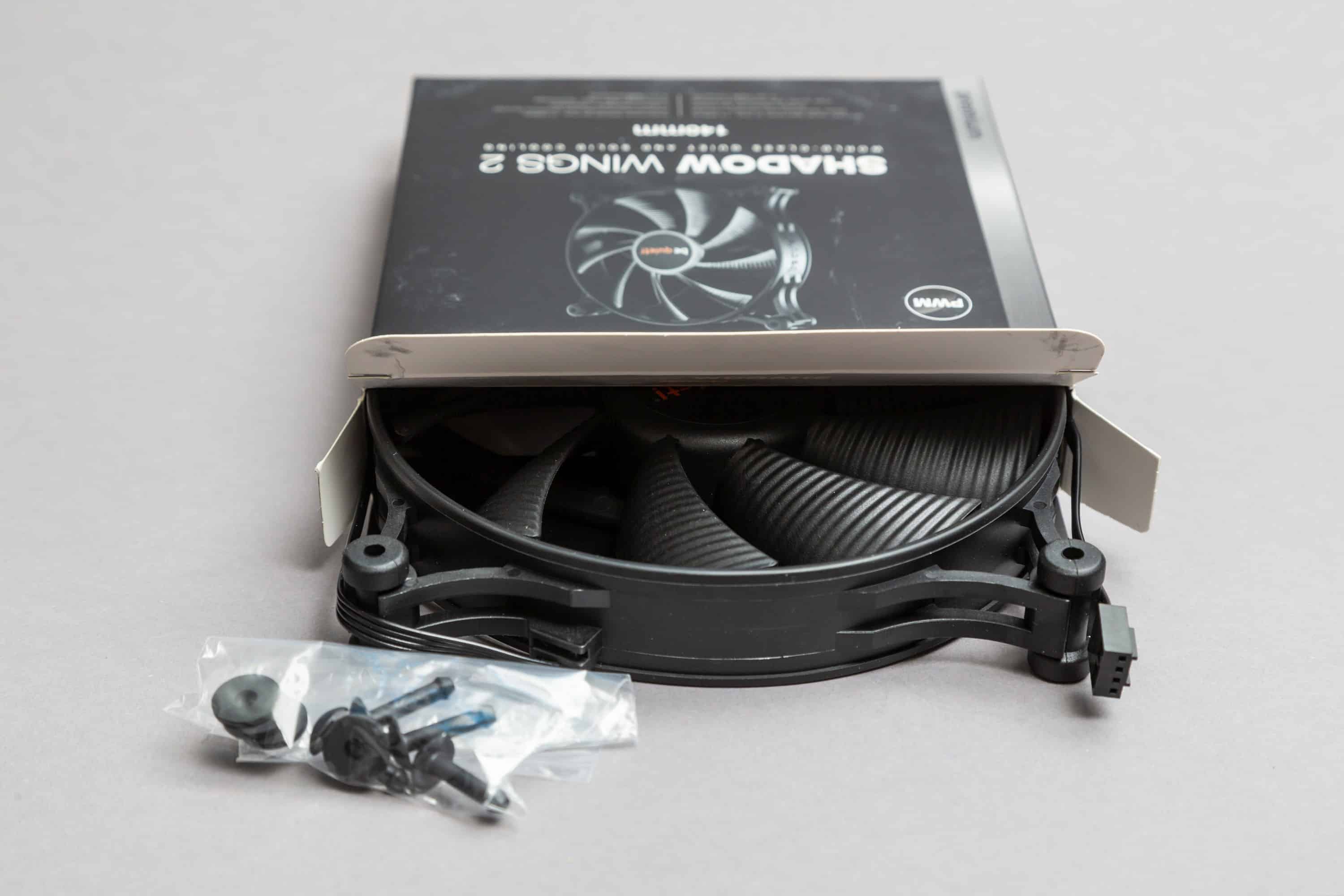 Die Verpackung der be quiet! Shadow Wings 2 ist relativ kompakt und einfach gehalten. Die schwarze Schachtel mit Produktaufdruck auf der Vorderseite und Spezifikationen auf der Rückseite bietet keine wirkliche Polsterung. In dieser Box stecken die Lüfter samt Druck-Pins und Bedienungsanleitung.
