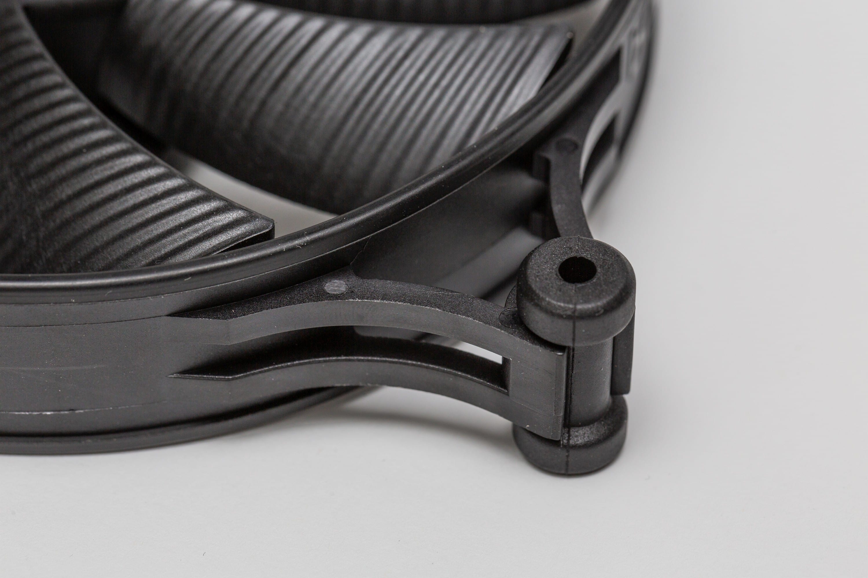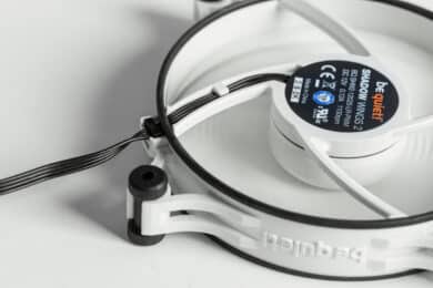 Beim Test der Verarbeitung der be quiet! Shadow Wings 2 ist nicht viel zu bemängeln. Der Rahmen ist recht dünn und nicht verwindungssteif, aber davon abgesehen sind die Lüfter rundum sauber verarbeitet. Die Kanten sind präzise gefertigt, die großflächige Gummierung um den Rahmen sorgt für verringerte Vibrationsgeräusche und die vier Ecken halten die Gummverbindungen zur Montage sicher am Platz. Und ja – bei Bedarf könnte man diese entfernen, aber da man keine wirkliche Alternative hat, was man damit verbinden will, ist das eigentlich sinnlos – außer für einen möglichen Wechsel.