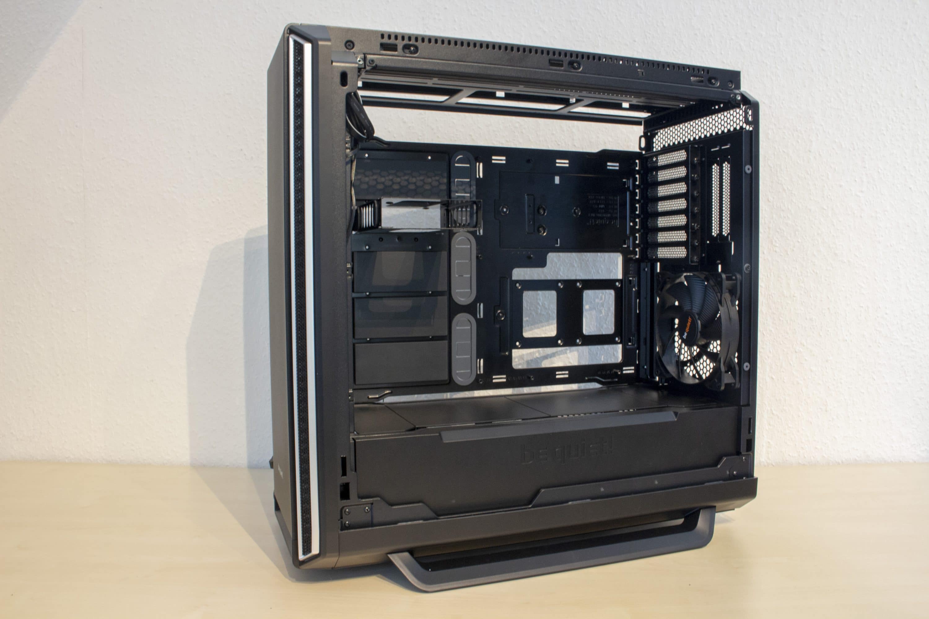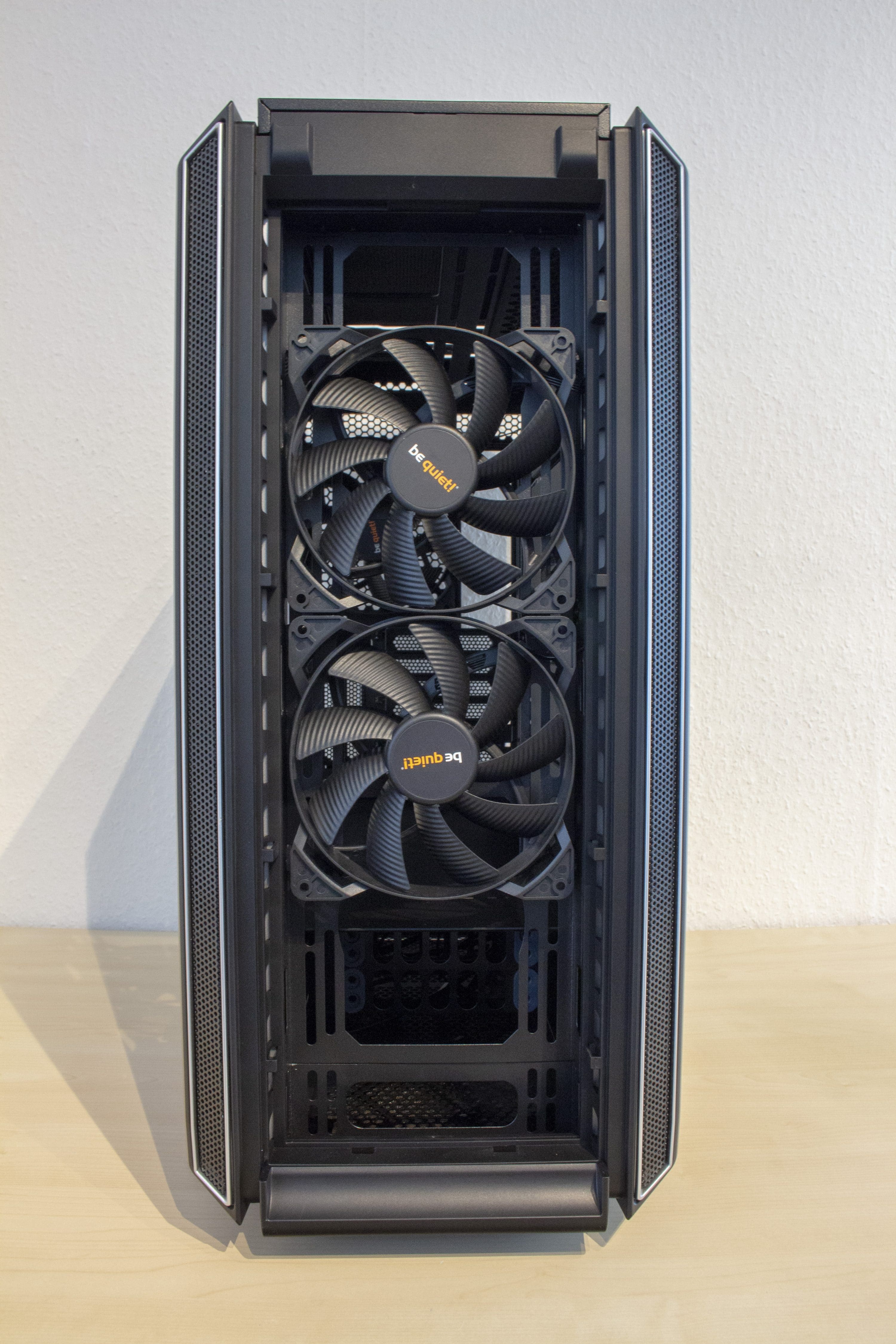 Das be quiet! Silent Base 801 gehört zwar offiziell in den Bereich der Midi-Tower mit sieben PCI-Slots, besitzt aber aufgrund der äußeren Abmessungen und einem Volumen von ca. 85 Litern einen deutlich größeren Fußabdruck als ein herkömmlicher Midi-Tower. Dafür passt aber auch sehr große Hardware in diese Gehäuse. Neben E-ATX-Mainboards kann der Käufer auch CPU-Kühler bis 185 mm, Grafikkarten bis 449 mm und Netzteile bis 288 mm verbauen. Damit die verbaute Hardware auch mit genügend Frischluft versorgt wird, hat be quiet! insgesamt drei Pure Wings 2 mit einer Rahmengröße von 140 mm vorinstalliert. Alle drei Lüfter sind an einer PWM-fähigen Steuerungsplatine für insgesamt sechs Lüfter angeschlossen.