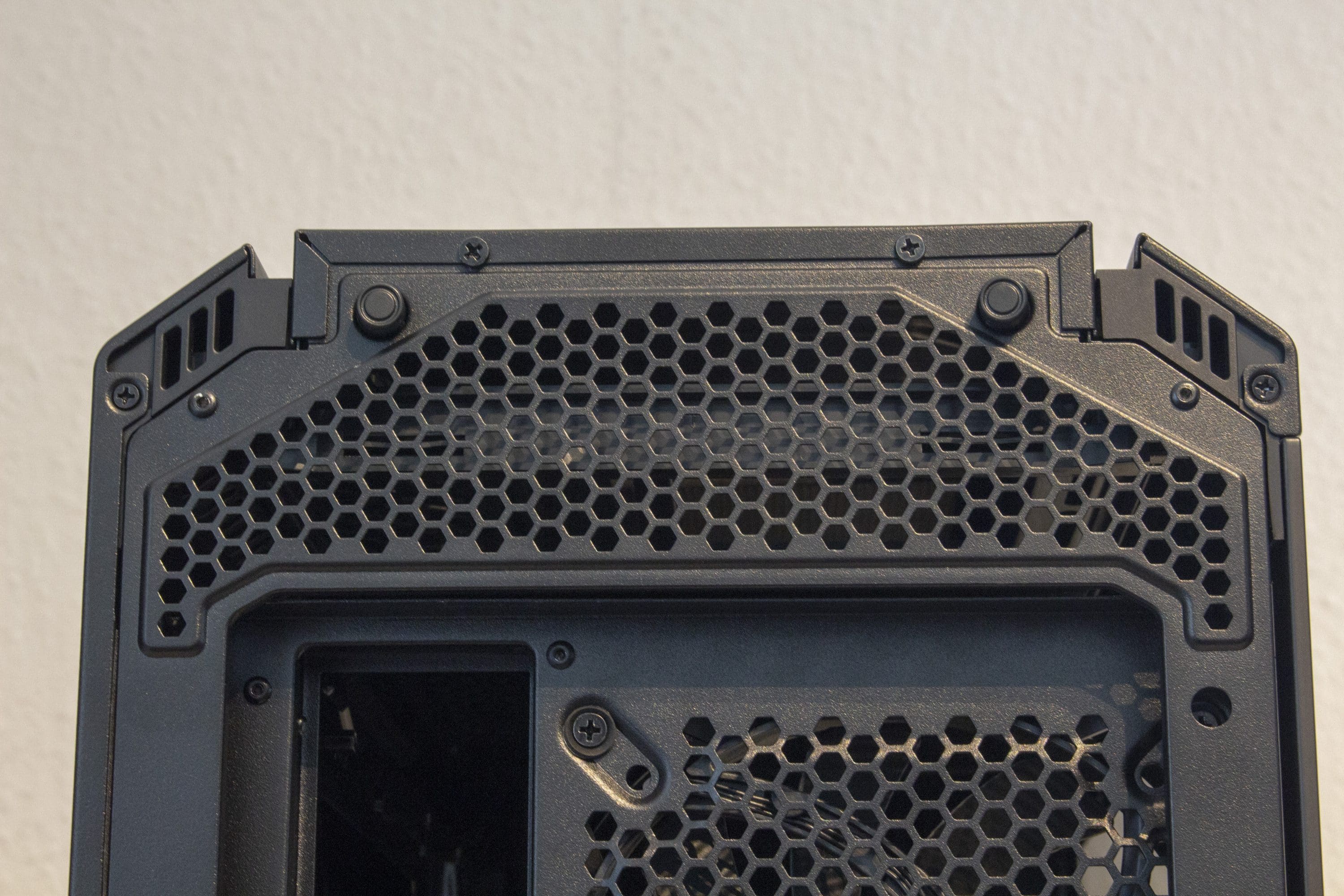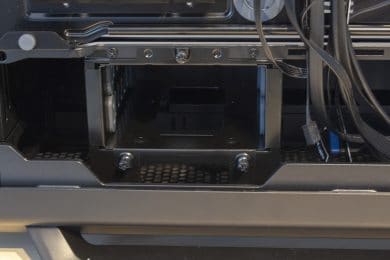 Für Käufer die eine Wasserkühlung im Silent Base 801 verbauen möchten, bietet das Gehäuse in der Front Platz für Radiatoren mit bis zu 420 mm Länge und im Deckel mit bis zu 360 mm. Da der Deckel fest angebracht ist hat be quiet! ein klevere Lösung zur Montage des Deckelradiators integriert. Nach dem Lösen von zwei Schrauben kann im oberen Bereich ein praktischer Montagerahmen herausgezogen werden. Nach fertiger Montage des Radiators wird der Rahmen einfach wieder zurückgeschoben und verschraubt. Etwas fraglich ist aber aufgrund der nur kleinen Deckelöffnungen ob ein großer Radiator hier effektiv genutzt werden kann. Dieses Thema werde ich im nächsten Kapitel näher beleuchten.