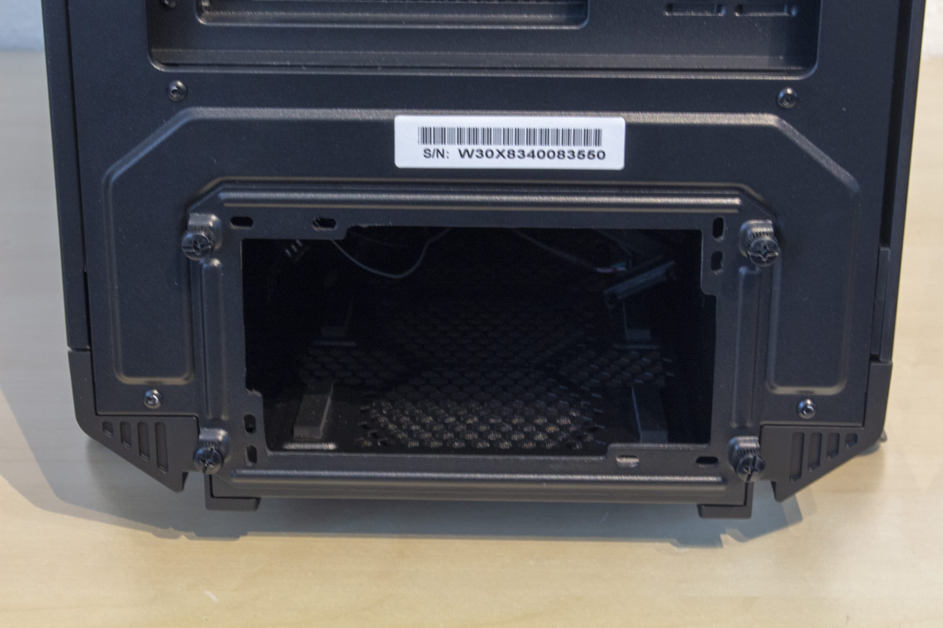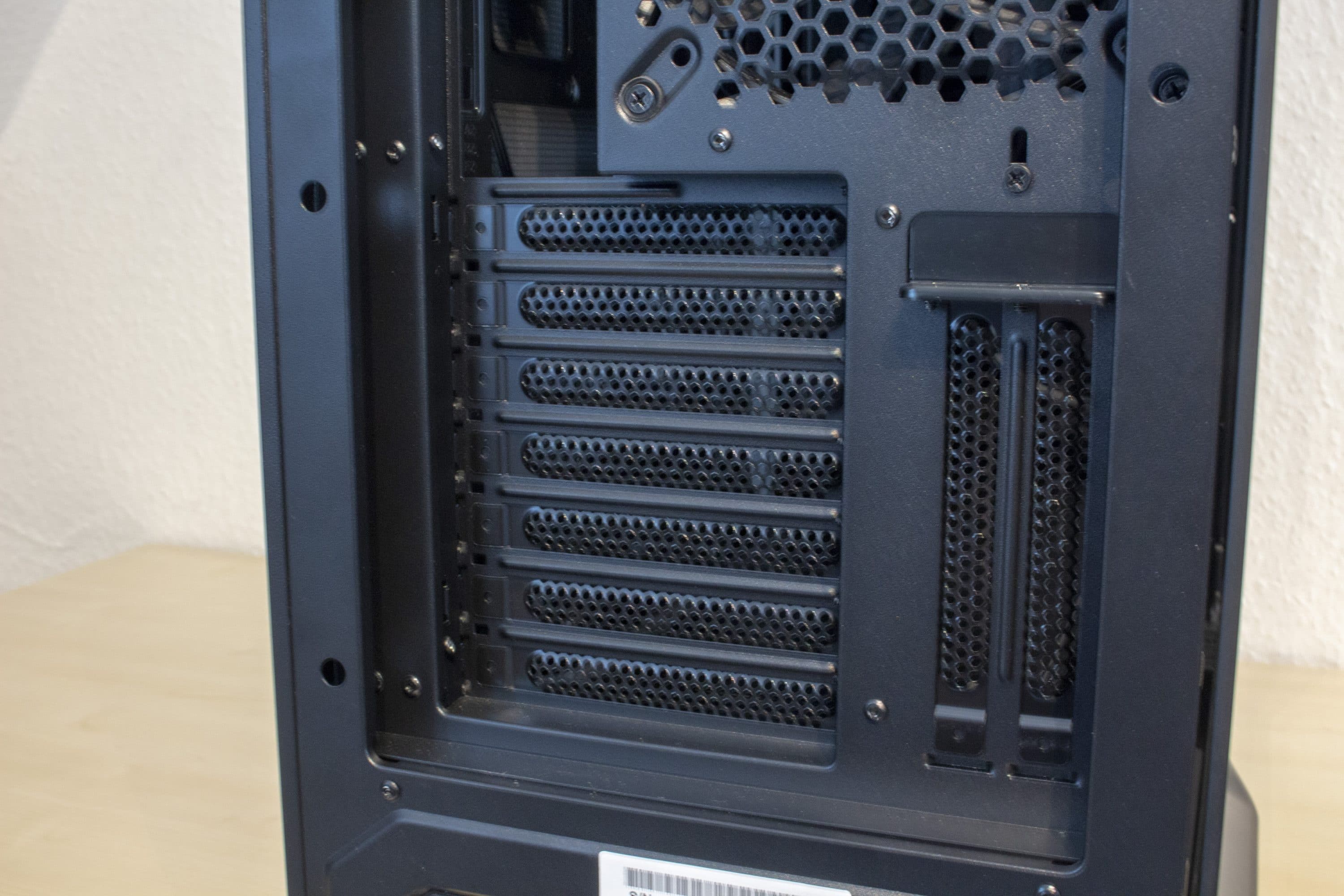 Das Heck bietet keine besonders großen Überraschungen. Das Netzteil wird im Boden an einem entkoppelten Halterahmen montiert. Darüber finden sich sieben horizontale und zwei vertikale PCI-Slotblenden. Zuletzt findet man hier noch den dritten vorinstallierten Pure Wing 2 Lüfter mit einer Rahmenbreite von 140 mm.