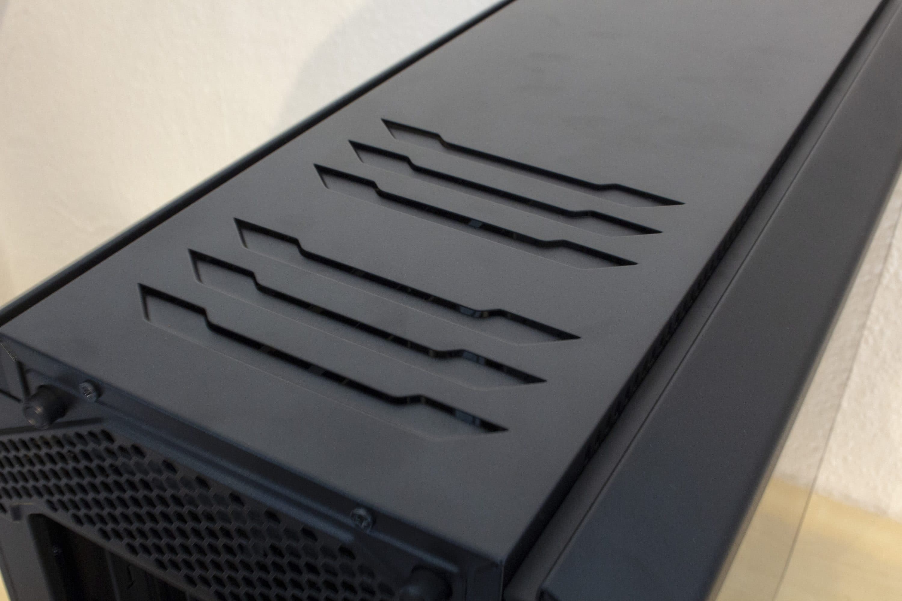 Auch im Deckel bleibt sich be quiet! dem bisherigen Design weitestgehend treu. Der Deckel ist mit Ausnahme von sechs Lüftungsschlitzen im hinteren Bereich komplett geschlossen. Aber auch diese Öffnungen wurden so designt, dass möglichst wenig Schall nach außen gelangen kann. Das I/O-Panel hat be quiet! im vorderen Bereich des Deckels angebracht. Vorhanden sind hier zwei USB 3.0-Anschlüsse, ein USB 2.0-Anschluss, Anschlüsse für Kopfhörer bzw. Mikrofon, ein 4-stufiger Regler für die integrierte Lüftersteuerung und zwei Taster für Power bzw. Reset.