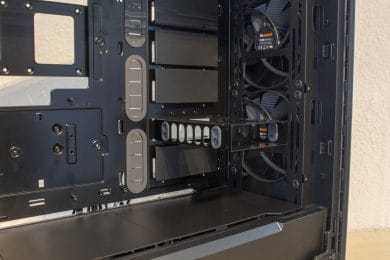 Das schlichte Design setzt sich auch im Inneren fort. Sämtliche Flächen sind schwarz bzw. sehr dunkel gehalten. Was sofort auffällt ist die sehr offene Raumgestaltung und der enorme Platz für Hardware. Wie auch im kleineren Bruder folgt be quiet! beim Silent Base 801 dem allgemeinen Trend und hat eine Netzteilabdeckung und Gummierungen für die Kabelöffnungen implementiert. Insgesamt ist das Kabelmanagementsystem sehr durchdacht und bietet sehr viel Platz zum Verlegen der Kabel.