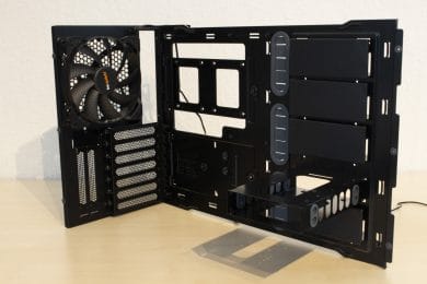 Die Verkabelung des Systems war ebenfalls schnell abgeschlossen. Durch die Netzteilabdeckung und die gut platzierten und gummierten Kabelöffnungen sieht das System sehr ordentlich aus. Zusätzlich tragen die 35mm Platz hinter dem Mainboardschlitten zu diesem Ergebnis bei. Selbst wenn die Kabel des Netzteils übereinander liegen lässt sich das Seitenteil einfach schließen.