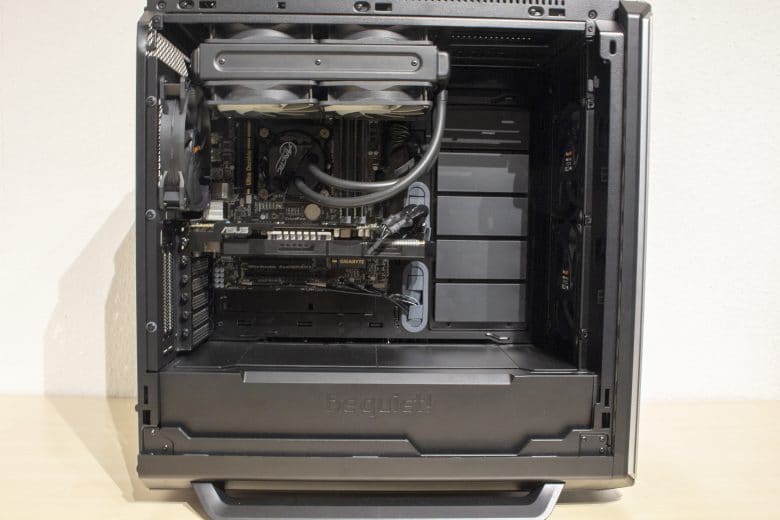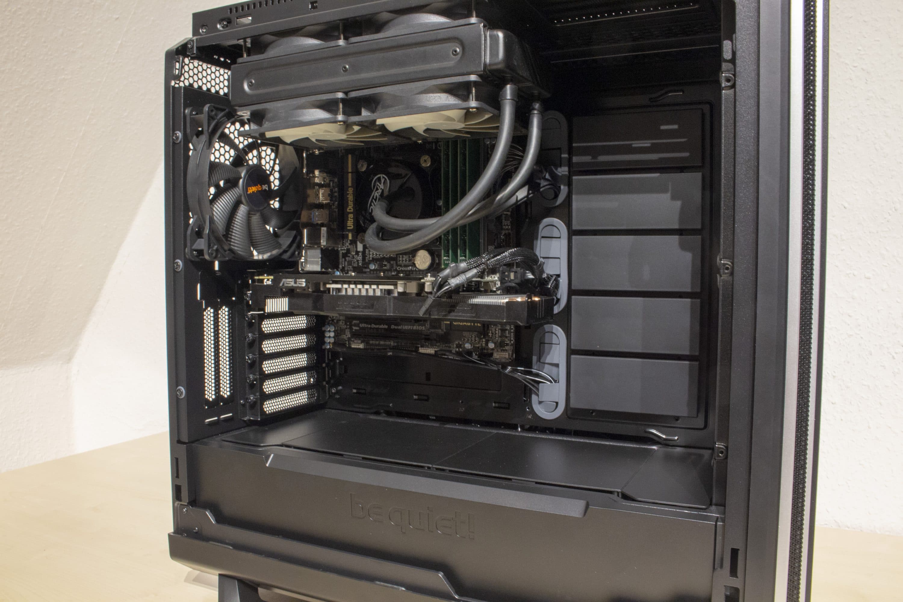 Nun kommen wir zum Systemeinbau. Als Hardware verwende ich einen Intel Xeon 1230v3 auf einem Gigabyte H87M-D3H mit 16 GB RAM. Der Xeon wird durch eine Arctic Freezer 240 All-in-One-Wassekühlung in einer Push-Pull-Konfiguration gekühlt. Für die Bildausgabe ist eine HD 7850 2GB von Asus zuständig. Damit das ganze System überhaupt an geht, wird es durch das nichtmodulare be quiet! Pure Power 10 400W* mit Strom versorgt.