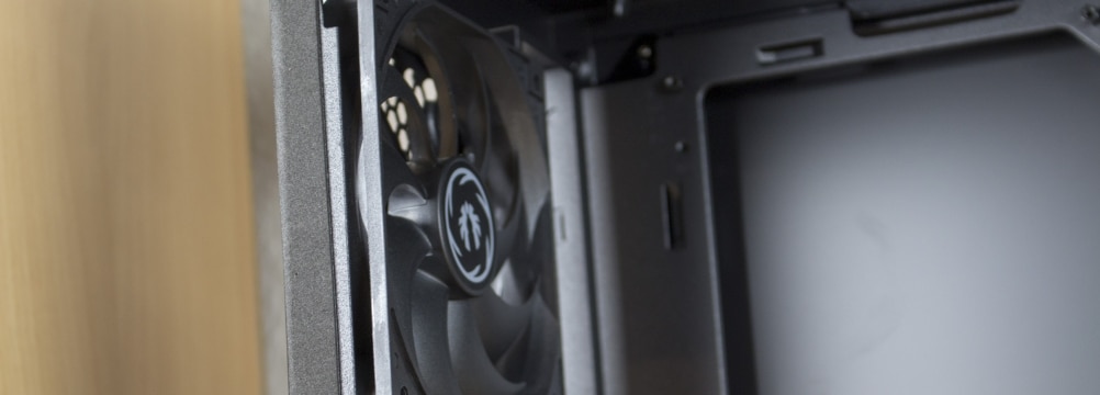 Im Vergleich mit ähnlichen Geräten fällt auf, dass nur ein einziger 120-mm-Lüfter über dem Netzteil vorinstalliert ist. Darüber hinaus kann dieser nicht durch ein größeres Modell ersetzt werden. Der Einbau von 140-mm-Lüftern ist wie bereits erwähnt jedoch in der Front und im Deckel möglich.