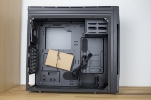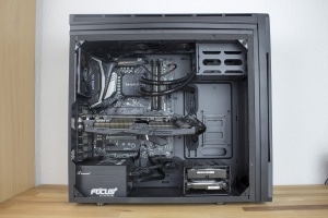 Positiv herauszuheben ist die Möglichkeit des Einbaus einer Wasserkühlung. Dadurch kann man ein deutlich aufgeräumteres System bauen, was auch dem Blick durch das Glas-Seitenpanel zu Gute kommt.