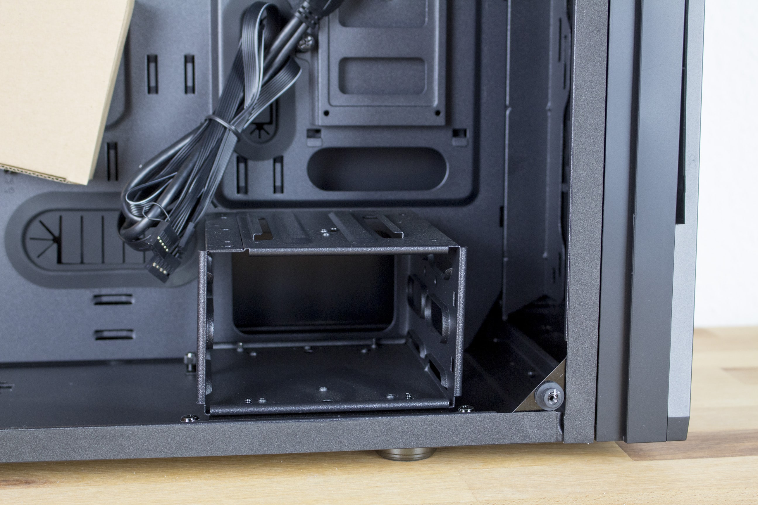 Sowohl oben als auch unten in der Front finden sich 3,5-Zoll-Käfige, die bei Bedarf leicht abmontiert werden können. Eine 2,5-Zoll-SSD-Halterung mit RGB-Beleuchtung ist ebenfalls vorhanden. Diese kann sowohl ans Mainboard angeschlossen als auch mit dem im Gehäuse verbauten Controller sowie den Beleuchtungsbutton im I/O-Panel gesteuert werden.