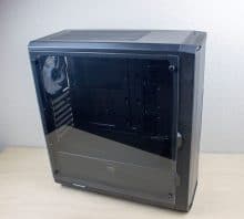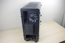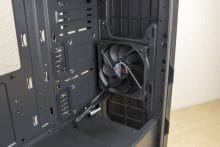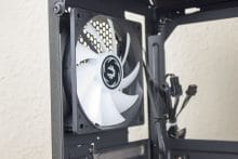 Der Festplattenkäfig sowie der Netzteilbereich sind vom Hardwarebereich komplett getrennt, sodass an das Gehäuse viele Anforderungen gestellt werden können. Für einen guten Airflow können insgesamt fünf Lüfter verbaut werden, wovon zwei bereits vorinstalliert sind. Neben den beiden 120-mm-Lüftern an der Vorder- und Rückseite können noch zwei Lüfter im Deckel und ein weiterer in der Front verbaut werden. Das Gehäuse eignet sich aber genauso für einen großen 280-mm-Radiator, der in der Front montiert wird. Weiterhin ist es möglich zwei 3,5- oder 2,5-Zoll-Festplatten im Festplattenkäfig und drei 2,5-Zoll-SSDs auf der Backplate zu montieren.