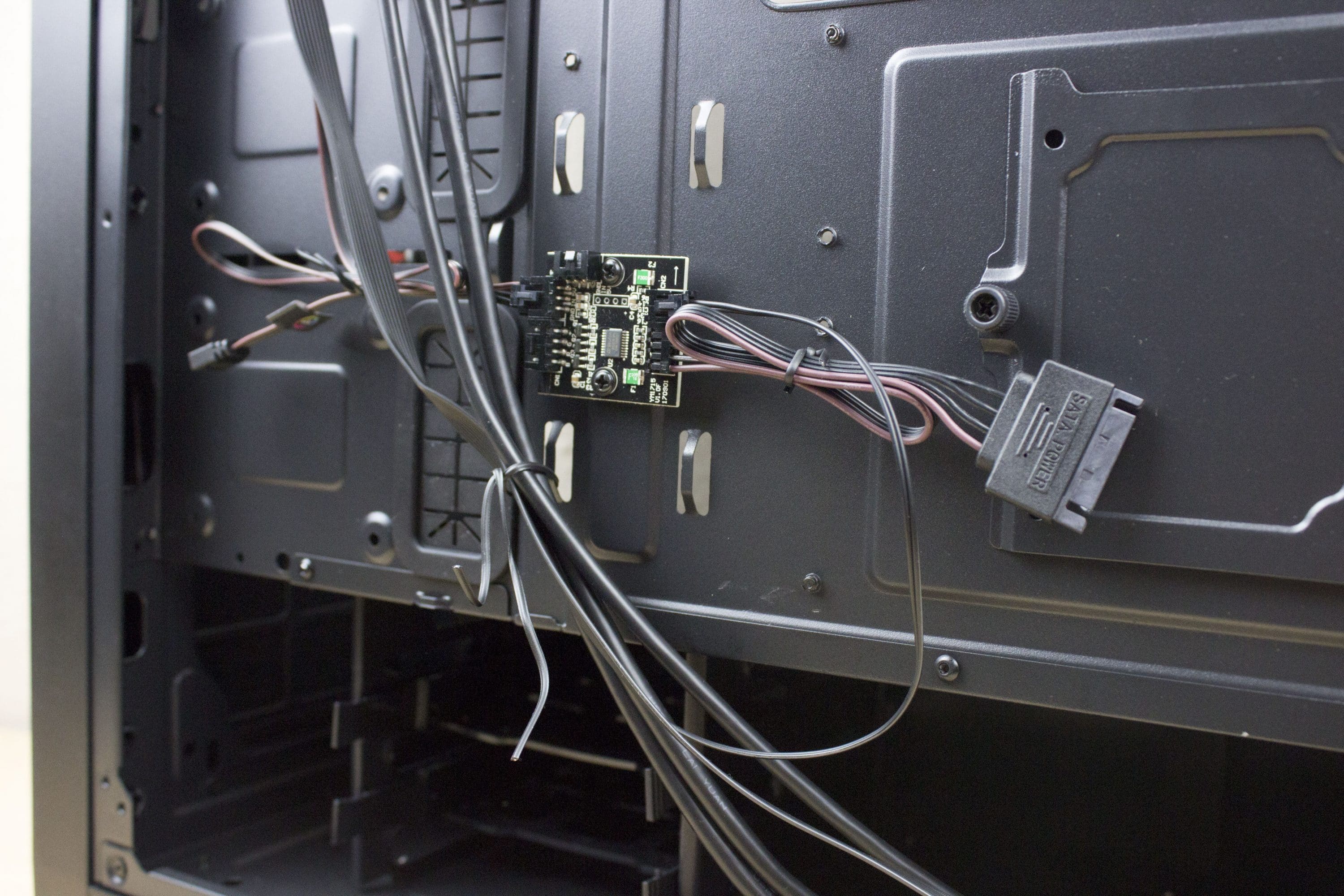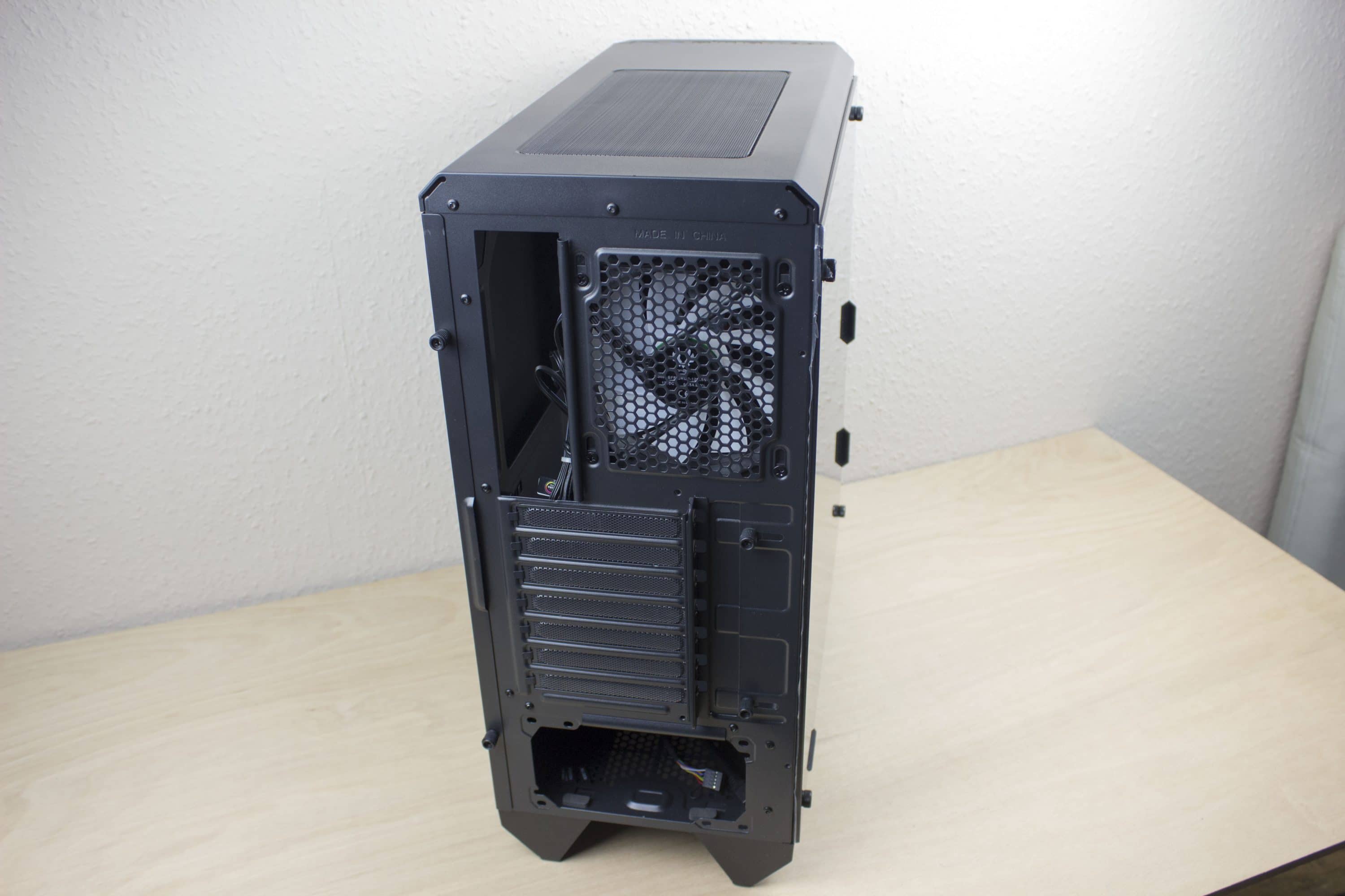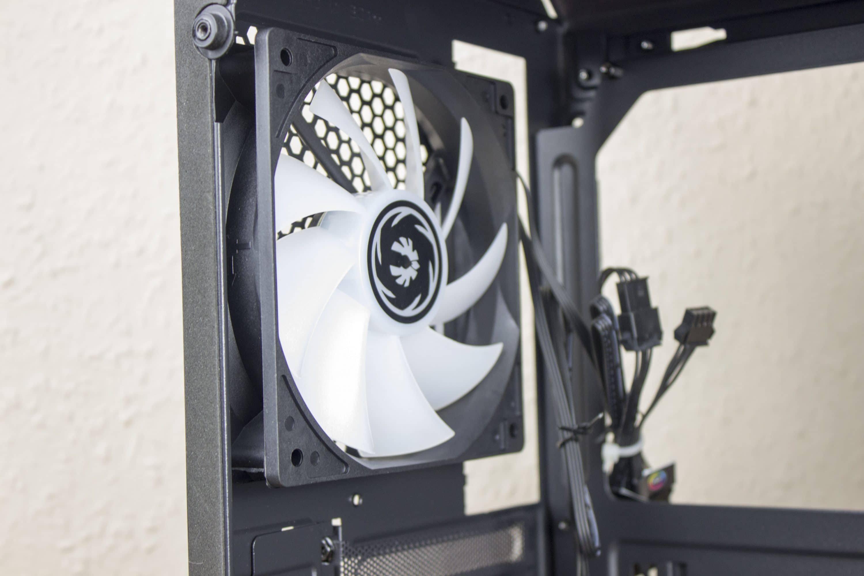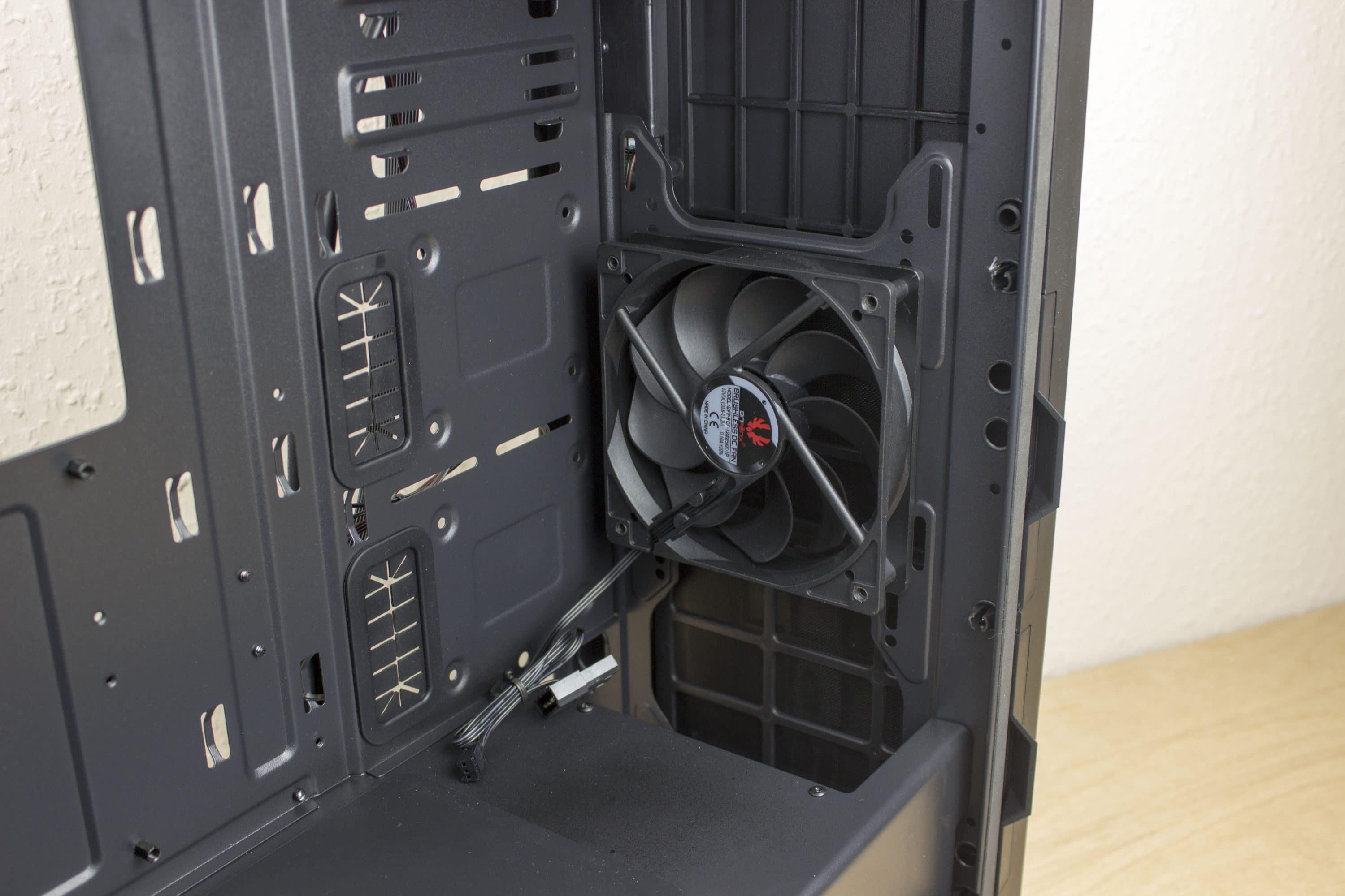 Im hinteren Bereich wird selbstverständlich das Mainboard montiert. Außerdem finden wir dort einen vorinstallierten 120-mm-Lüfter, direkt darunter sind die PCI-Slotblenden. Der Lüfter wird per 3-Pin-Anschluss mit dem Mainboard verbunden. Direkt hinter dem Mainboard lässt sich das dritte 2,5-Zoll-Laufwerk anbringen.