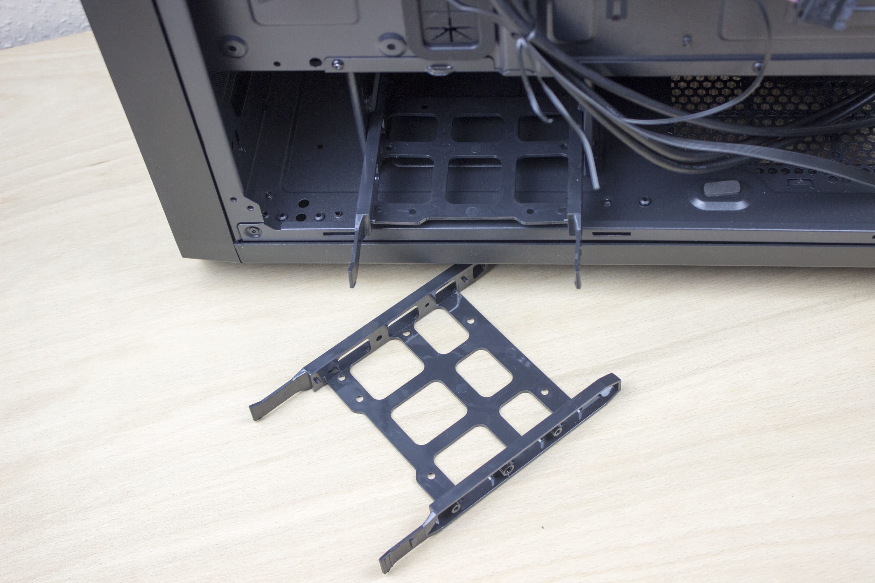 Der Bereich für das Netzteil und den Festplattenkäfig ist komplett vom Rest abgeschlossen und zieht sich komplett bis zur Front durch. Die Halterung für die Festplatten können einfach herausgezogen werden, sie werden nur durch einen Klipp gehalten. Ein umständliches Abmontieren der Halterung entfällt und es müssen nur die Festplatten abmontiert werden.