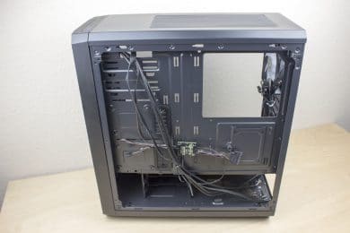 Der Innenraum ist gut strukturiert und ein ordentliches Kabelmanagement ist durchaus möglich. Eine Kabelführung auf der Rückseite als Ergänzung zu den Kabelhalterungen wäre wünschenswert. Außerdem ist der Staubfilter für das Netzteil nicht gut verarbeitet. Ansonsten gibt es nichts am Gehäuse auszusetzen.