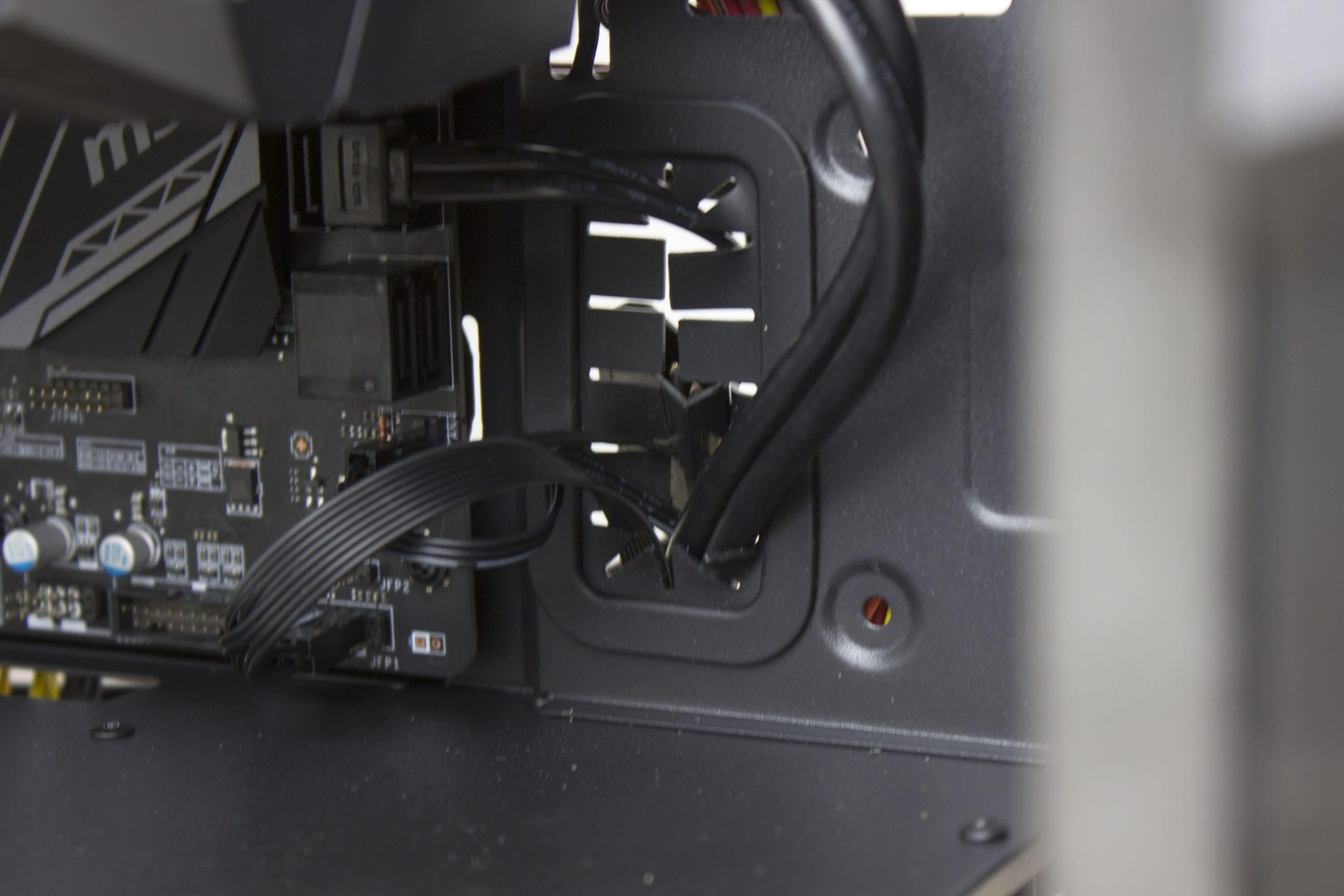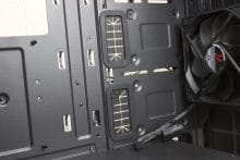 Für ein optimales Kabelmanagement befinden sich rund um das Mainboard-Tray Öffnungen, die durch Gummi geschützt sind. Direkt an den beiden Öffnungen sitzen auch die Montageplätze für die 2,5-Zoll-Laufwerke, es wurde also mitgedacht. Schmerzlich wird aber eine Führung für die Kabel auf der Rückseite vermisst. Ja, wenn alle Kabel ordentlich verlegt werden und das Seitenteil wieder angebracht wurde, sind die Kabel auch nicht zu sehen. Eine Führung als Ergänzung zu den Kabelhalterungen für noch besseres Kabelmanagement hätten wir uns bei dem Preis aber gewünscht.
