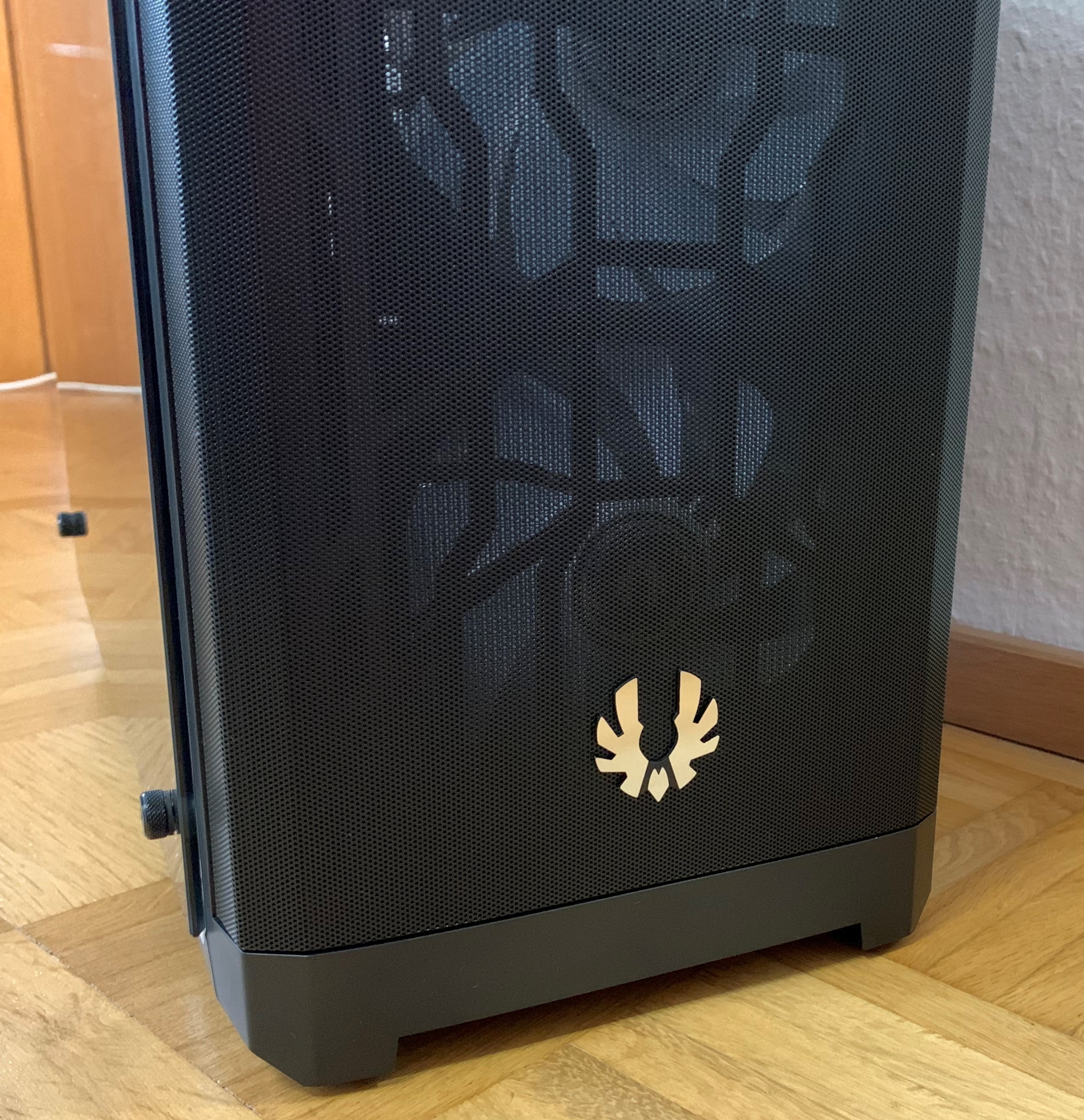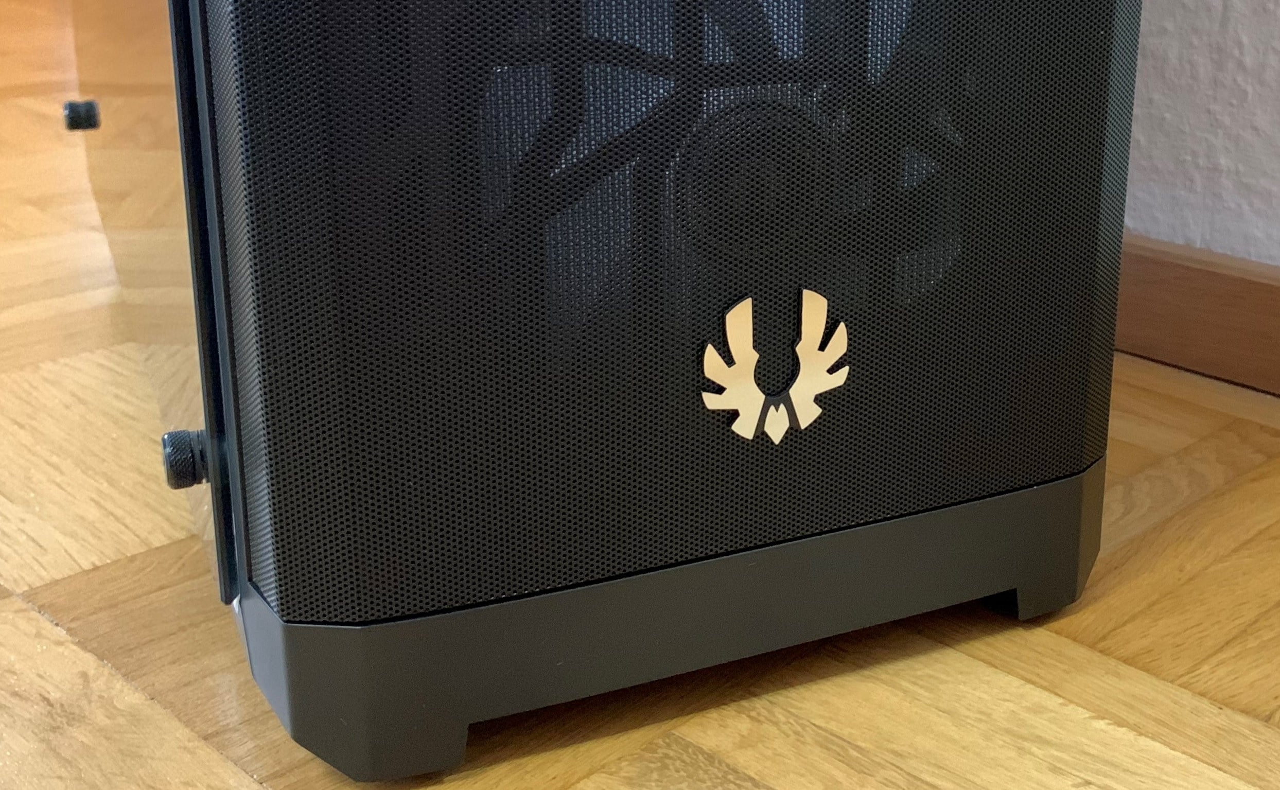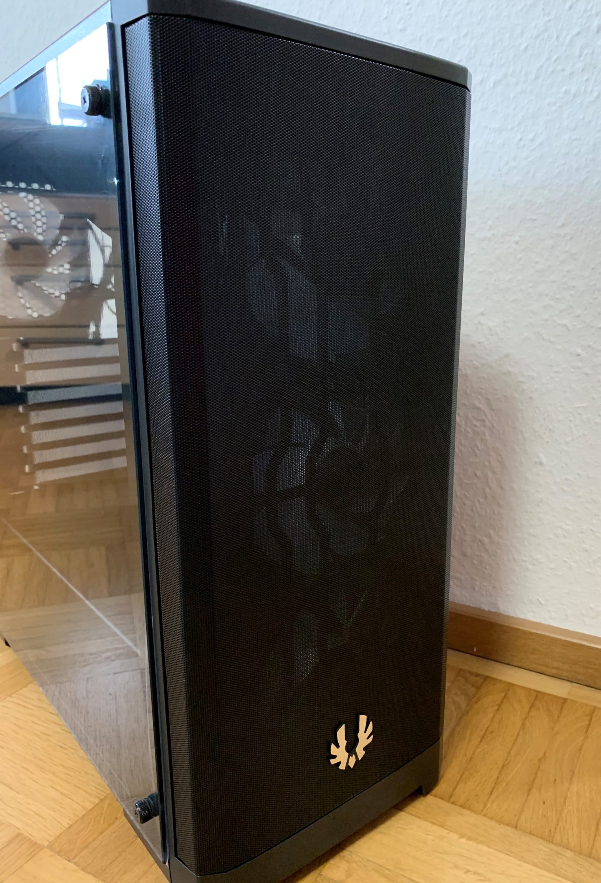 Das Gehäuse besteht hauptsächlich aus Stahl, Plastik und Glas. Die Verarbeitung ist für ein Gehäuse aus dieser Preisklasse sehr gut. Große Spaltmaßen, Fehler in Materialien oder scharfe Kanten sind bei unserem Gehäuse nicht zu entdecken. Optisch auffällig sind das abnehmbare linke Seitenteil aus Glas und das Logo an der Meshfront.