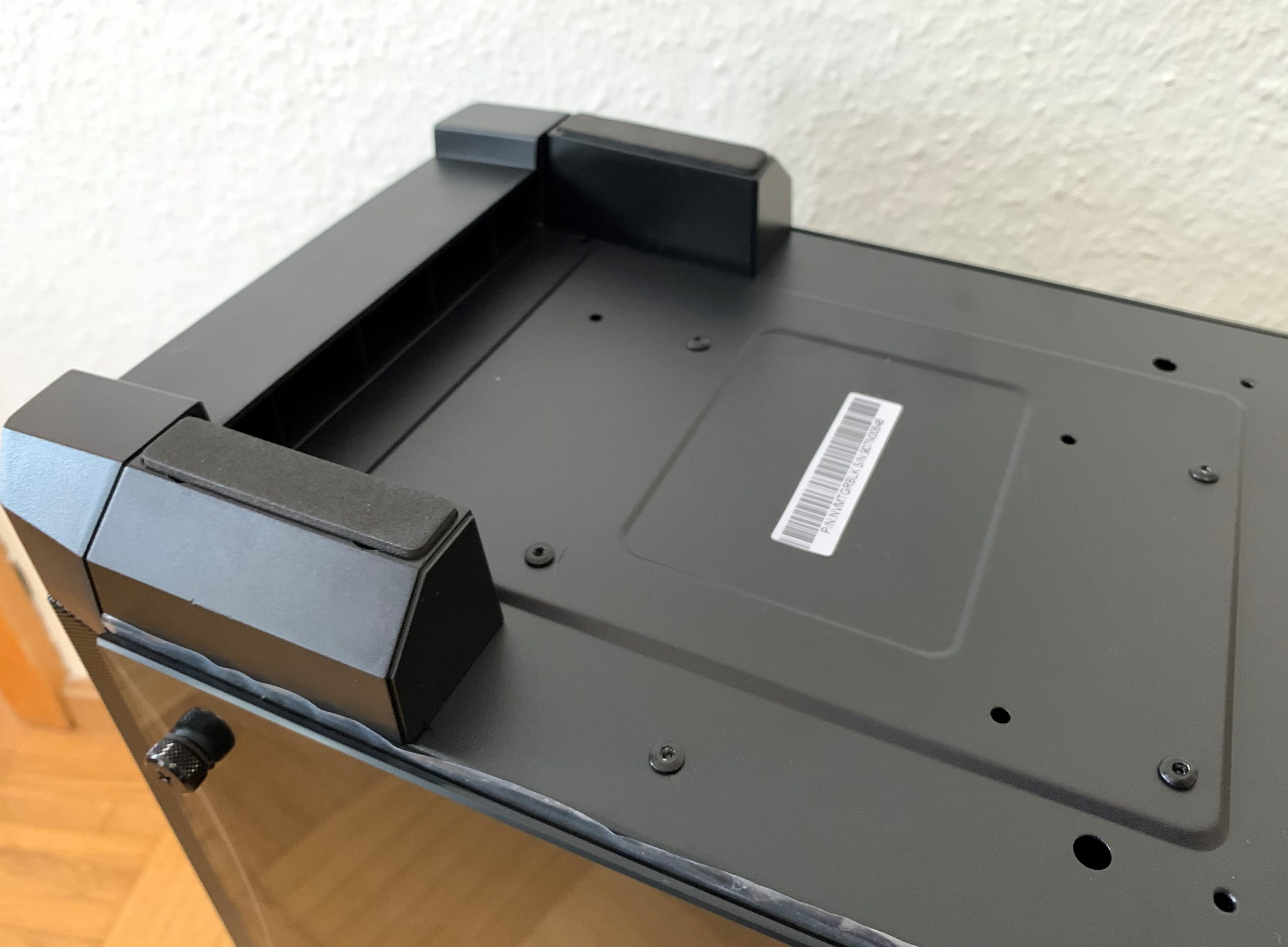 Die Unterseite des Gehäuse offenbart eine magnetische Abdeckung für das Netzteil, welche entfernt werden kann. Die Standfüße sind gummiert und halten das Gehäuse rutschfest an Ort und Stelle.