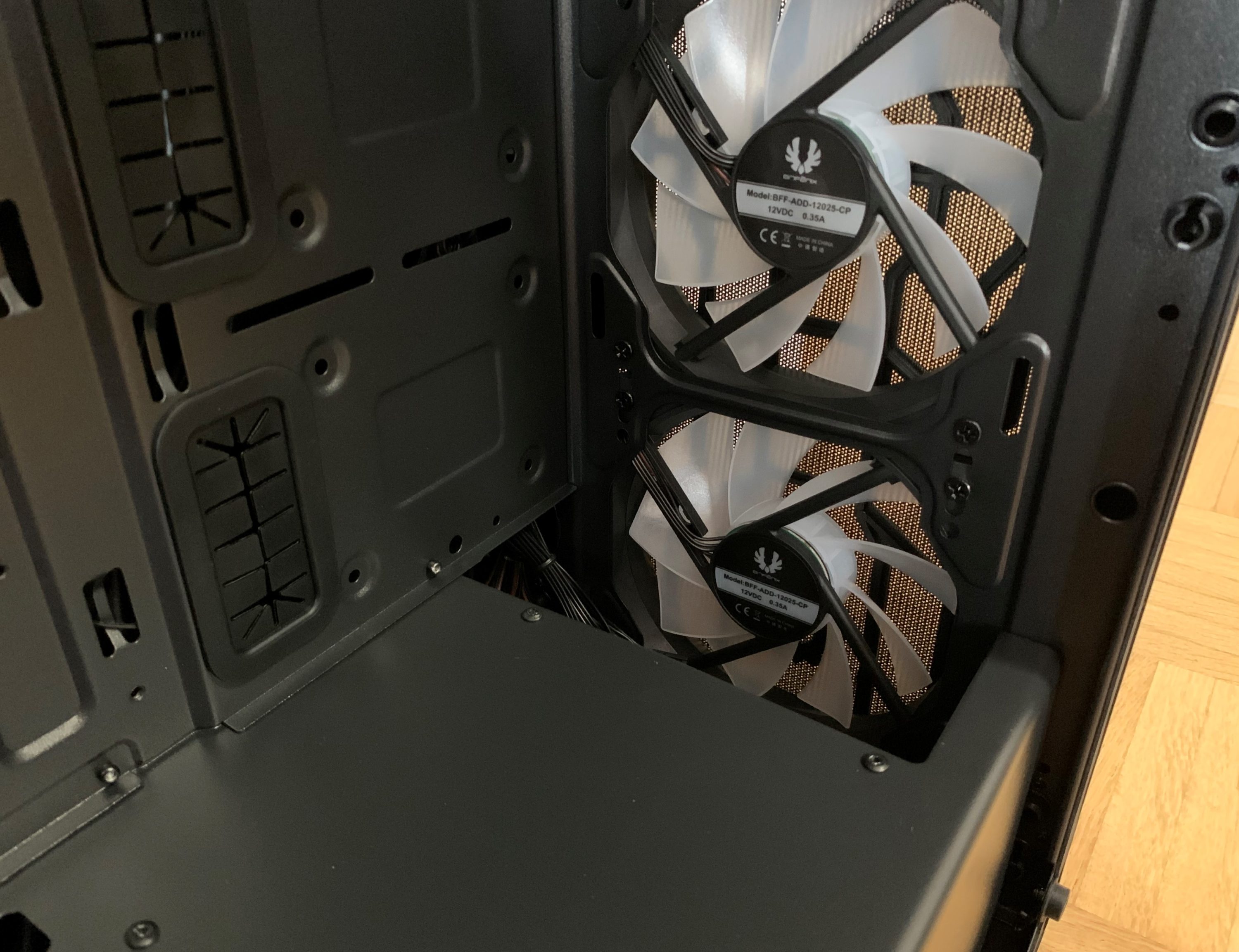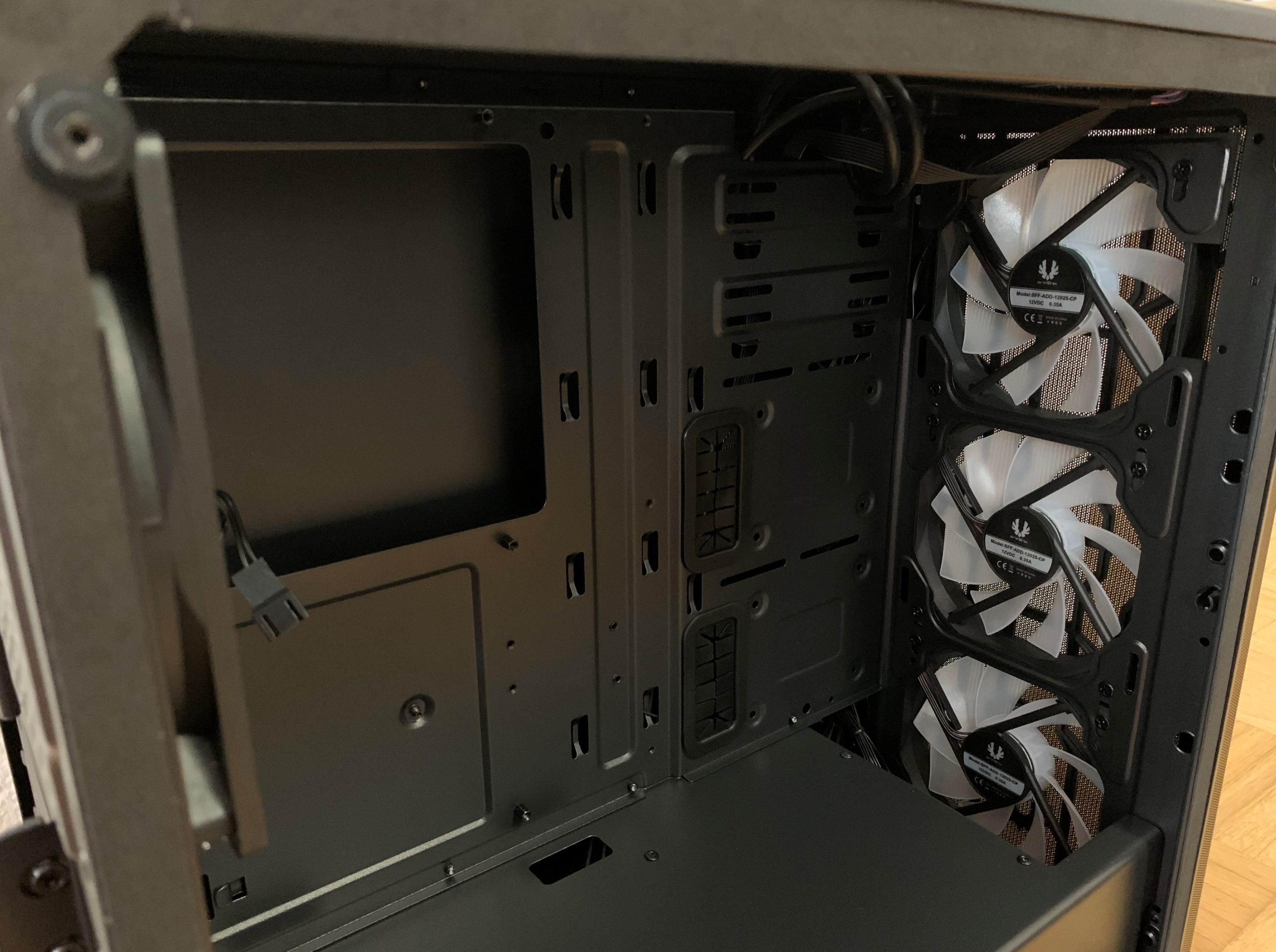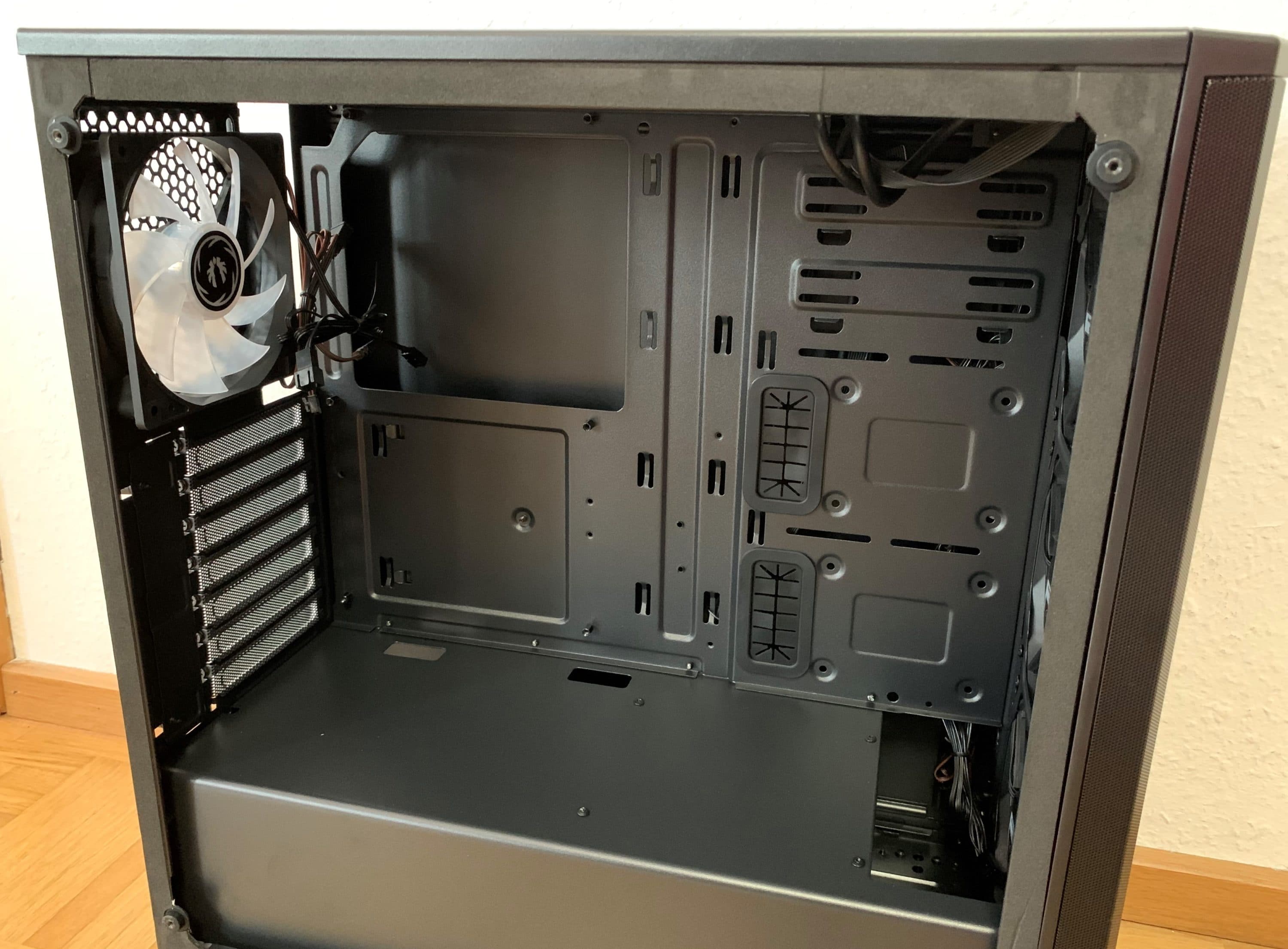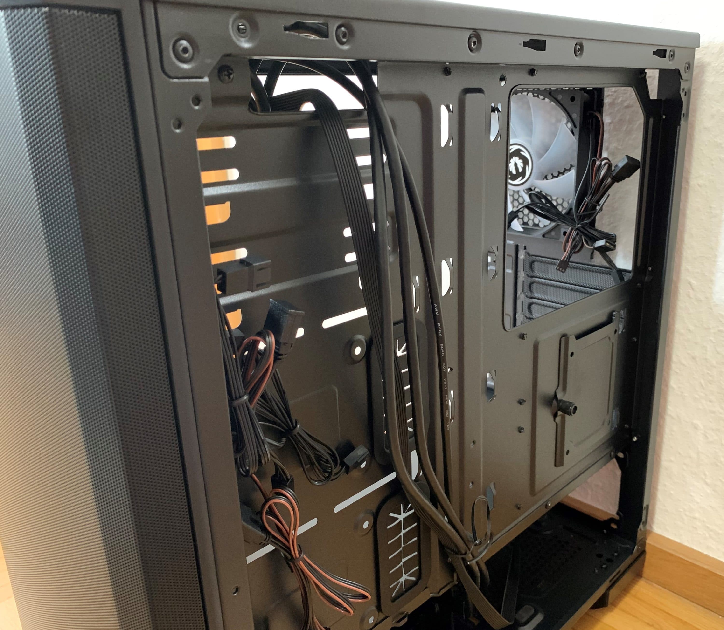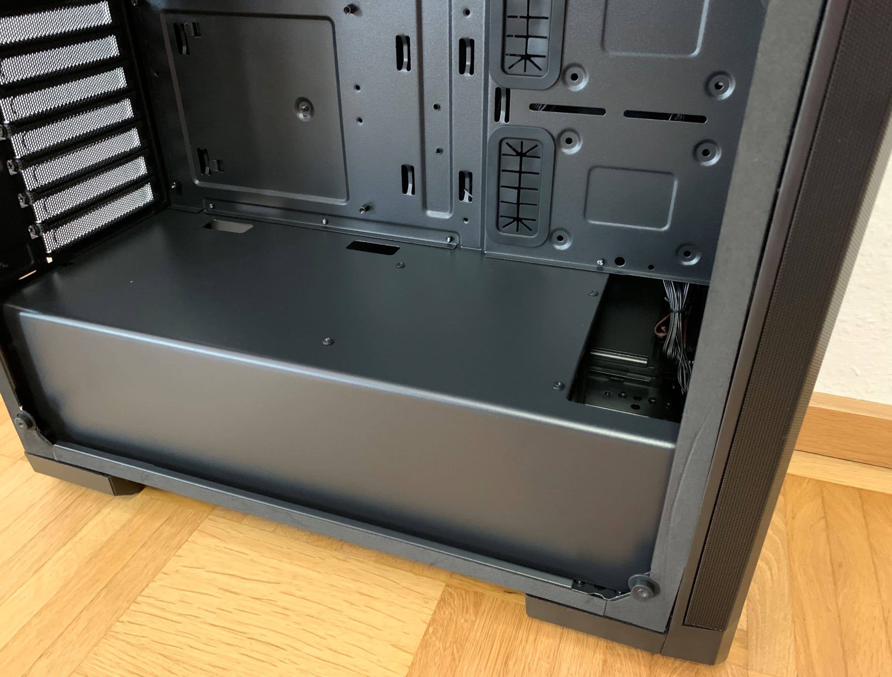 Abschließend hinterlässt der Innenraum einen guten Eindruck. Durch die Raumtrennung ist das Potenzial vorhanden, die Verkabelung des Gehäuses von außen optisch aufgeräumt vorzunehmen. Aufgrund der Menge an Kabeln – alleine durch die RGB-Lüfter – ist dies aber auch fast notwendig.