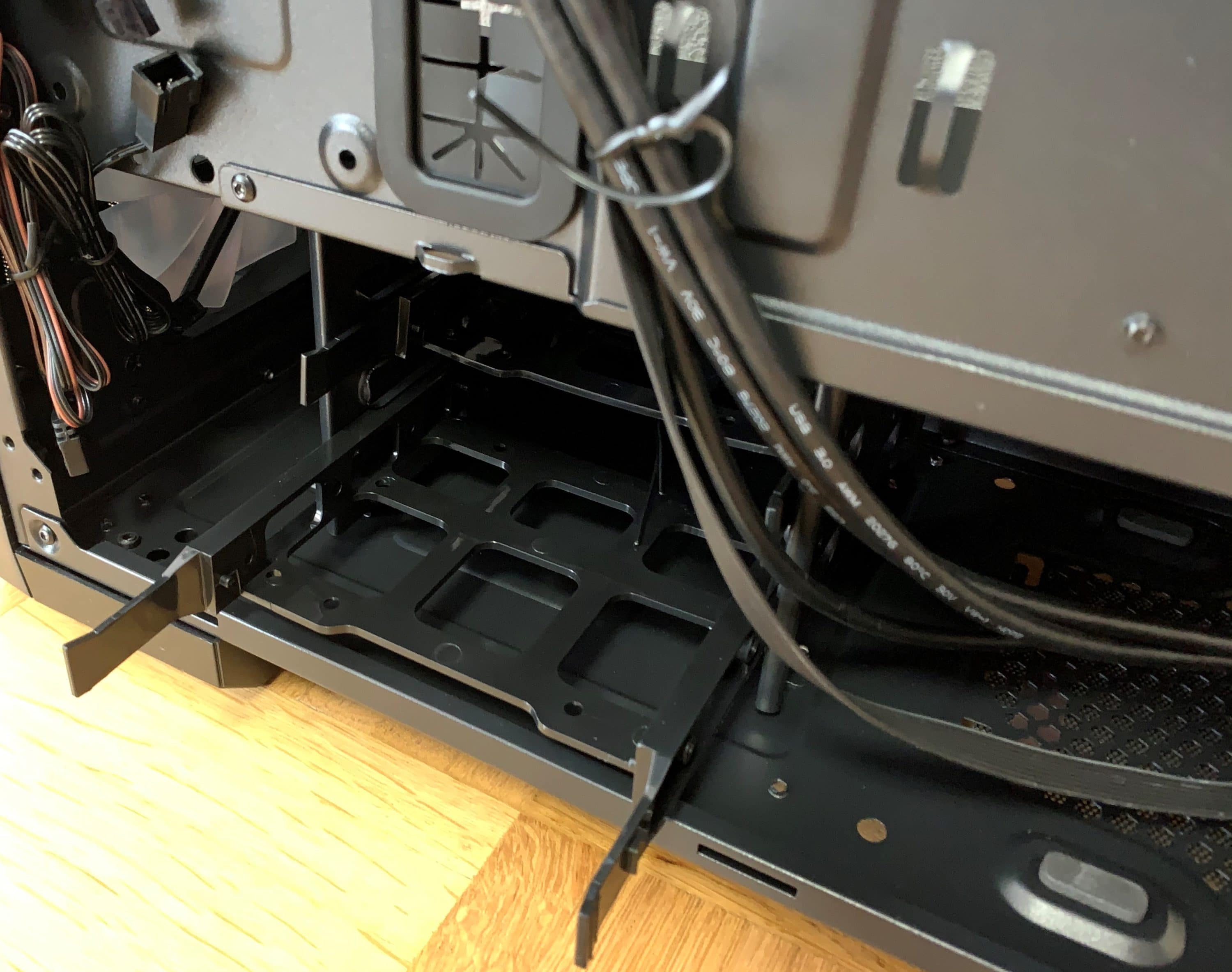Im unteren Bereich können im nicht entfernbaren Festplattenkäfig zwei 3,5-Zoll-HDDs montiert werden. Eine richtige Entkopplung findet jedoch nicht statt. Darüber besteht noch Platz für drei 2,5-Zoll-Laufwerke. Des Weiteren sind viele Möglichkeiten gegeben, Kabel per Kabelbinder zu befestigen.