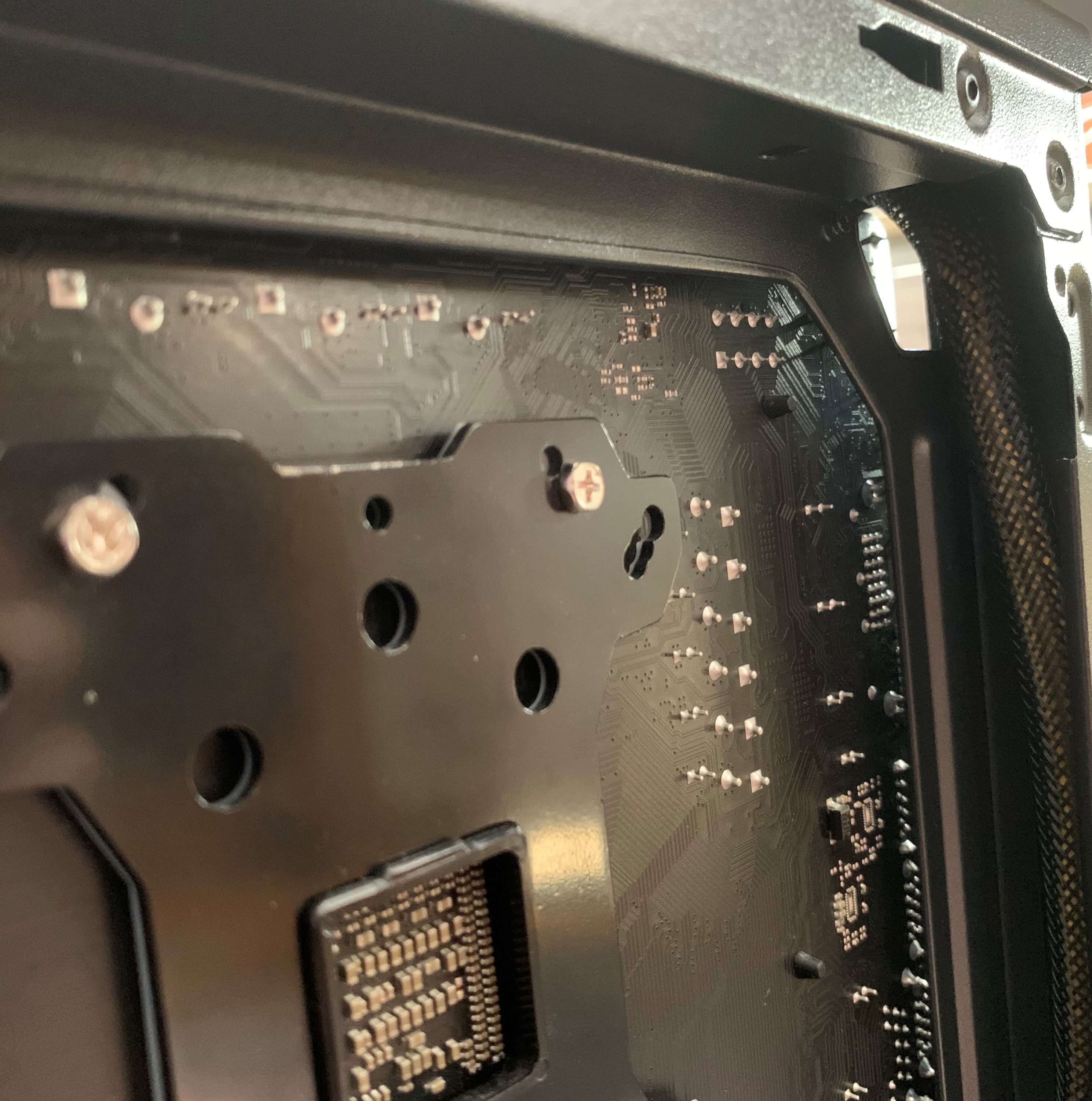 Wenden wir unseren Blick nach unten und hinten, sind weitere Auswirkungen des kompakten Gehäuses zu entdecken: Das Mainboard schließt bündig mit dem Raumtrennung ab. Auch hier ist der Platz für die anschließende Montage zwar ausreichend, aber nicht üppig.