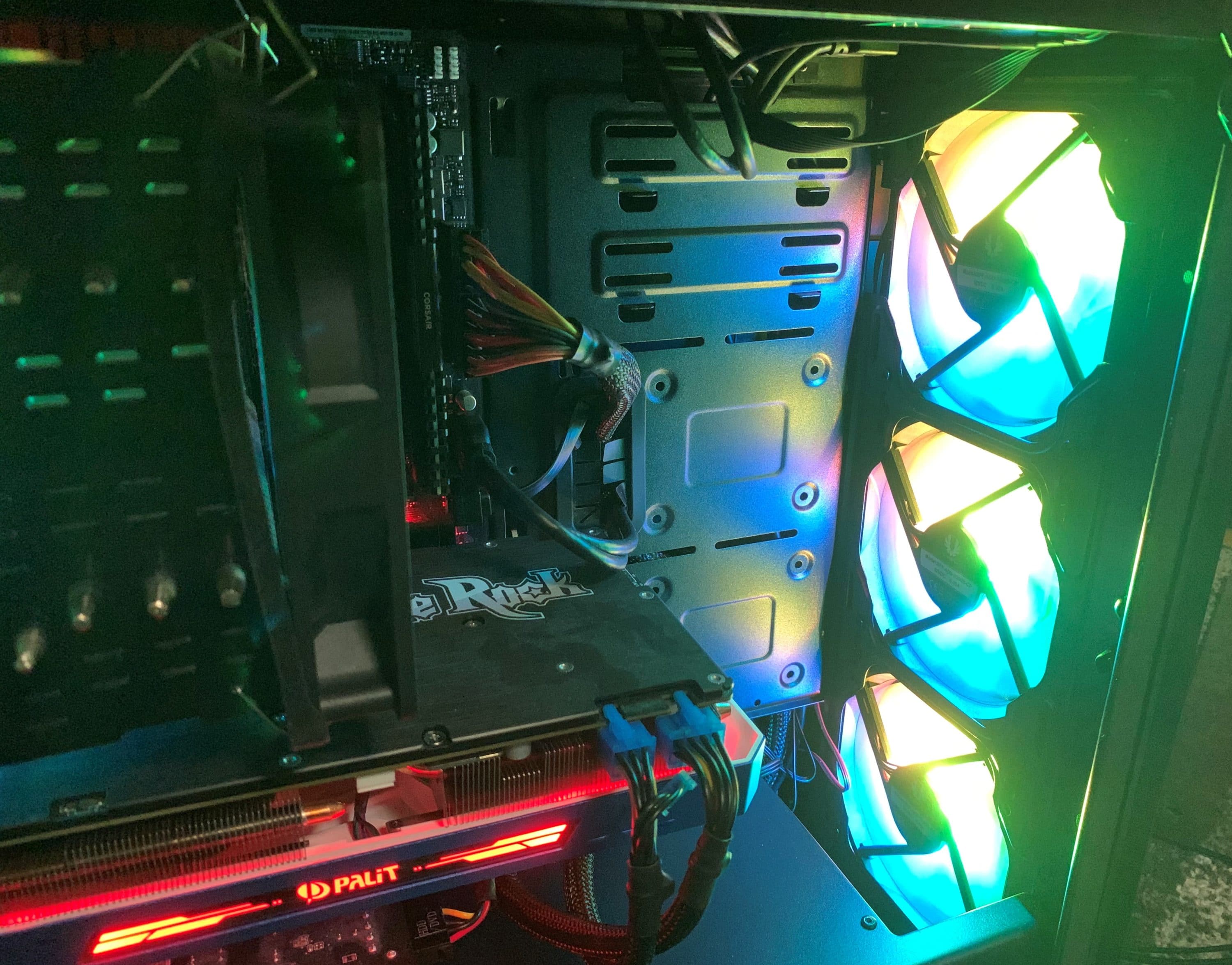 Das Gehäuse verfügt über vier komplett steuerbare RGB-Lüfter. Aufgrund der Nutzung von zwei verschiedenen Kabeln pro Lüfter – eines für die RGB-Beleuchtung und eines für die Steuerung des Lüfters – kann sowohl ein extrem leiser, als auch bunter Betrieb des Gehäuses garantiert werden. Da Bitfenix keine Steuerung der RGB-Elemente in ihrem Gehäuse vornimmt, muss diese durch das Mainboard oder andere Hardware durchgeführt werden. Da das verbaute Mainboard inkompatibel zum 3-Pin-RGB-Anschluss der Lüfter ist, erfolgt die Steuerung in unserem Fall über einen separaten Controller.