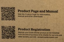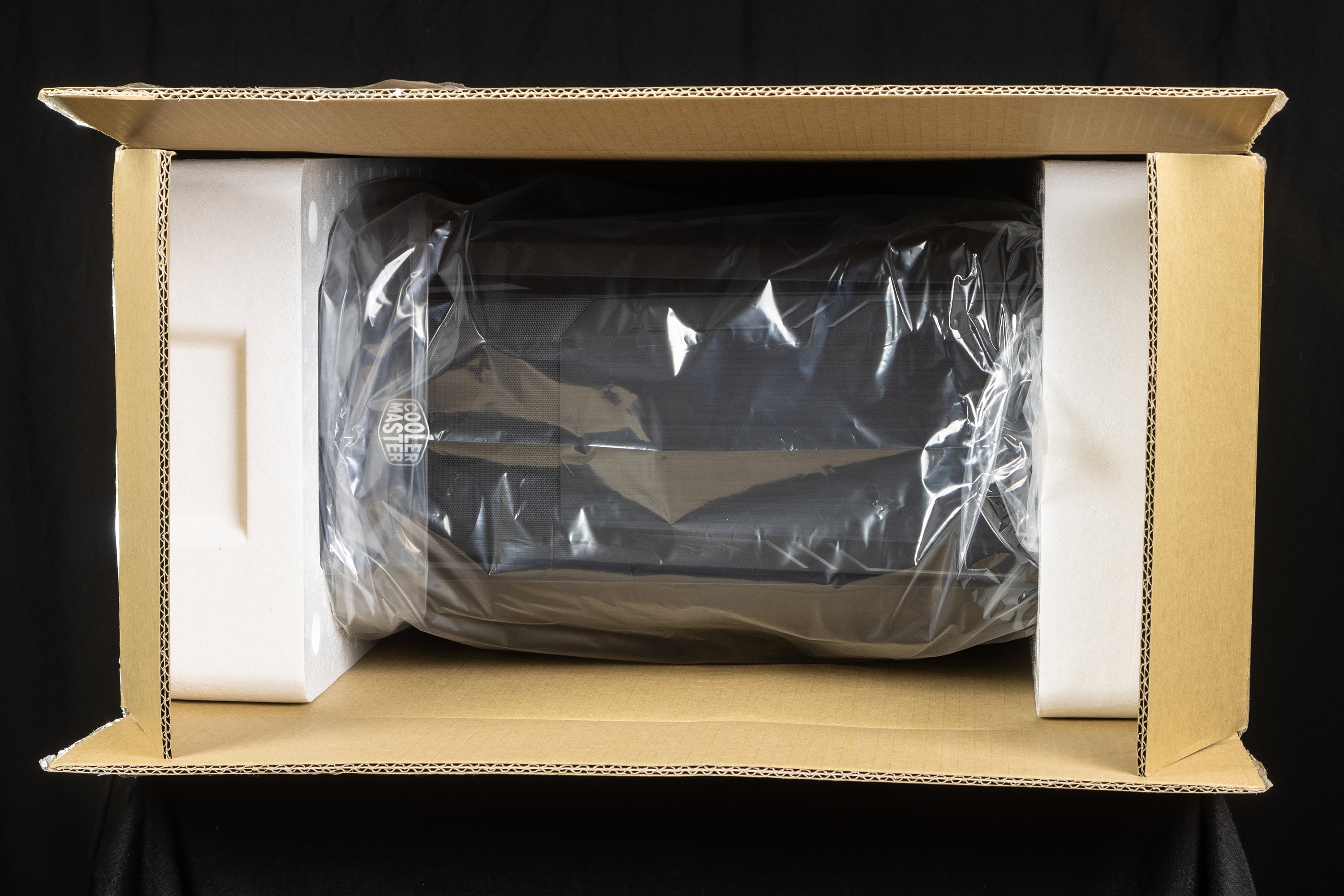 Die Verpackung des Cooler Master MasterBox 500 ist denkbar simpel gehalten: In einer braunen Box wird das Gehäuse geliefert, das in der Box von zwei Styropor-Teilen gehalten wird. Als Zubehör wird nur eine kleine Tüte mit Schrauben und ein paar einfach verwendbaren Kabelbindern geliefert, zusammengebunden mit den Frontpanel-Kabeln im Gehäuse. Neben den Schrauben gibt es auch ein Werkzeug, um die Mainboard-Abstandshalter mithilfe eines Schraubendrehers herausschrauben zu können. Diese sind werksseitig in ATX-Anordnung bereits ins Gehäuse geschraubt und können mit dem Werkzeug bei Bedarf anders platziert oder entfernt werden. Eine Anleitung in Papierform ist nicht im Lieferumfang – ein QR-Code auf der Außenseite der Box leitet weiter auf die Cooler-Master-Webseite mit der Anleitung.